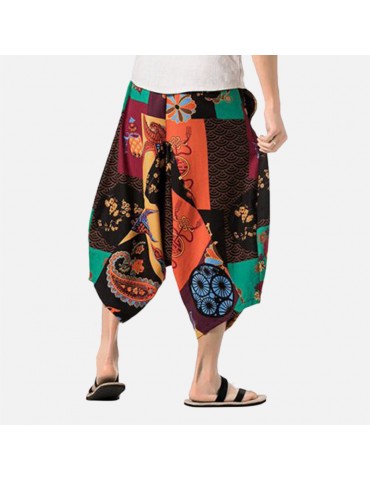 Vintage Mens Cotton Linen Harem Pants Hip Hop Baggy Wide Leg Pants Streetwear Printed Boho Trousers