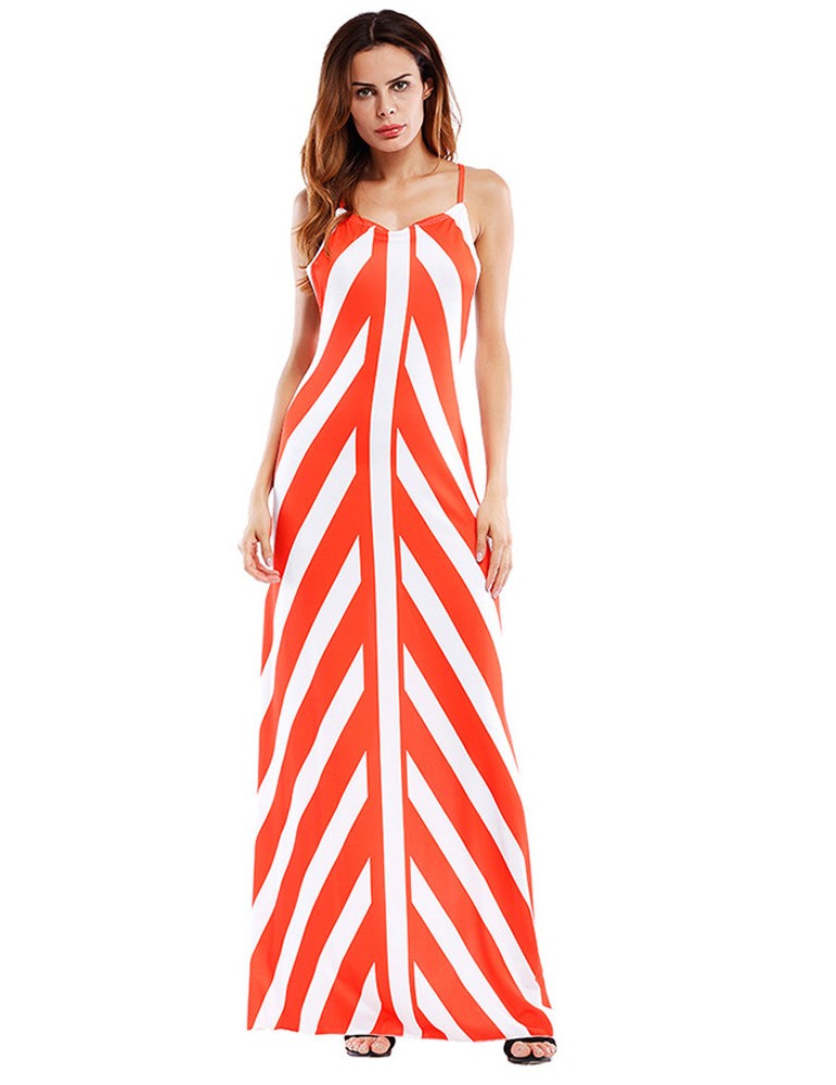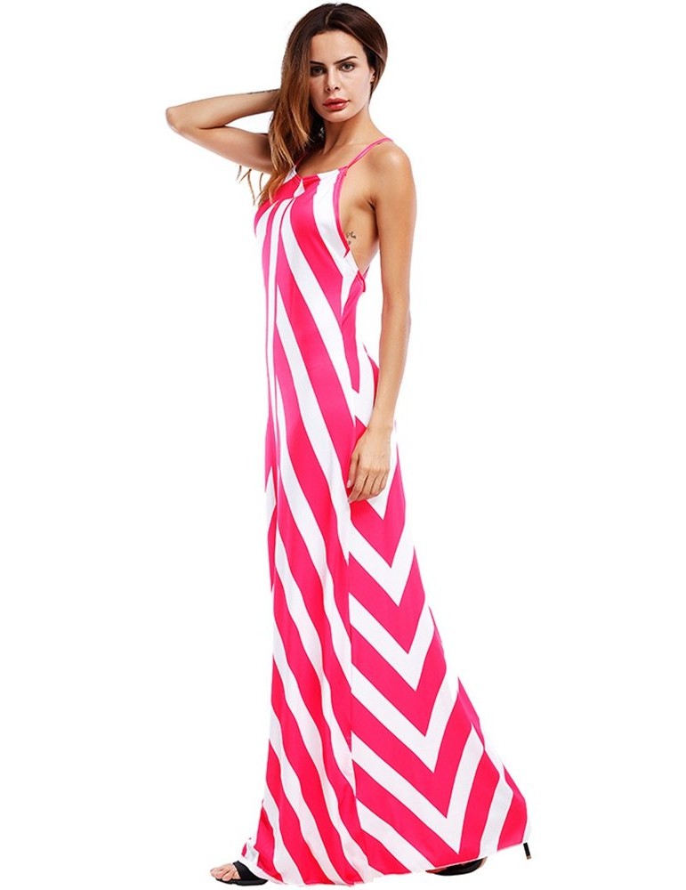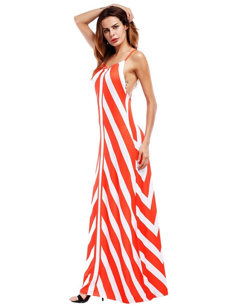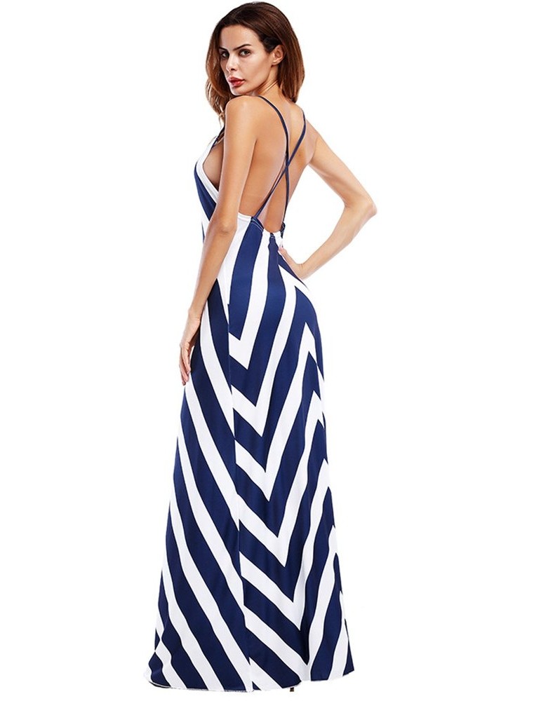 Sexy Stripe Backless Cross Strap V-neck Women Maxi Dresses