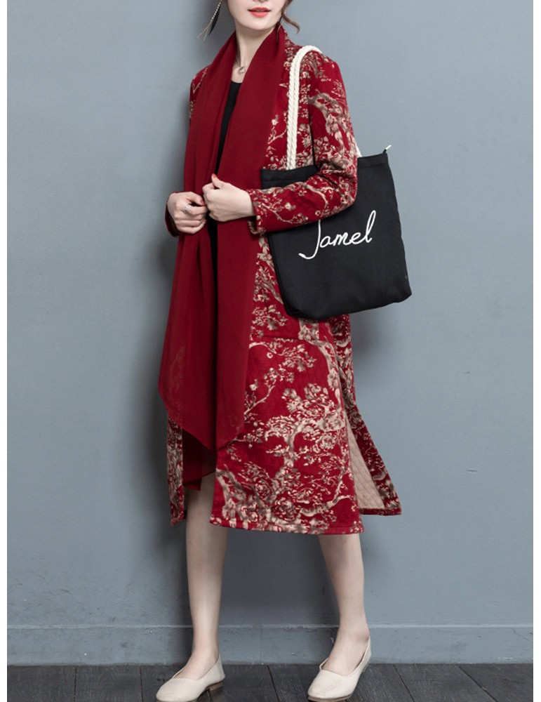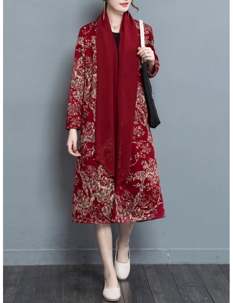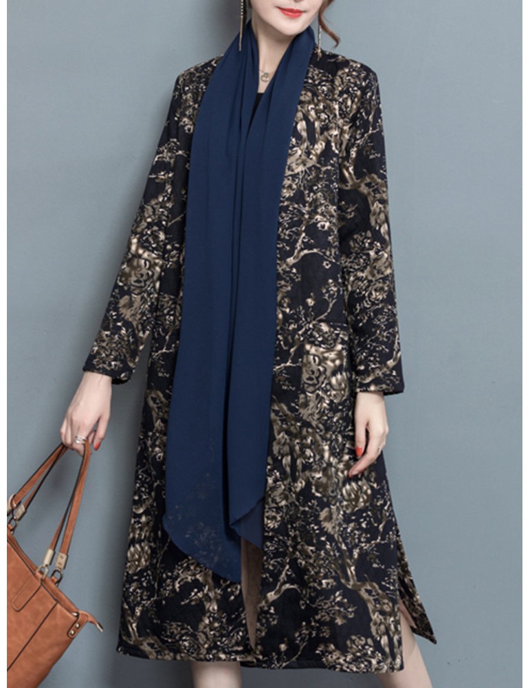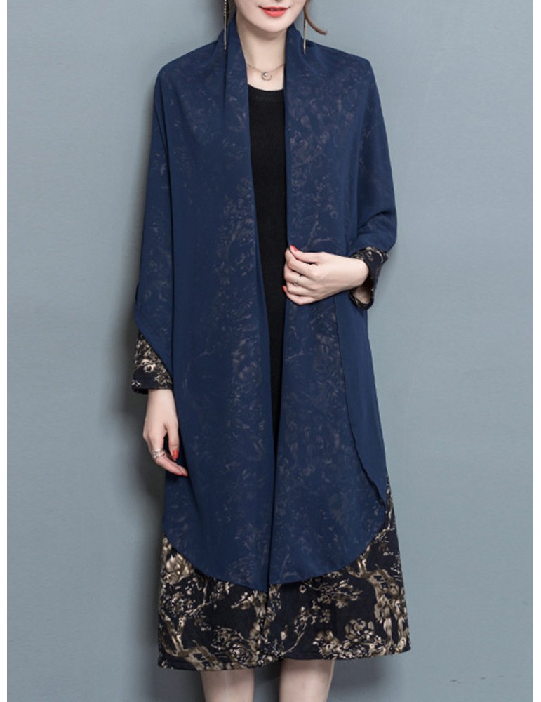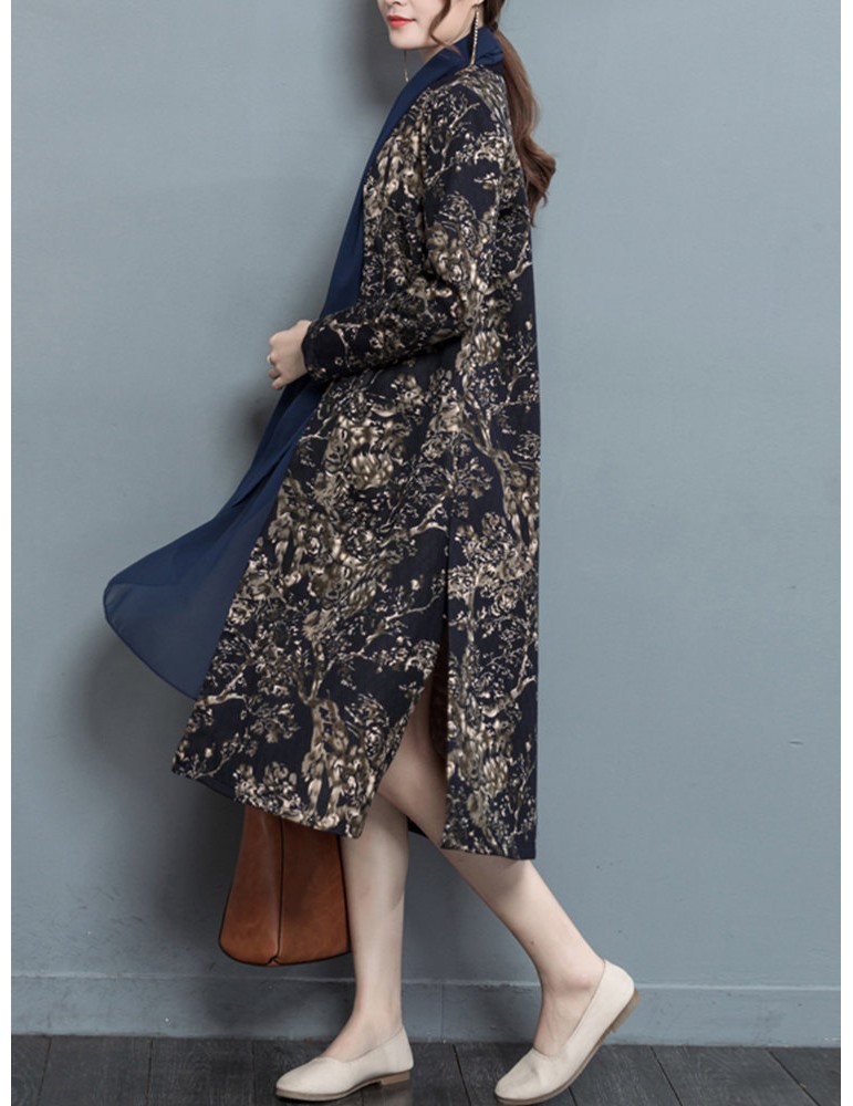 Elegant Print Fake Two Piece Side Split Thin Coat