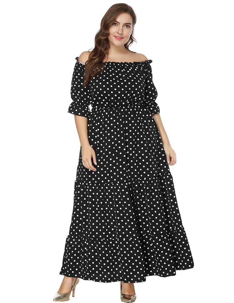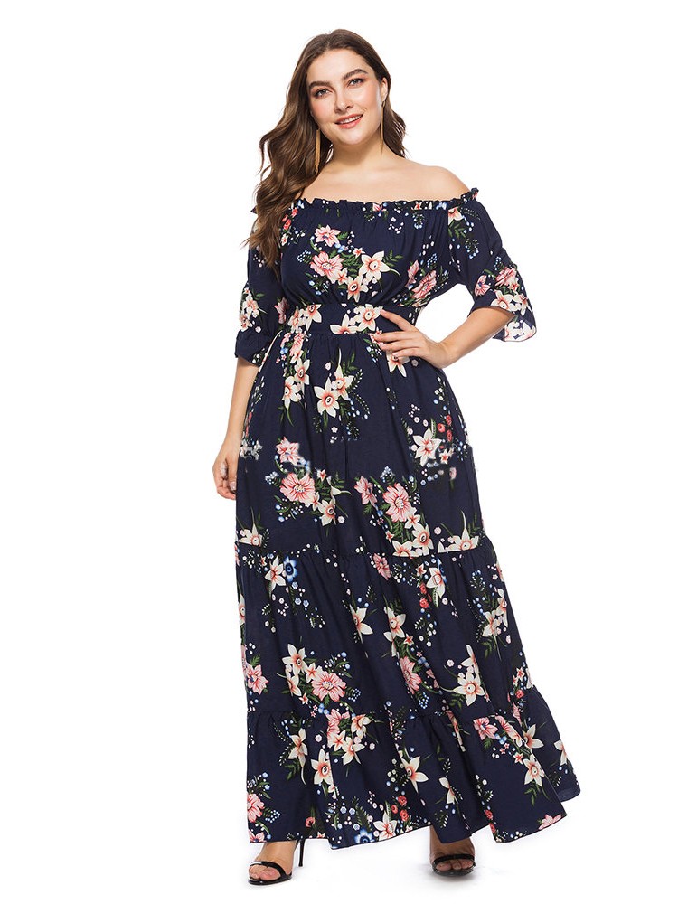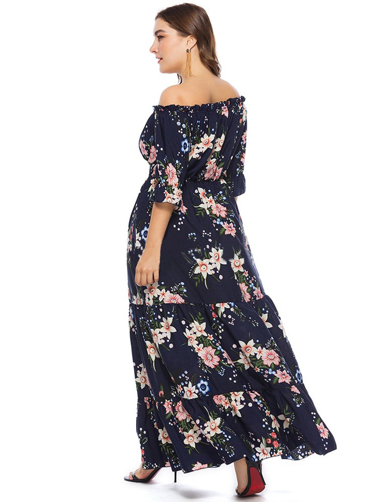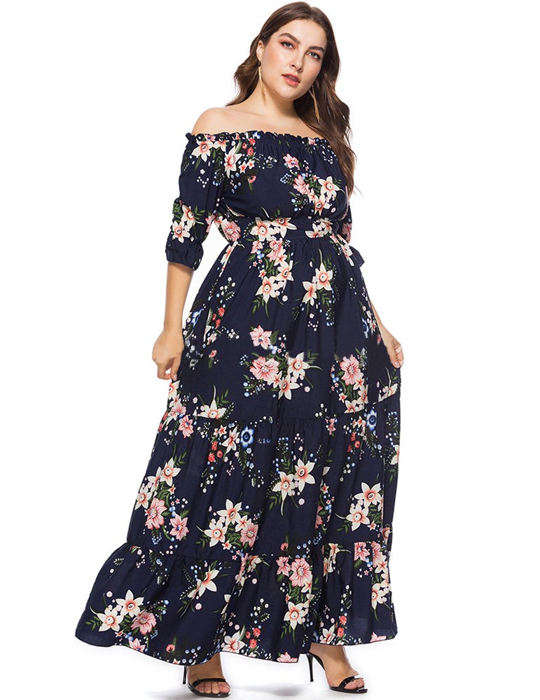 Print Off Shoulder Half Sleeve Maxi Dresses