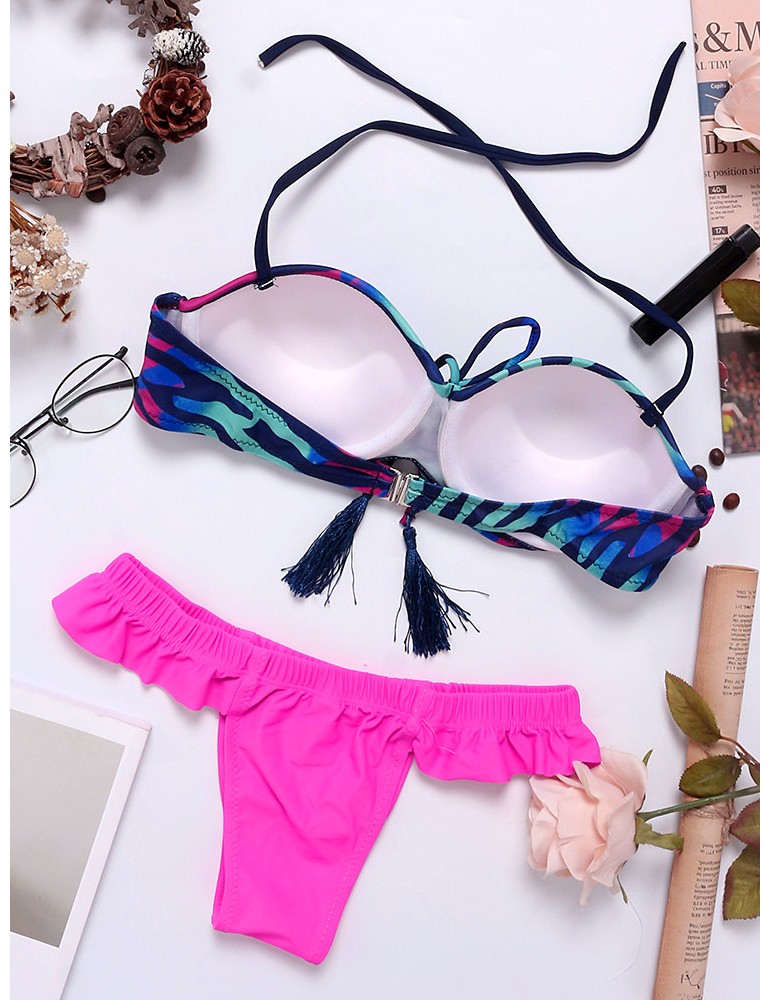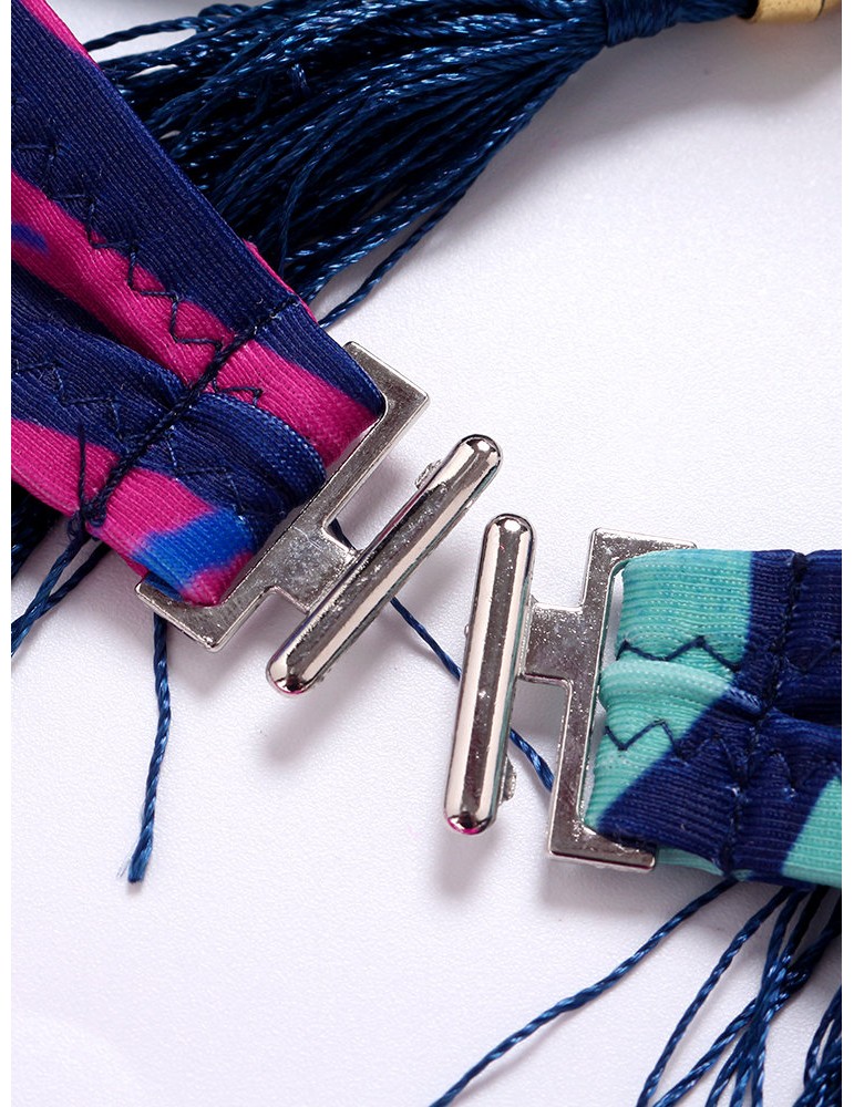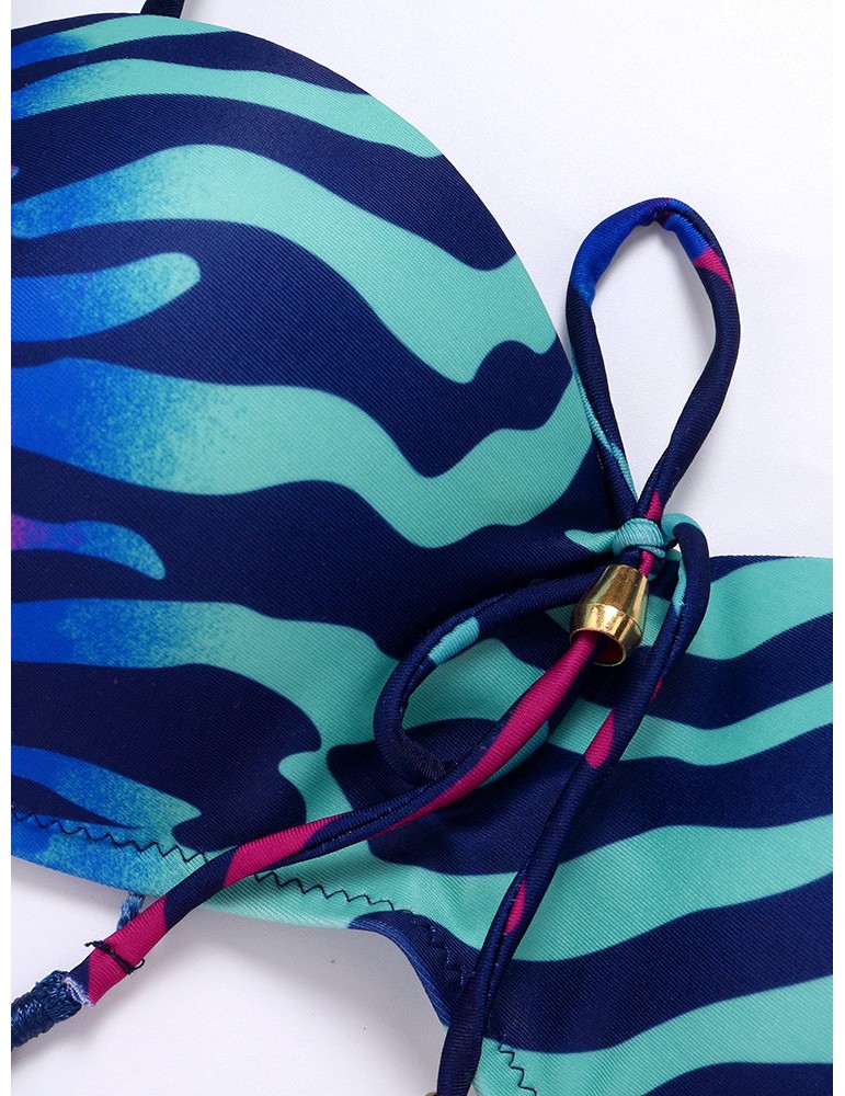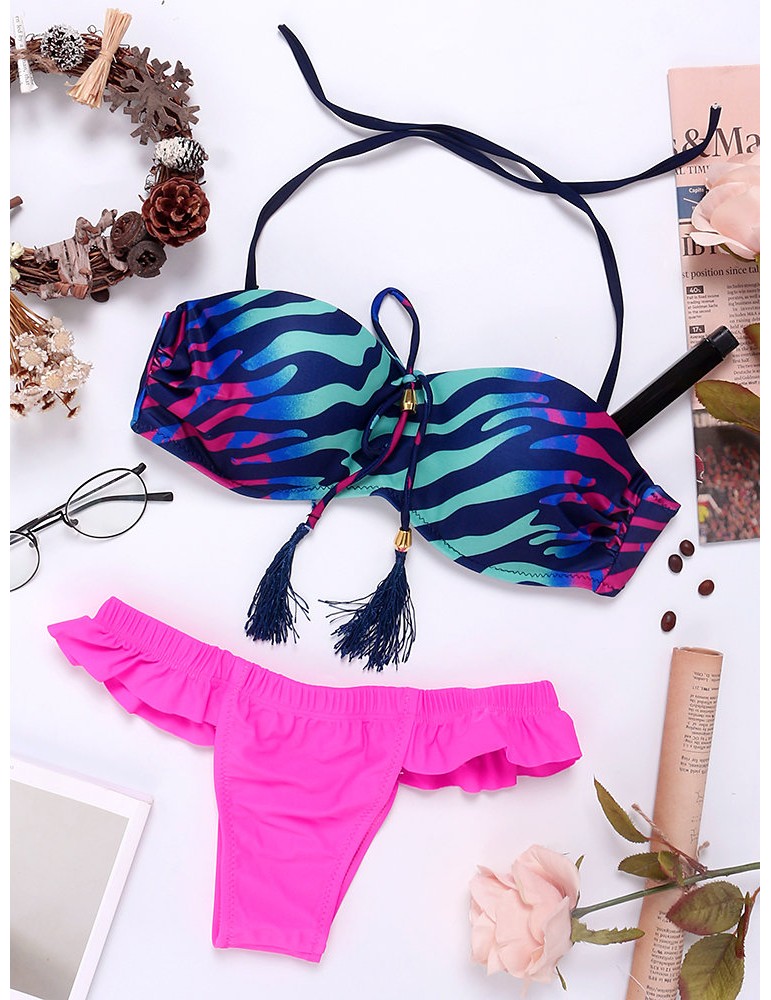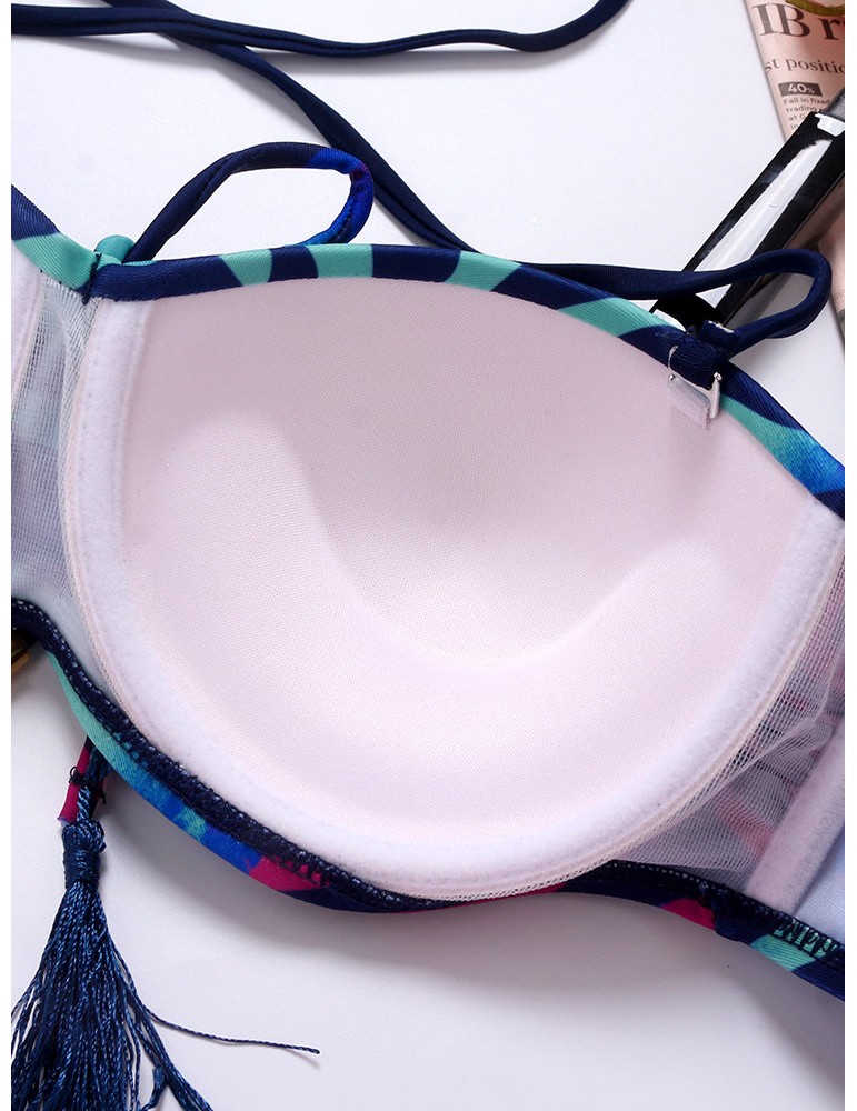 Printed Triangle Scoop Back Stripe Halter Fringed Sexy Bikinis Swimwear For Wen