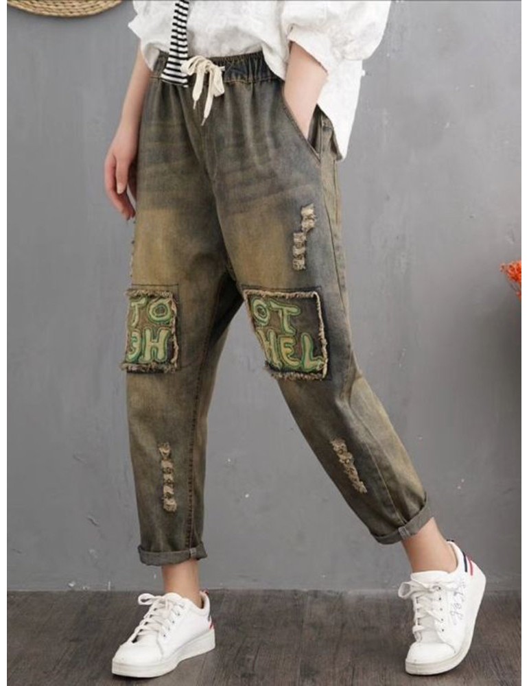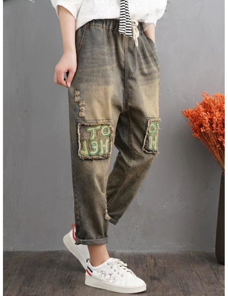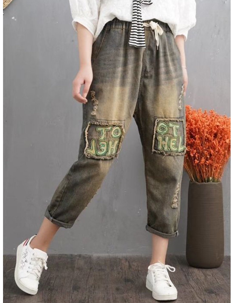 Retro Letters Embroidery Patch Drawstring Denim For Women