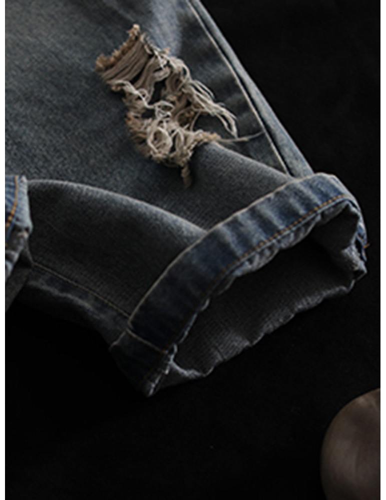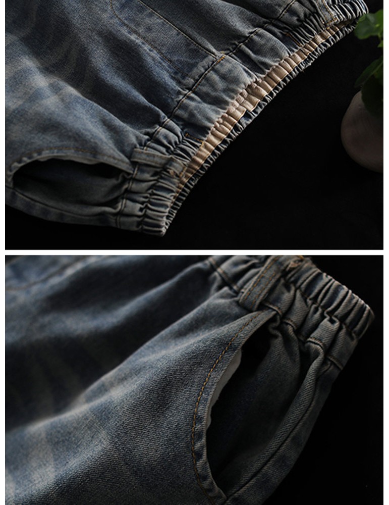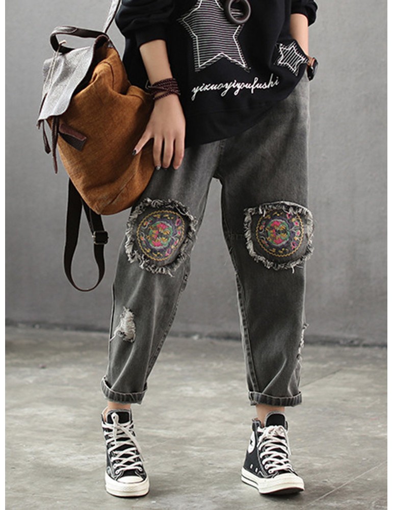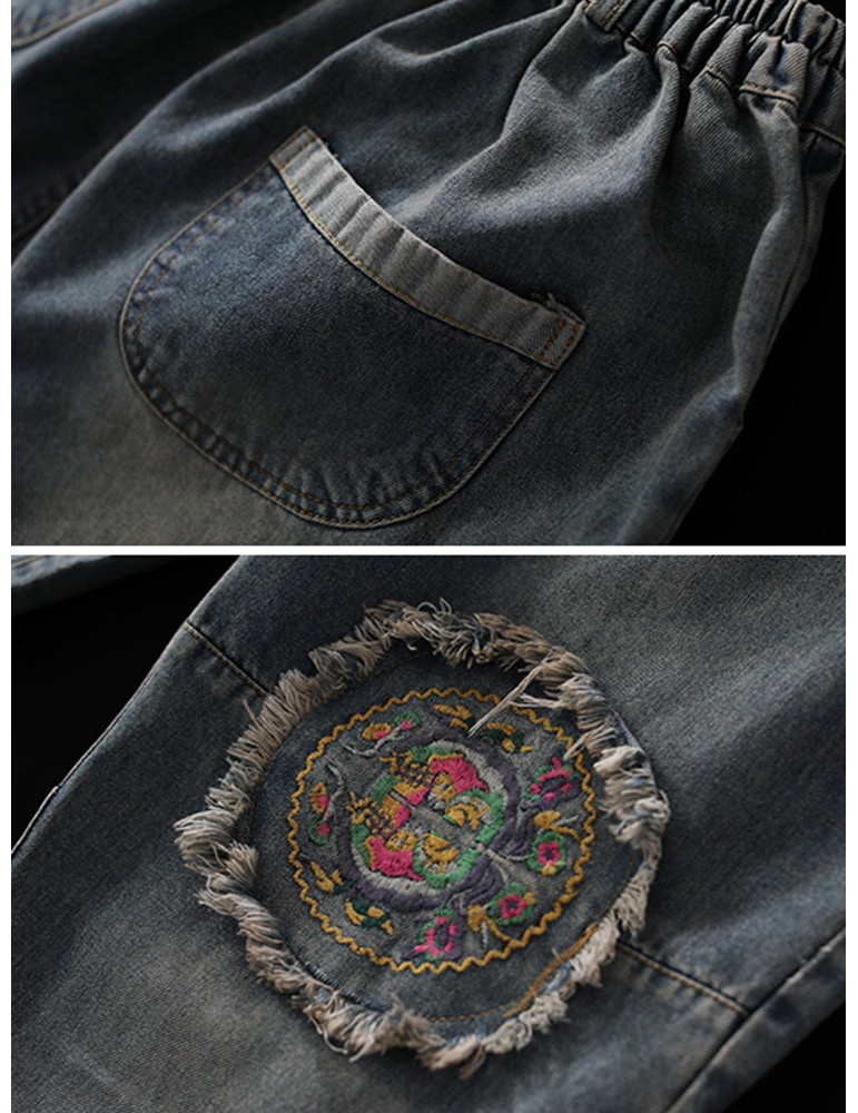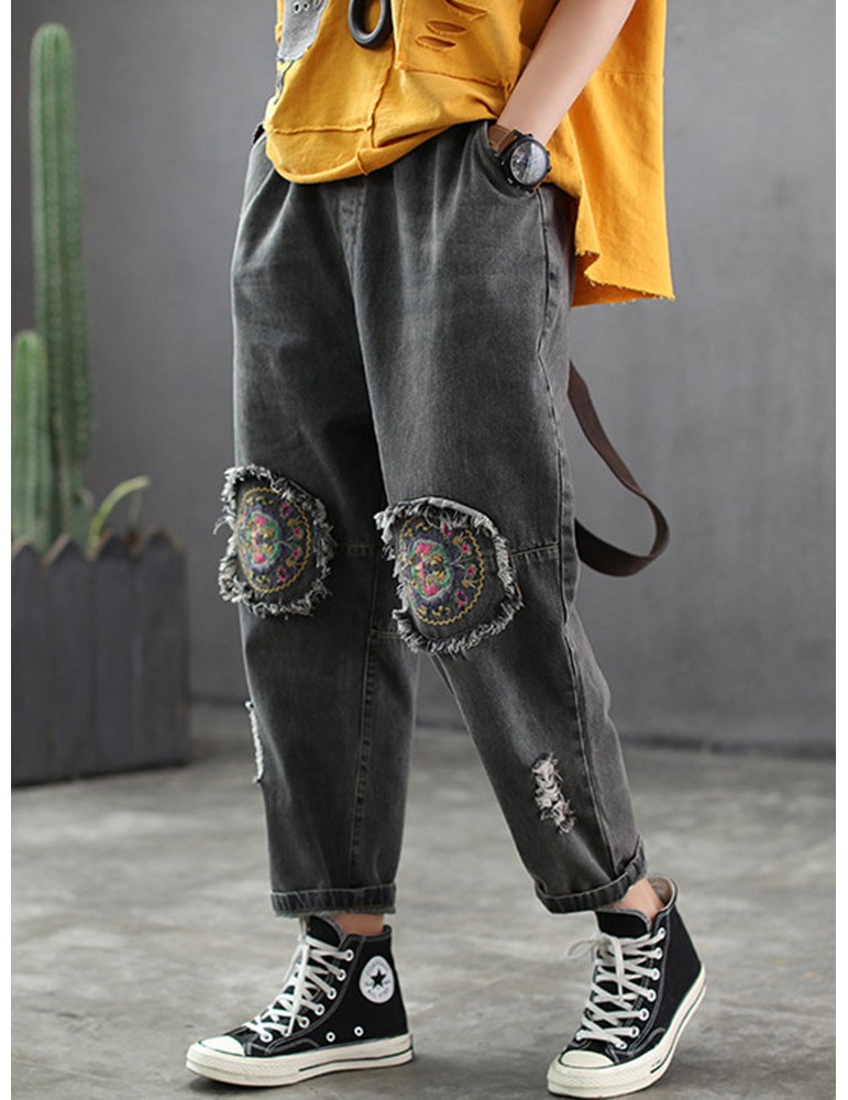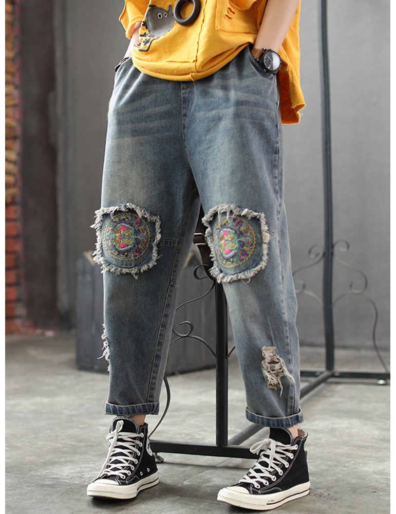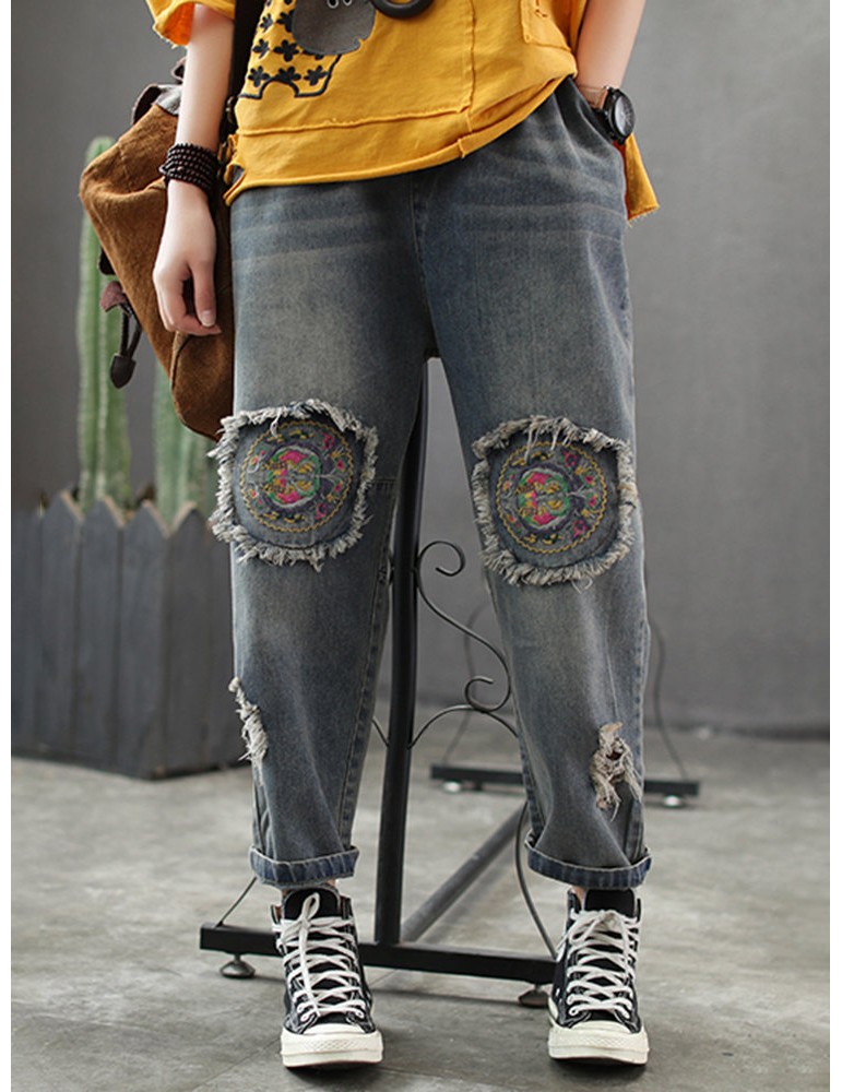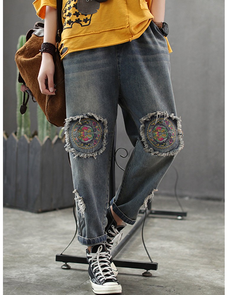 Patch Elastic Waist Embroidery Distressed Denim