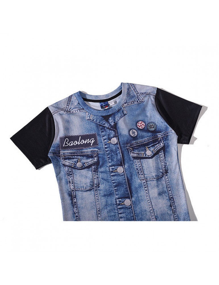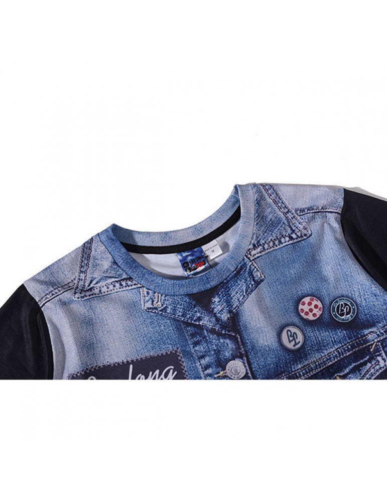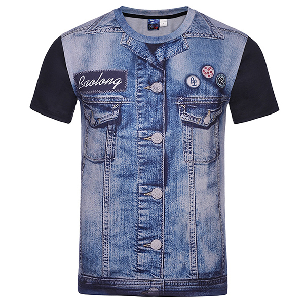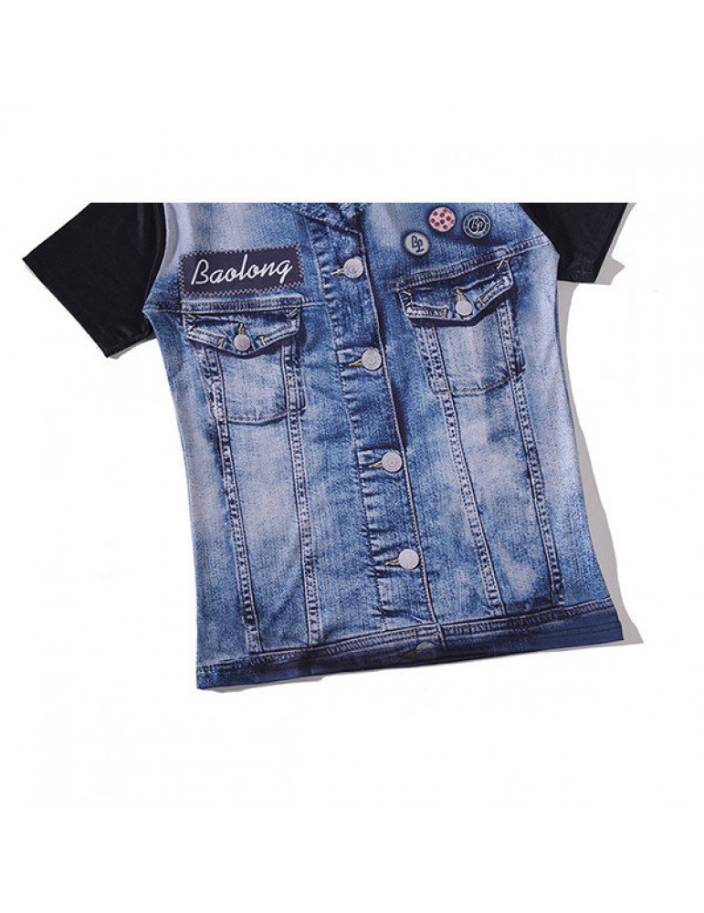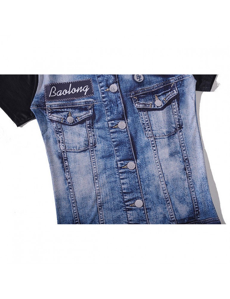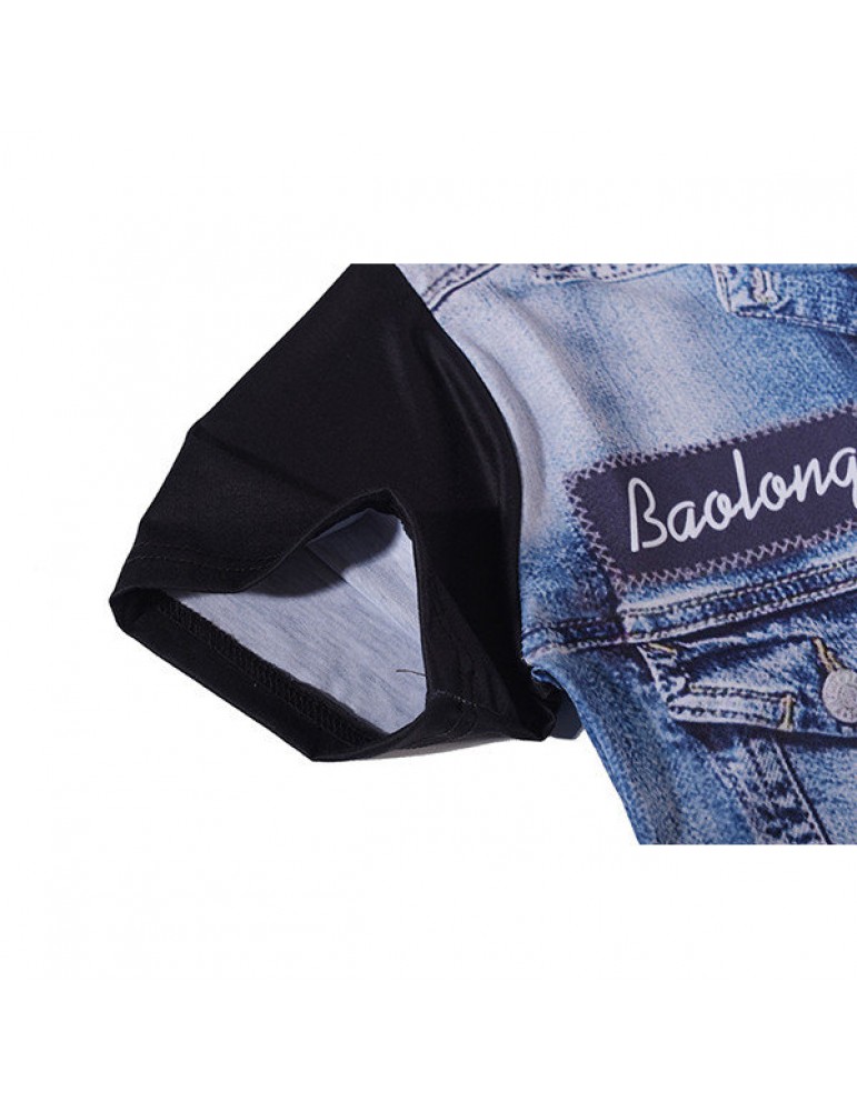 Mens Creative 3D Denim Jacket Printed Tops O-neck Short Sleeve Casual T-shirt