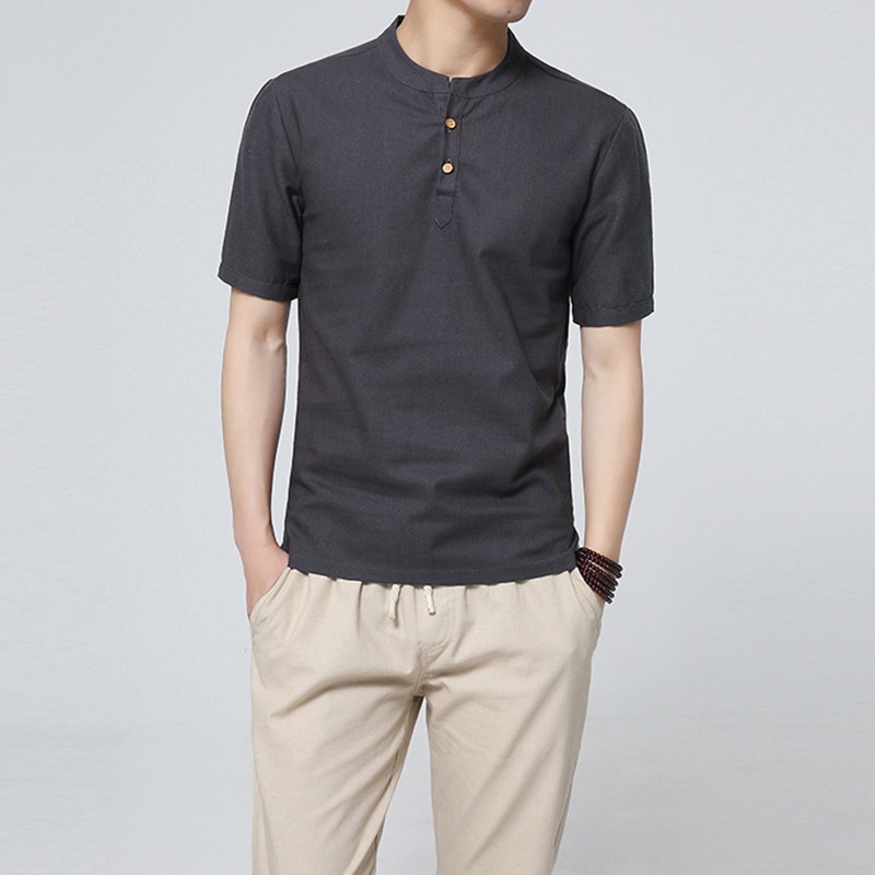 Mens Cotton Linen Chinese Style Retro Solid Color Stand Collar Summer Casual T Shirts