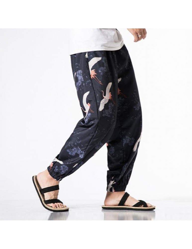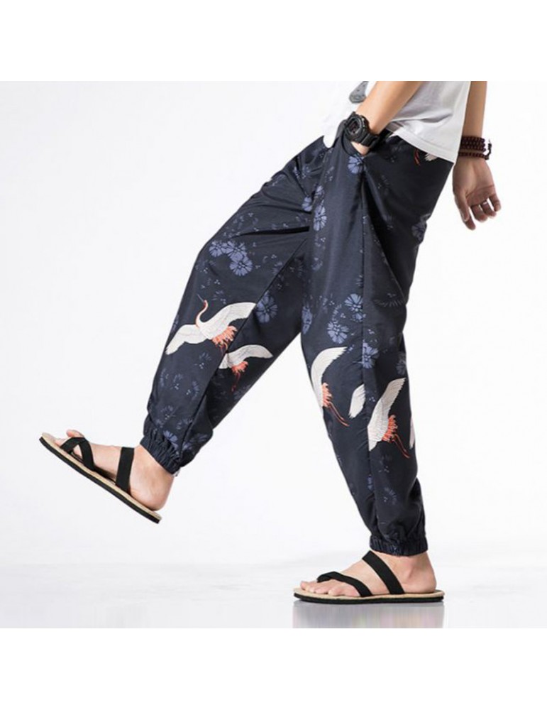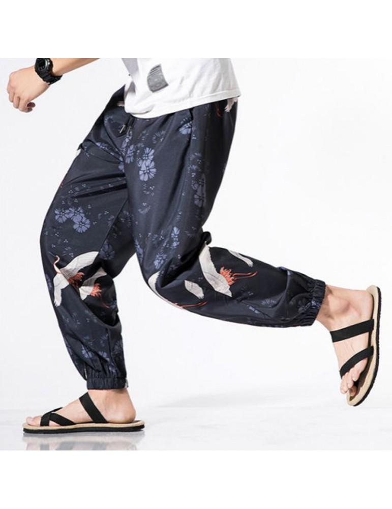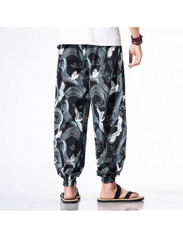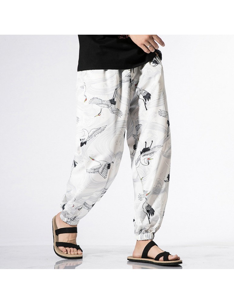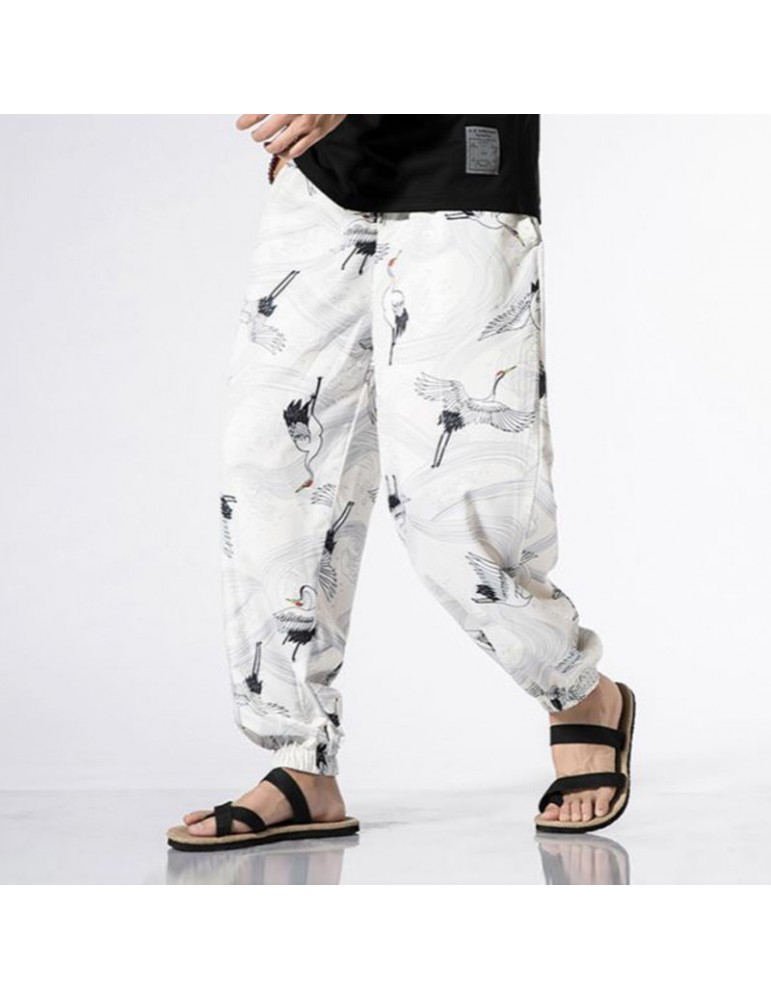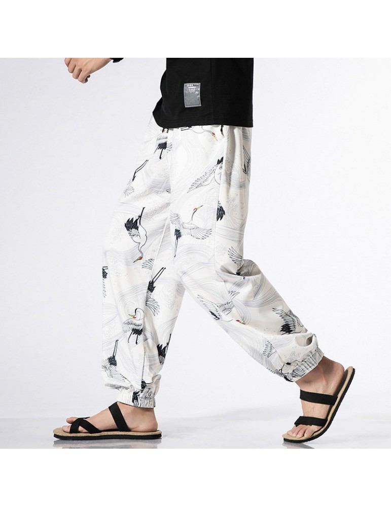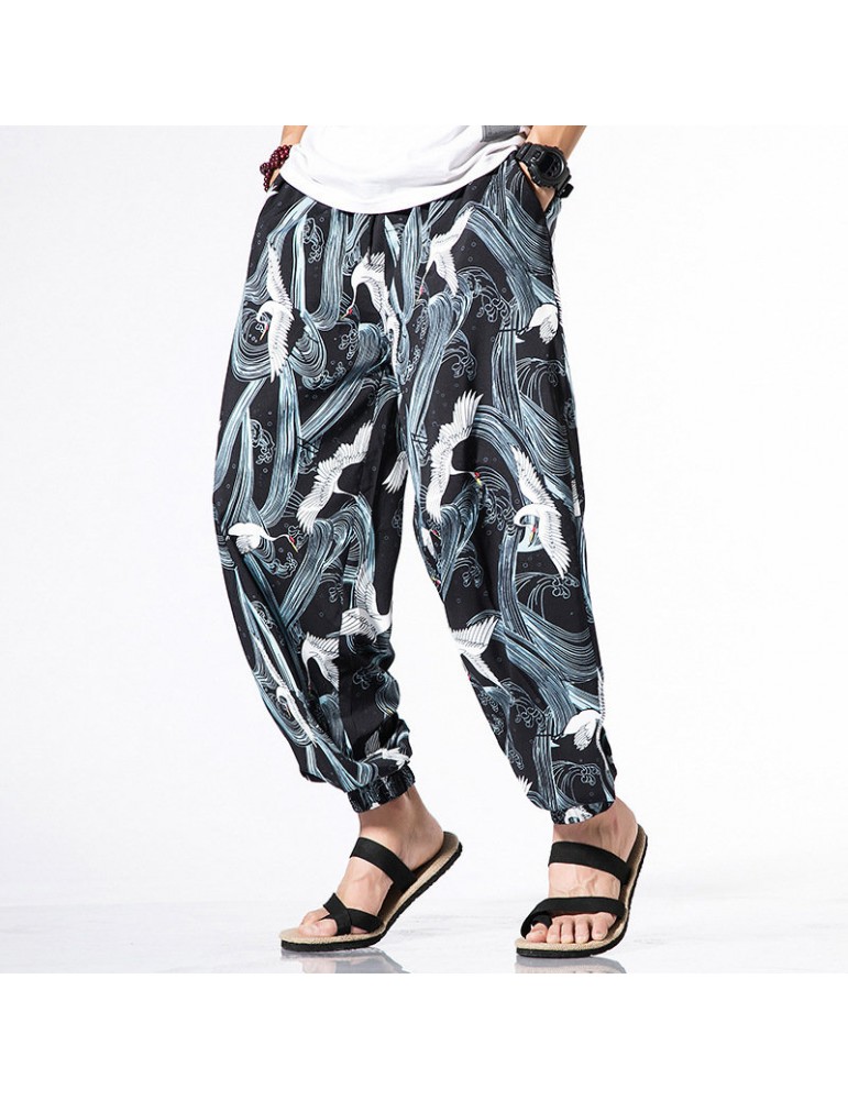 Mens National Style Crane Printing Loose Drawstring Casual Harem Pants