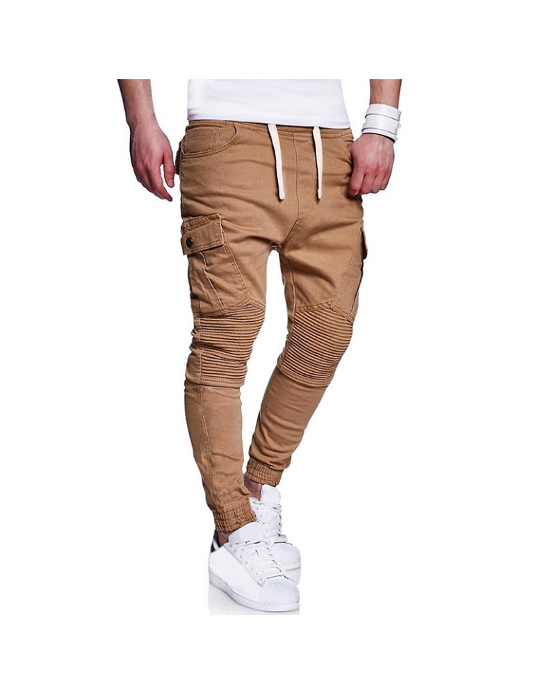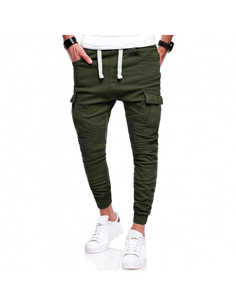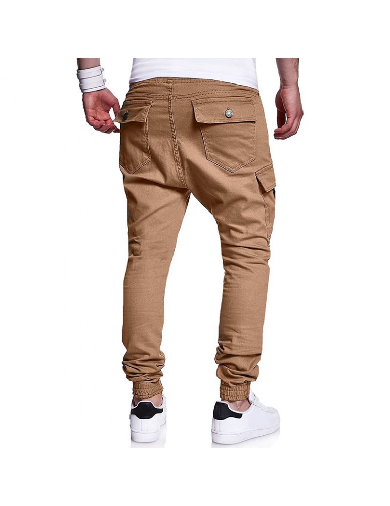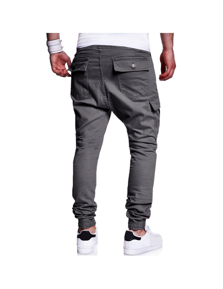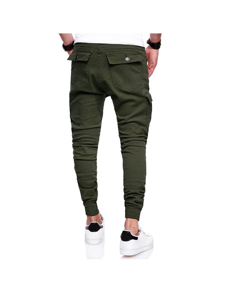 Mens Multi-pocket Cargo Pants Elastic Waist Solid Color Slim Fit Casual Trousers