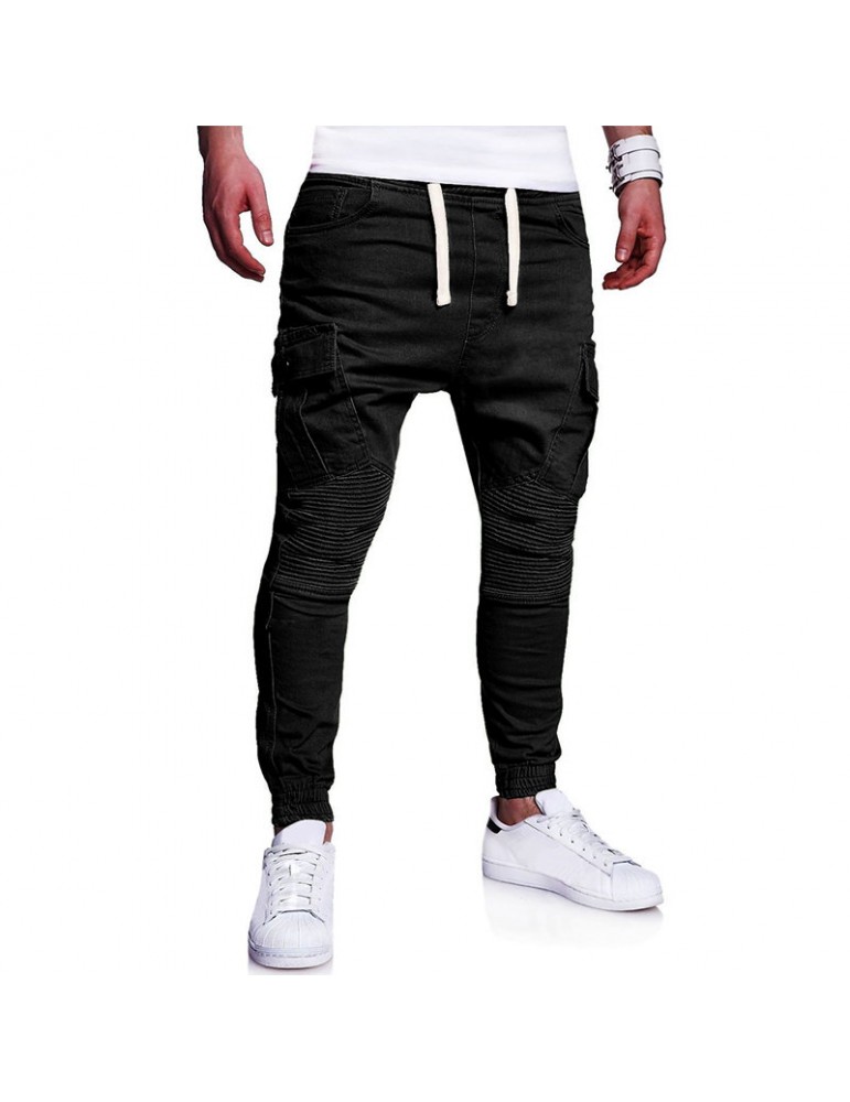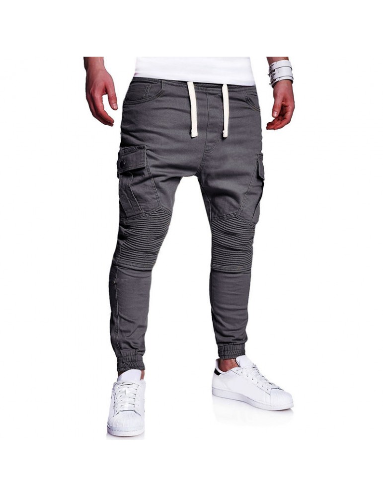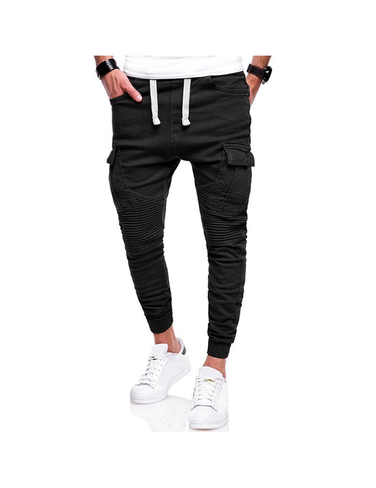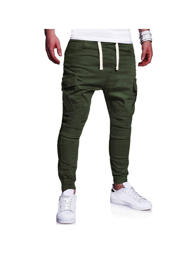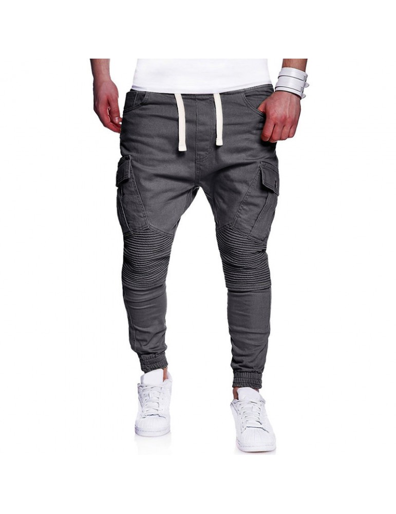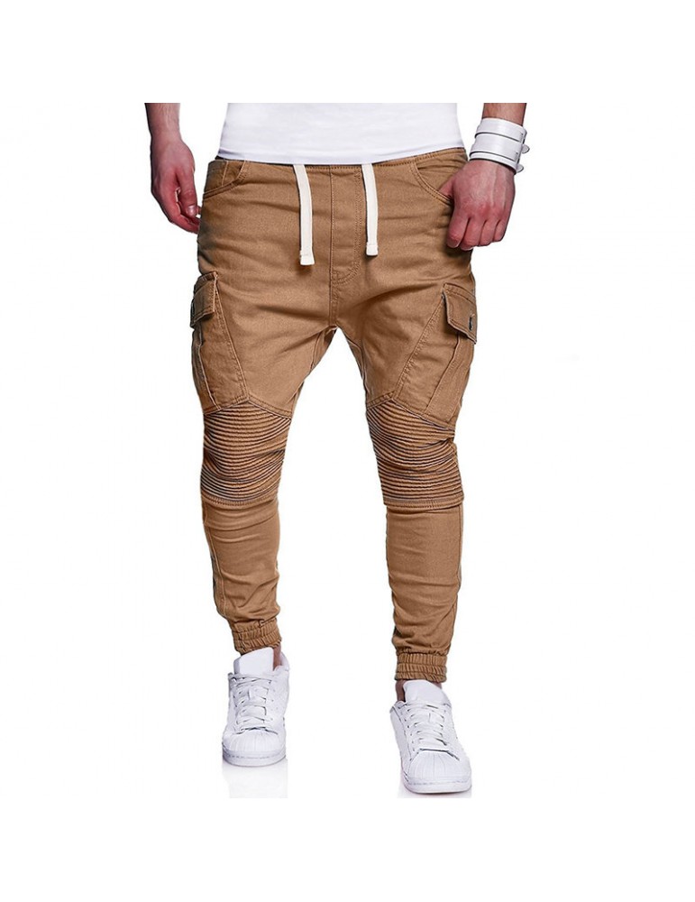 Mens Multi-pocket Cargo Pants Elastic Waist Solid Color Slim Fit Casual Trousers