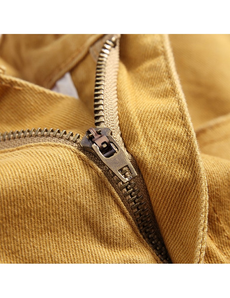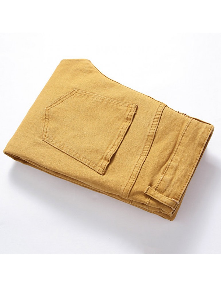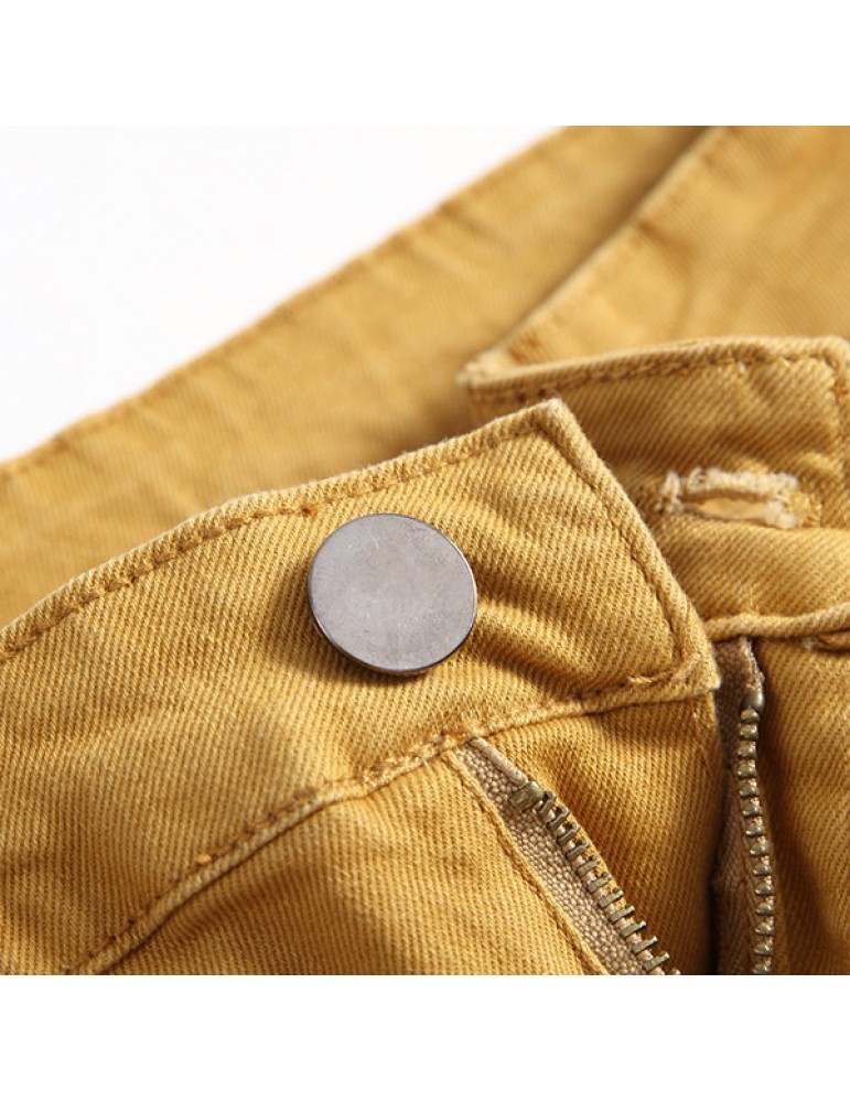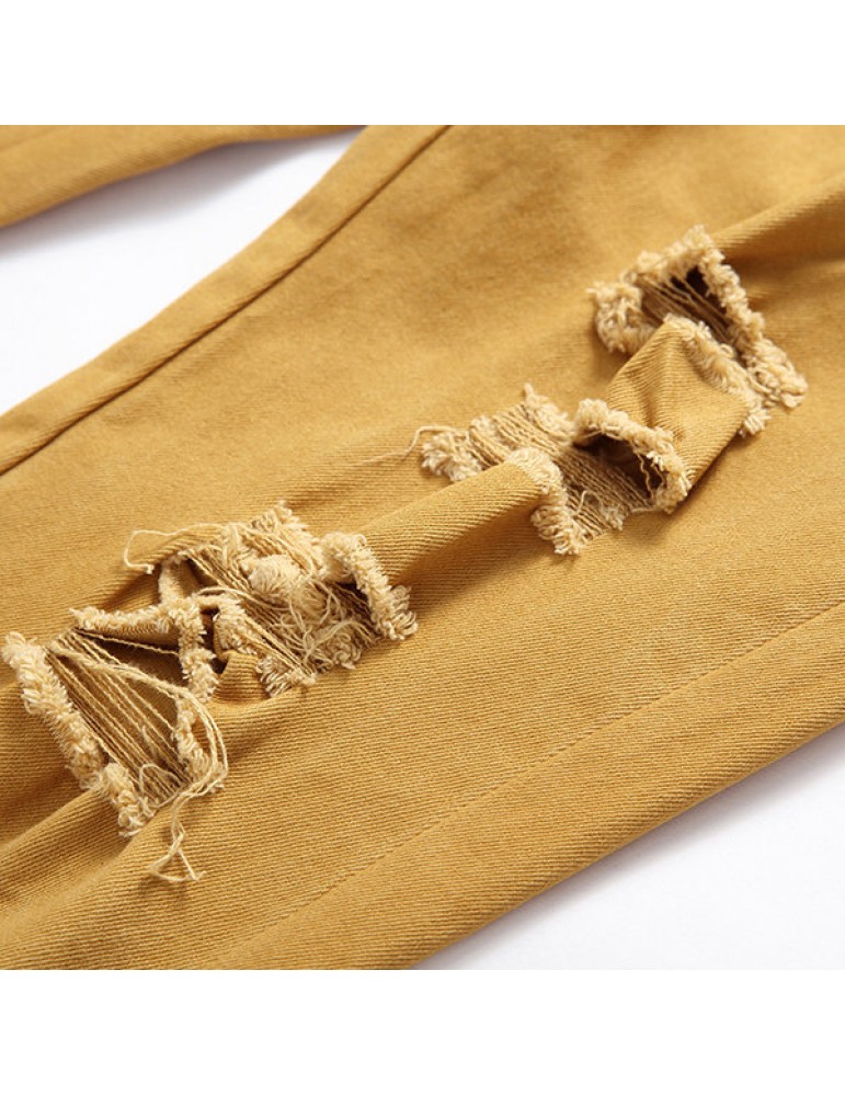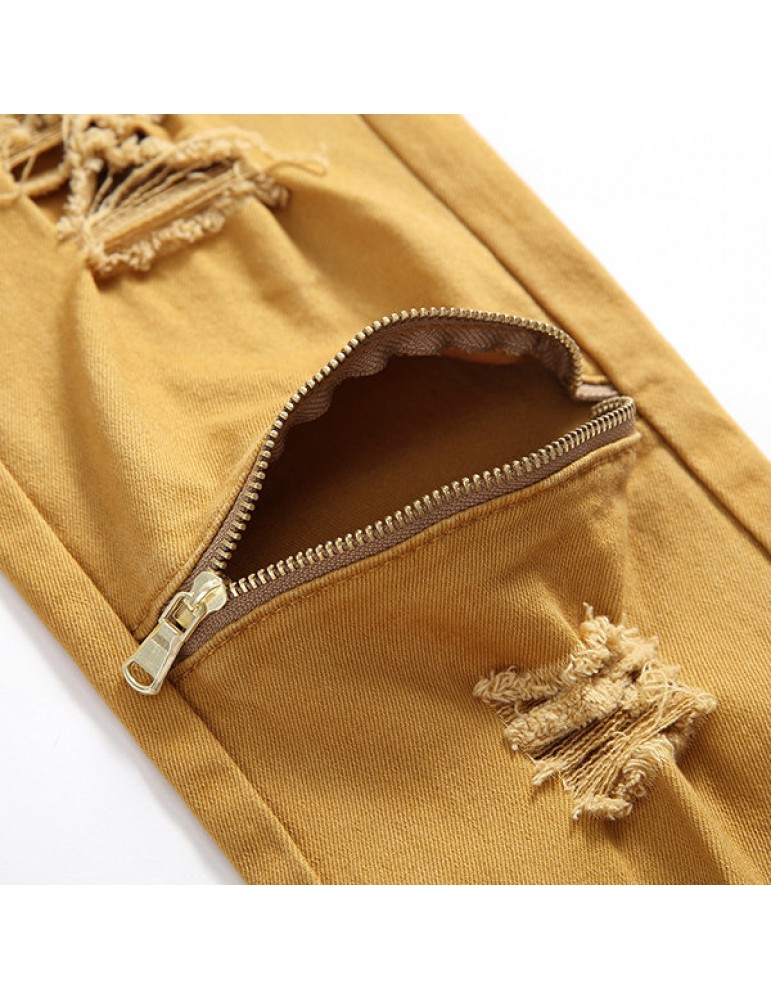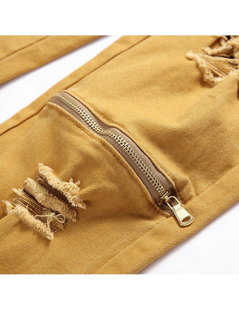 Khaki High Elastic Knee Zipper Opening Holes Ripped Jeans for Men