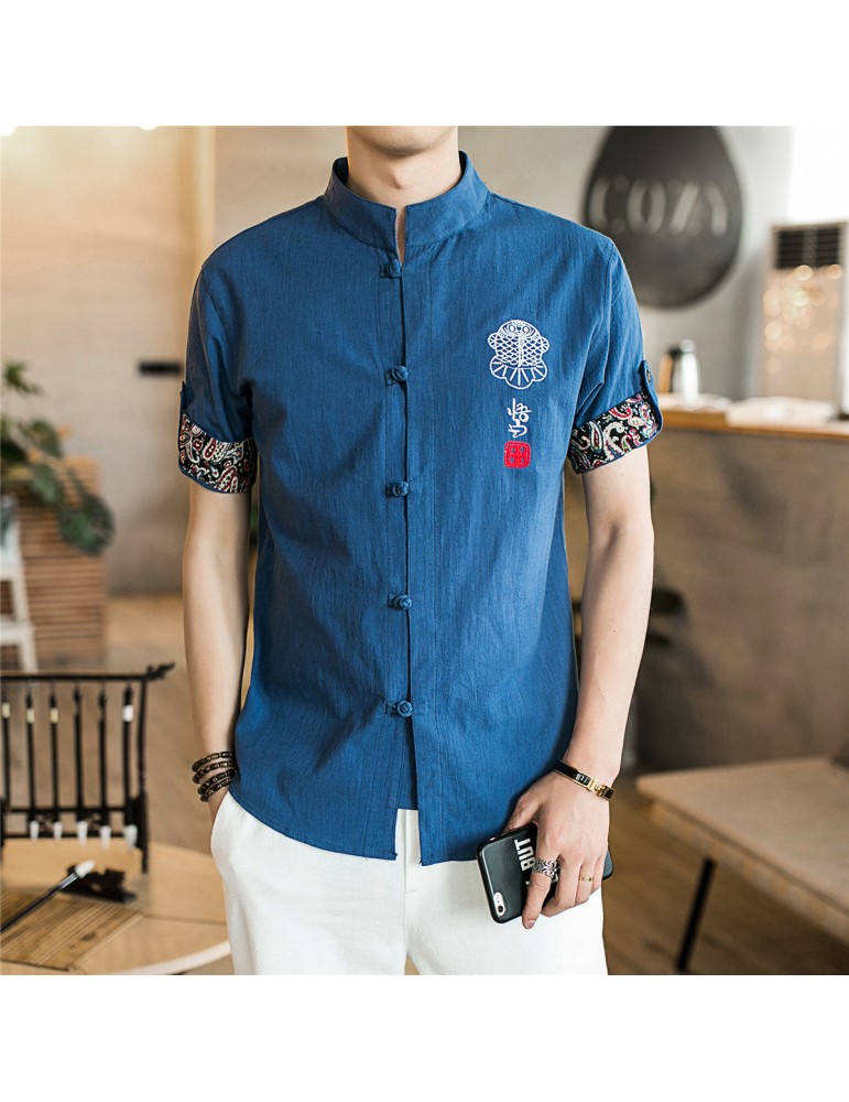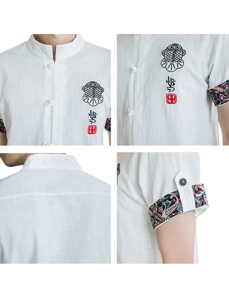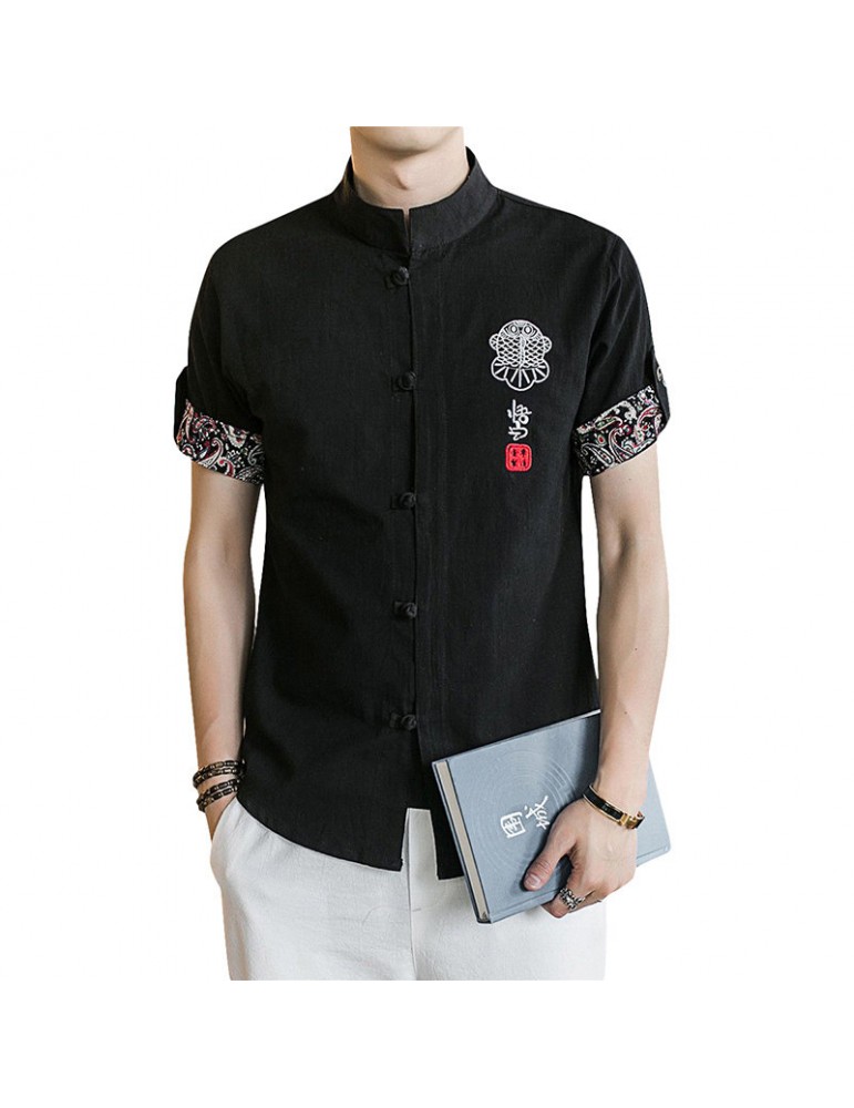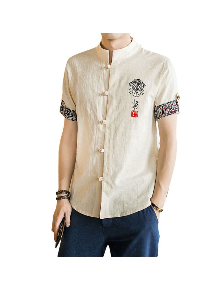 Stand Collar Ethnic Printing Chinese Button Short Sleeves Summer Designer Shirt for Men