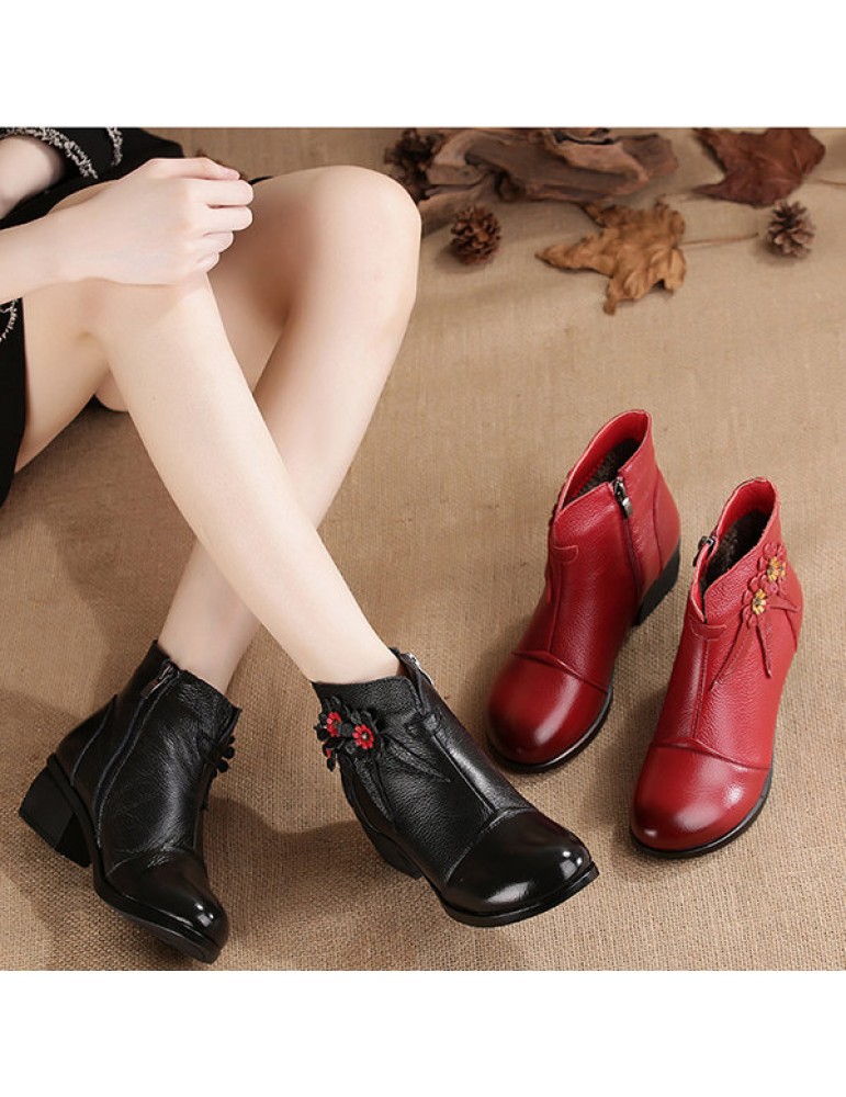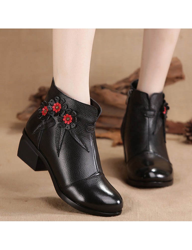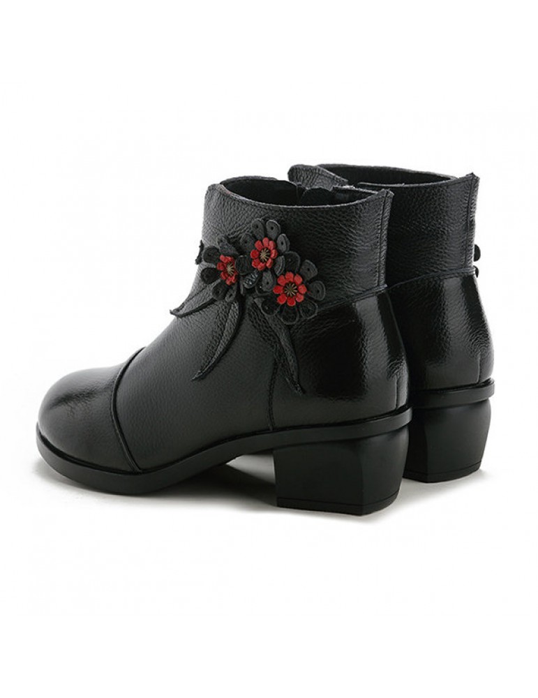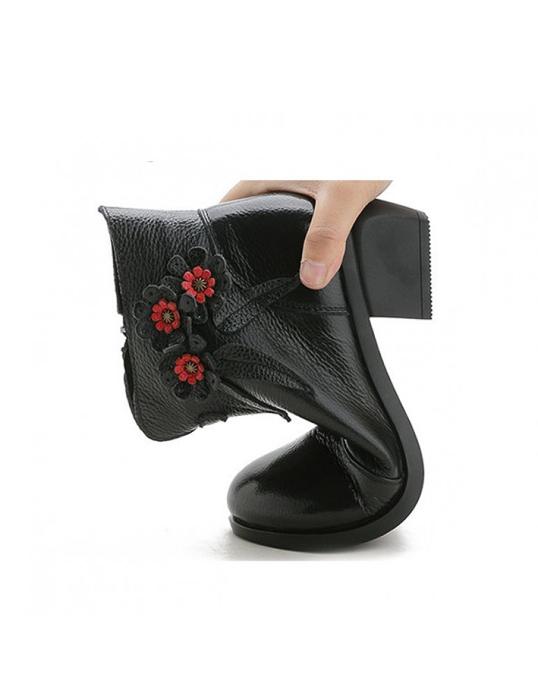 Women Winter Folkways Plush Lined Cow Leather Flowers Zip Square Heel Boots