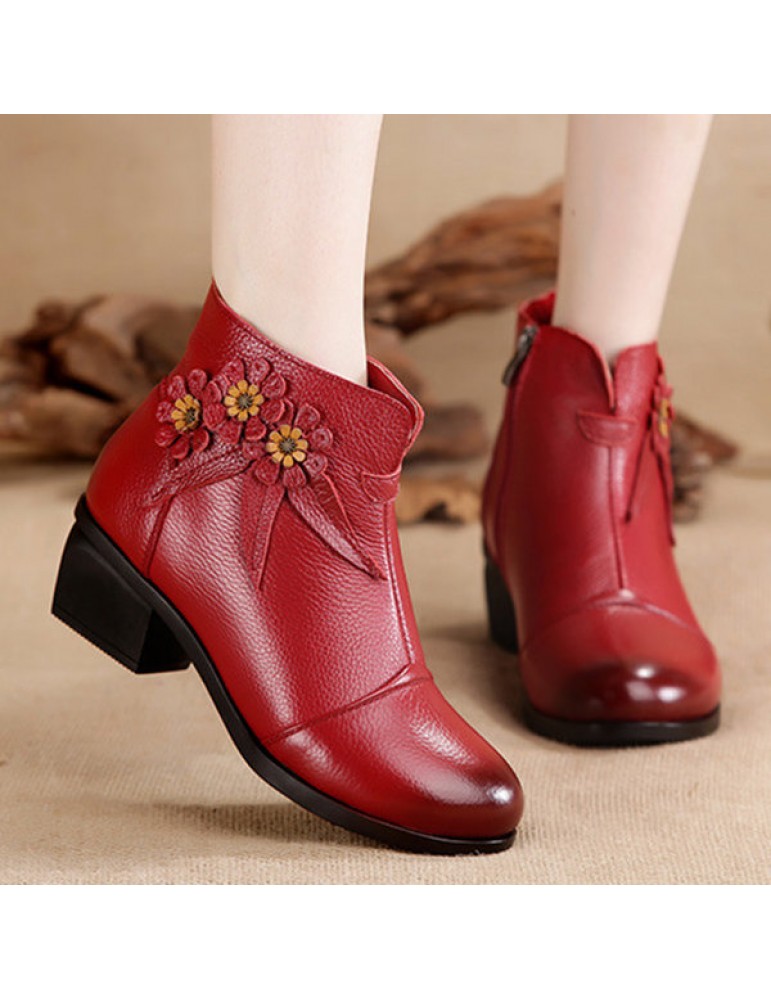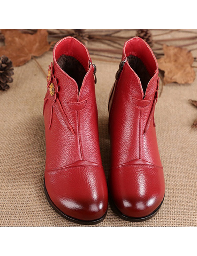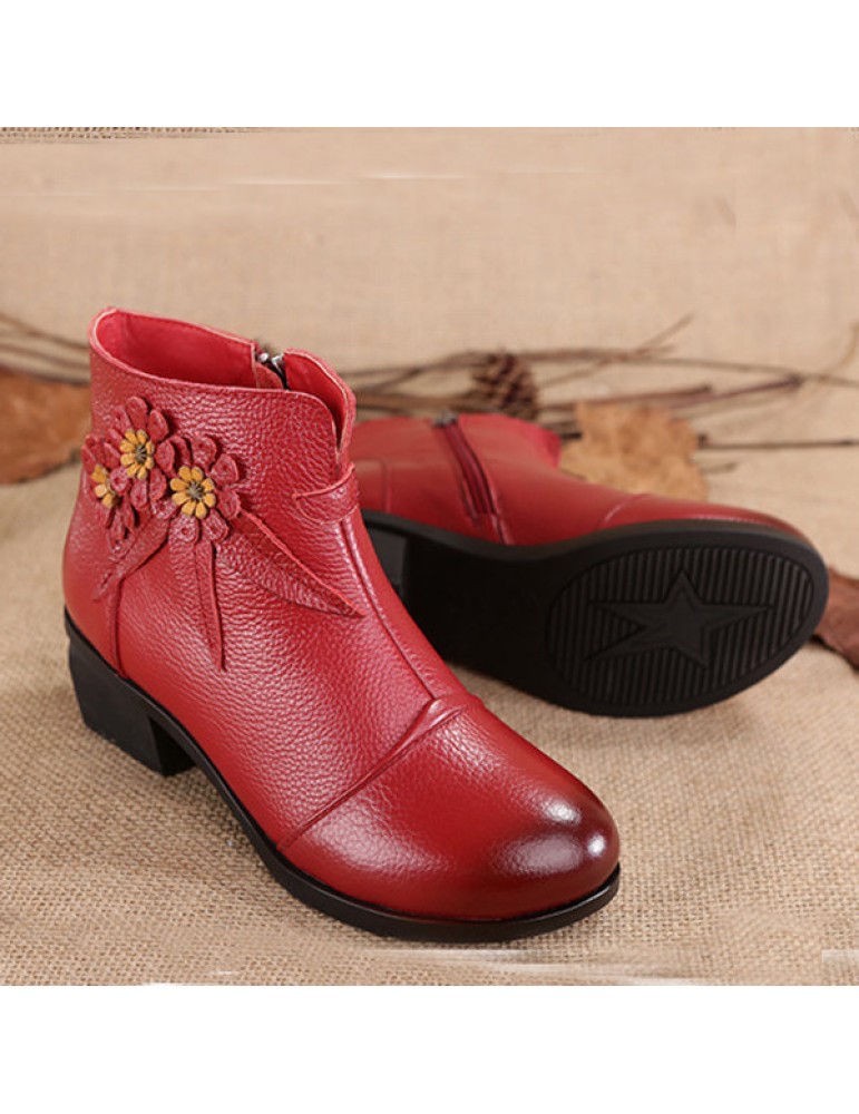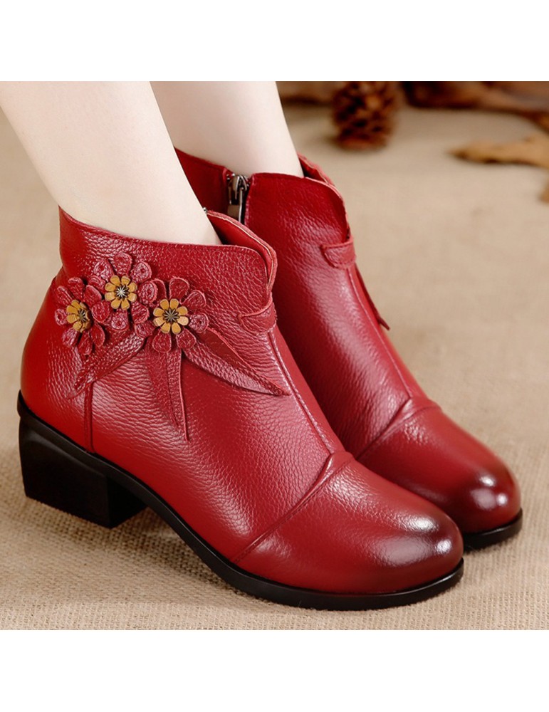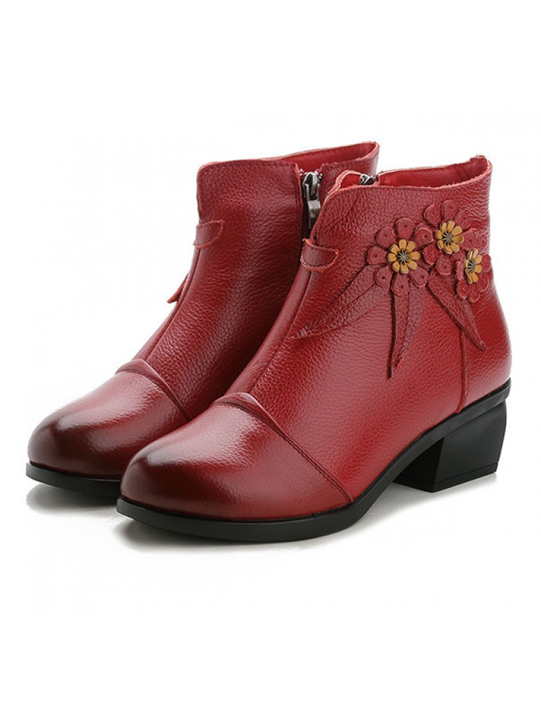 Women Winter Folkways Plush Lined Cow Leather Flowers Zip Square Heel Boots