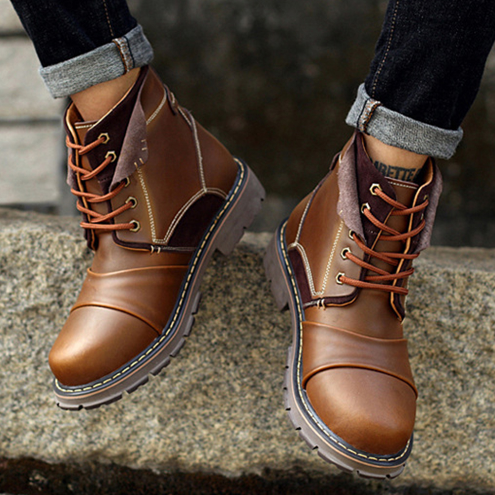 Men Retro Genuine Leather Splicing Slip Resistant Outdoor Casual Boots