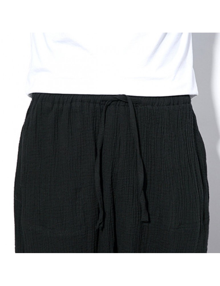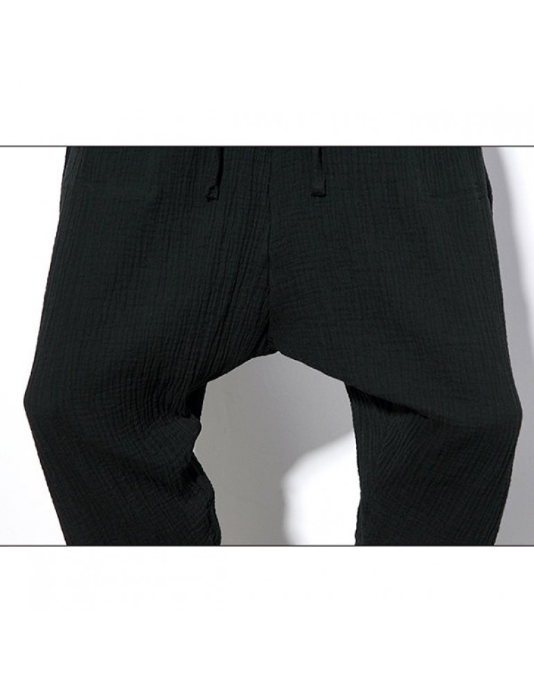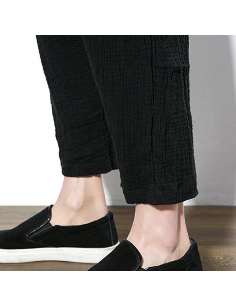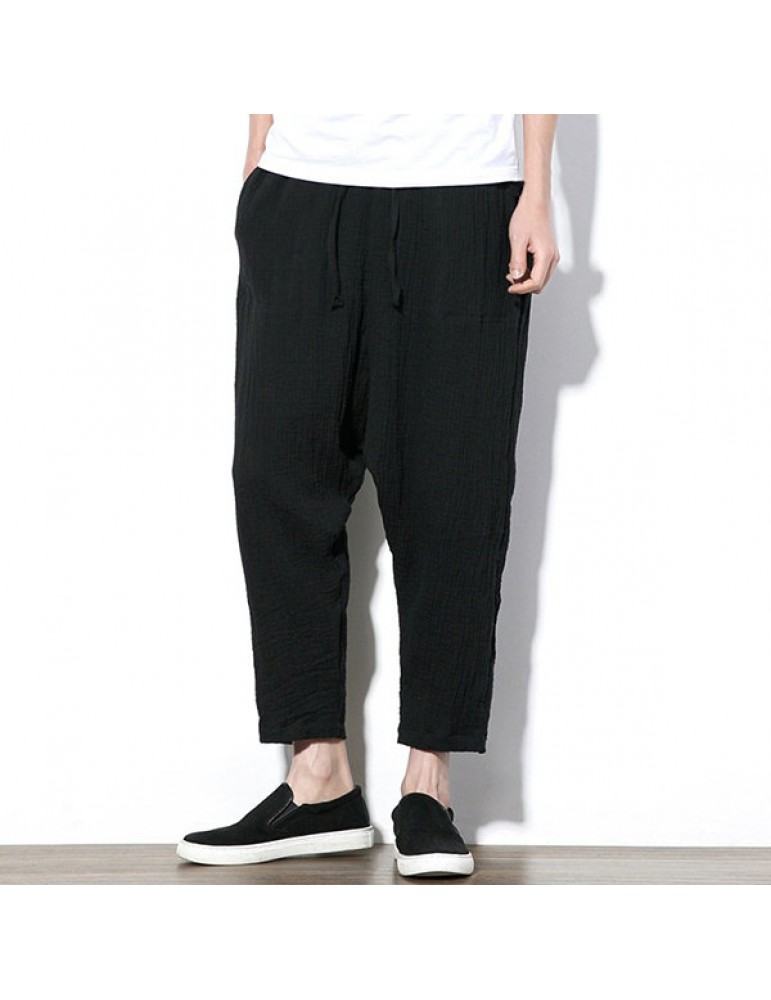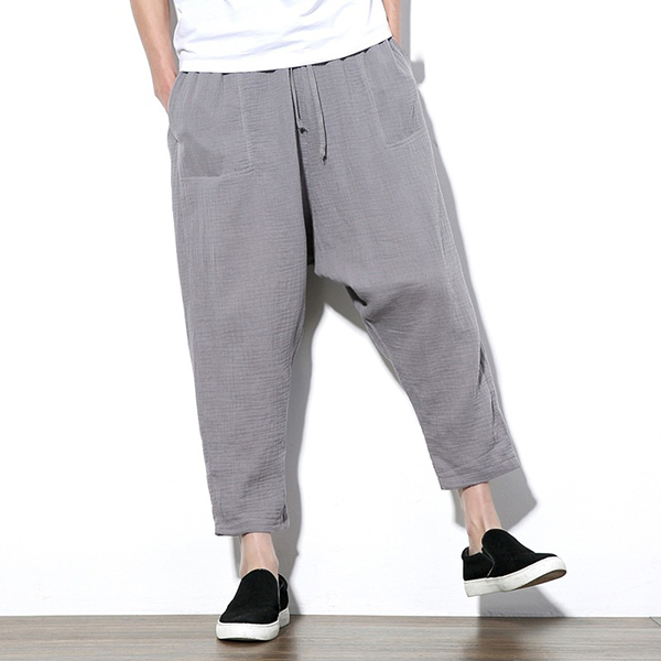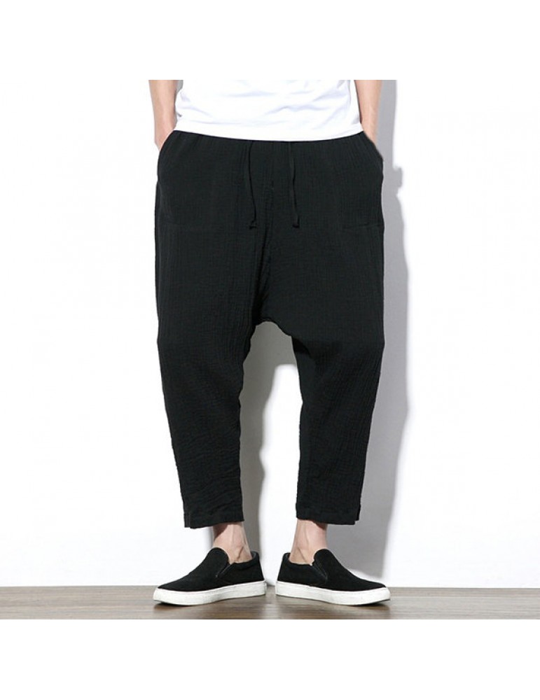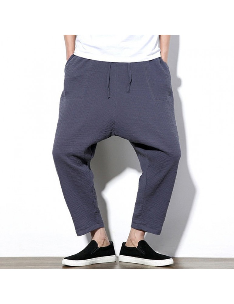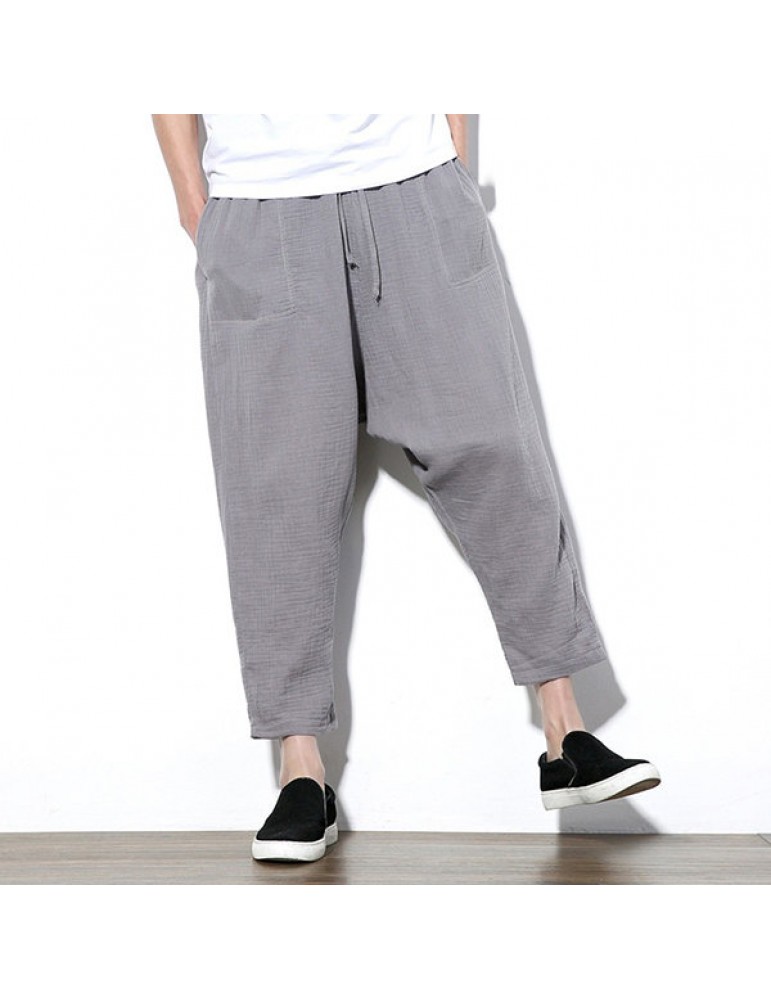 Mens Chinese Style Linen Harem Pants Elastic Waist Solid Color Loose Casual Pants