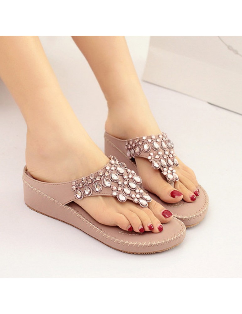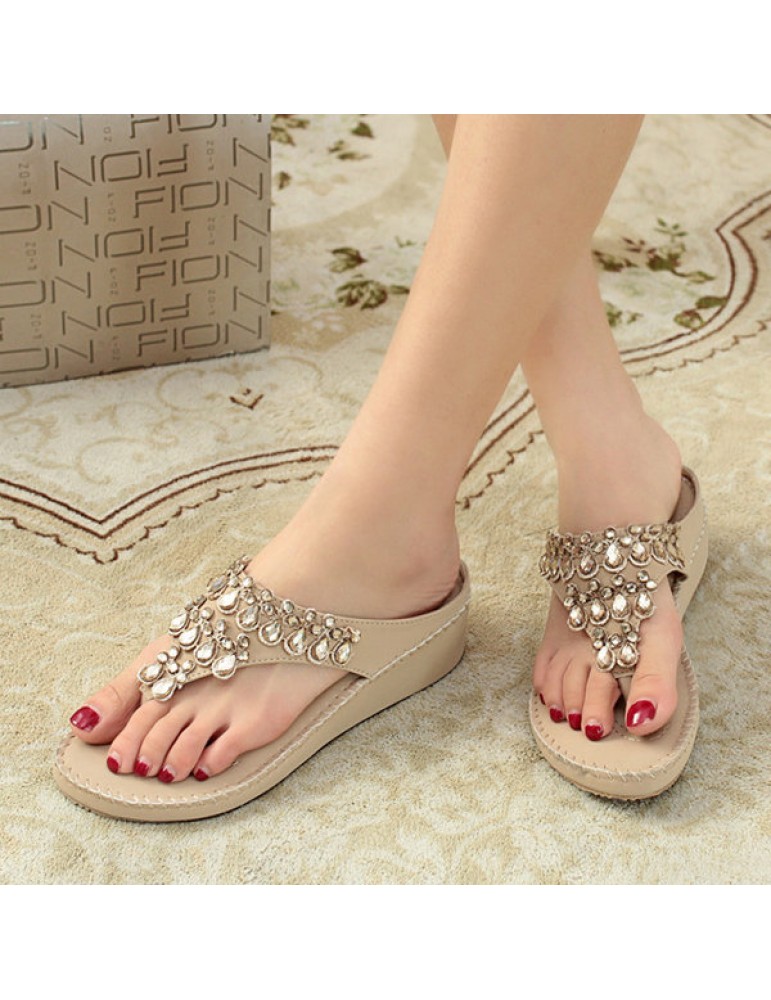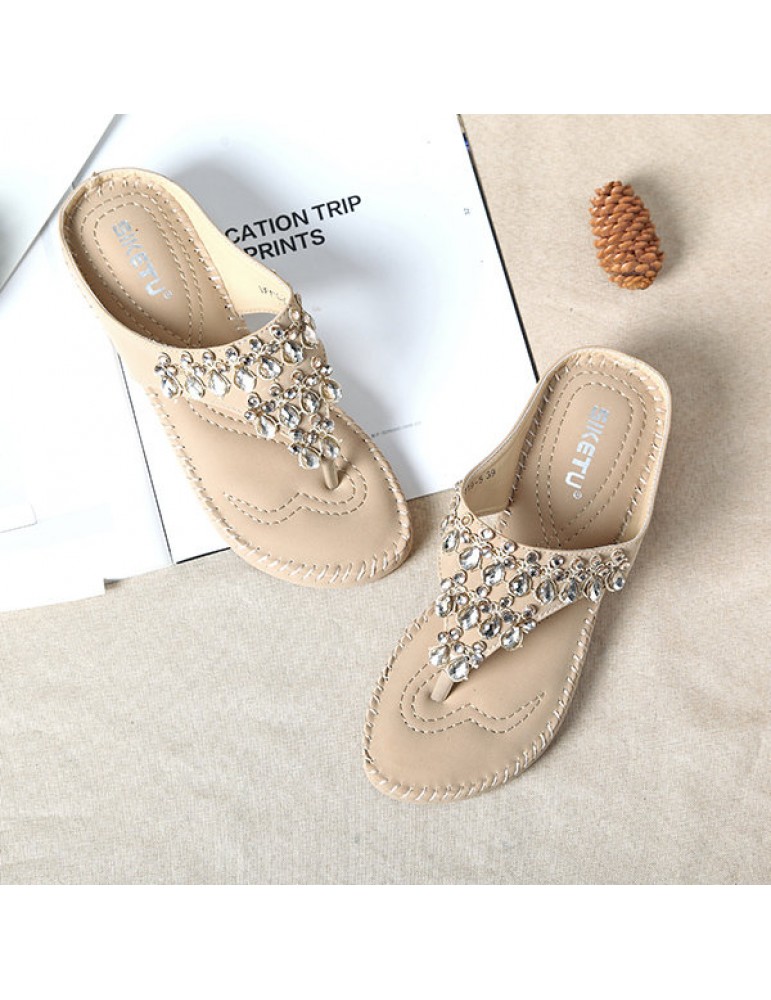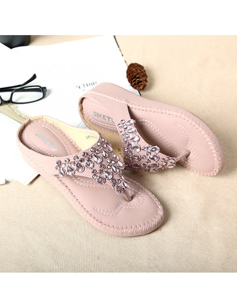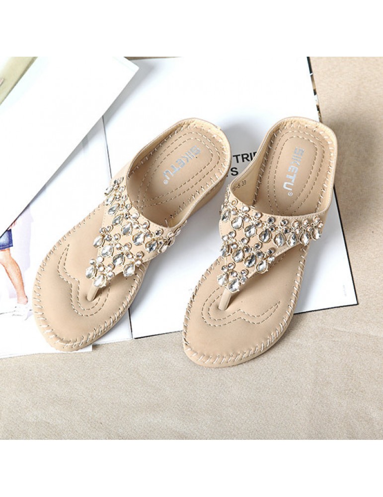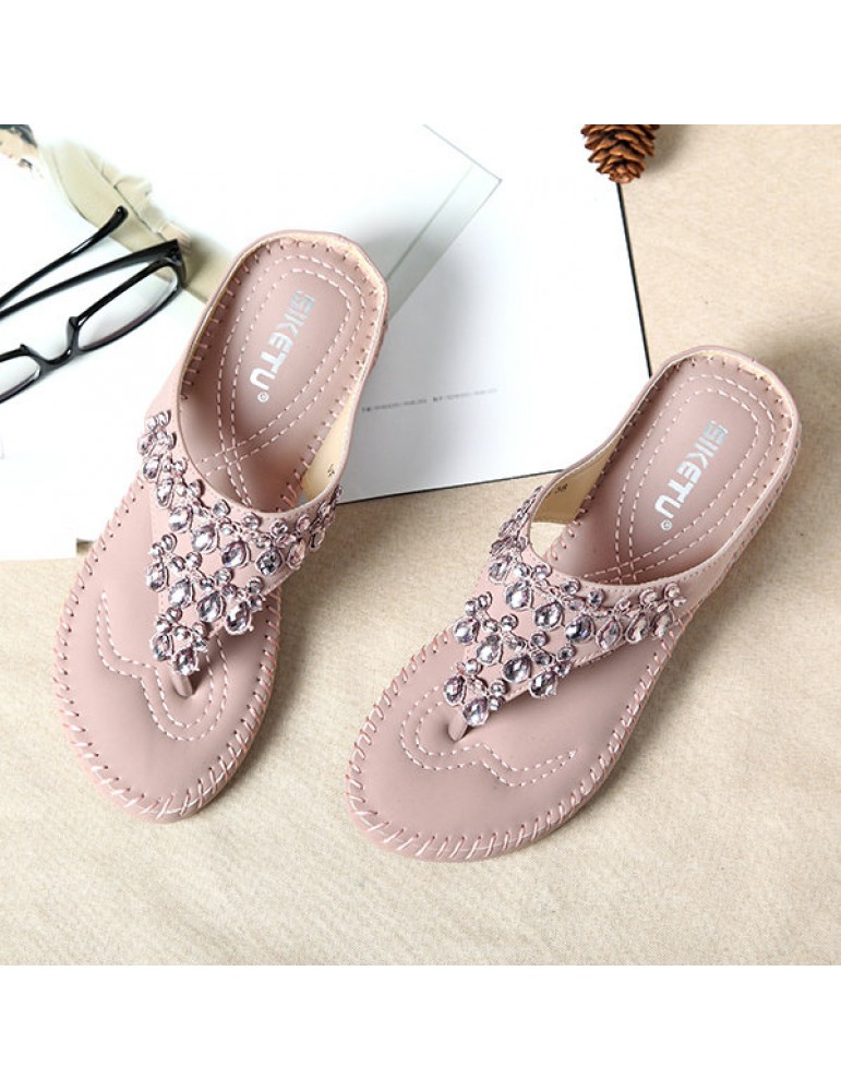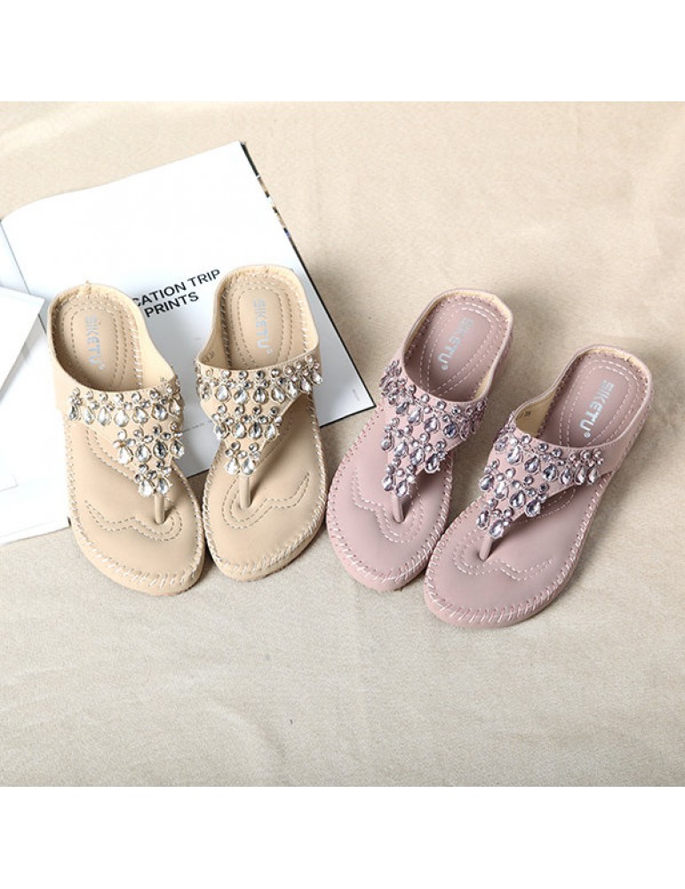Bohemia Bead Rhinestone Clip Toe Slip On Flat Beach Flip Flops Sandals