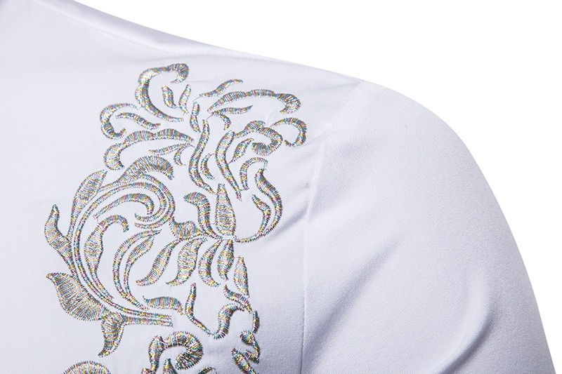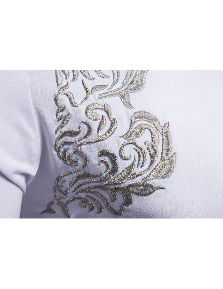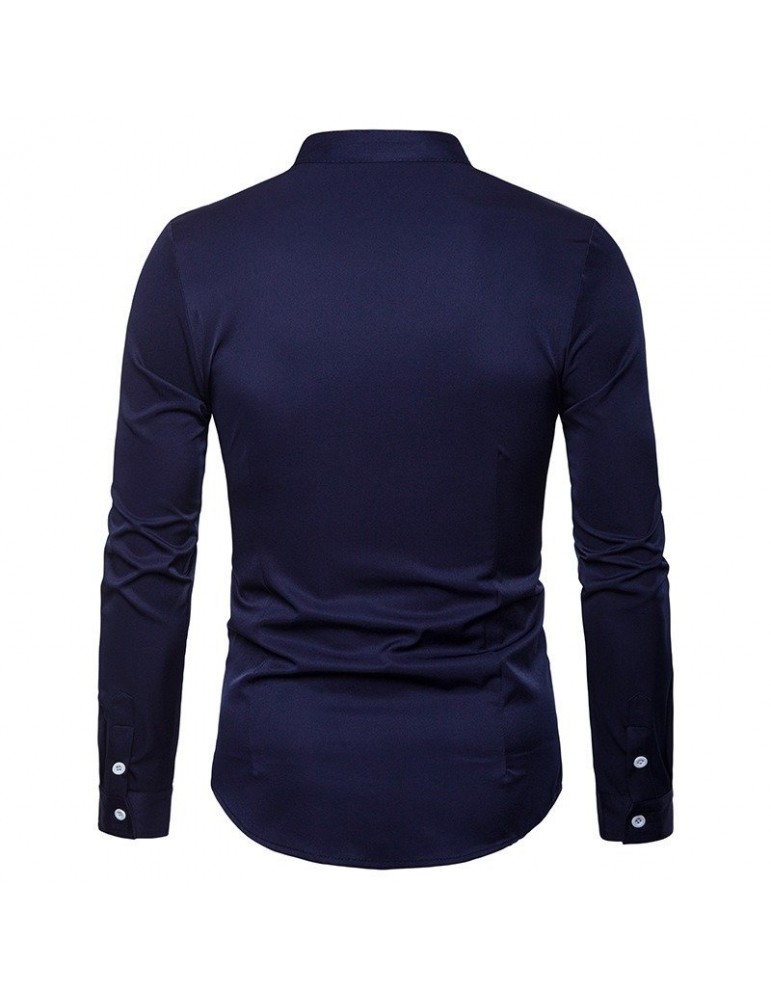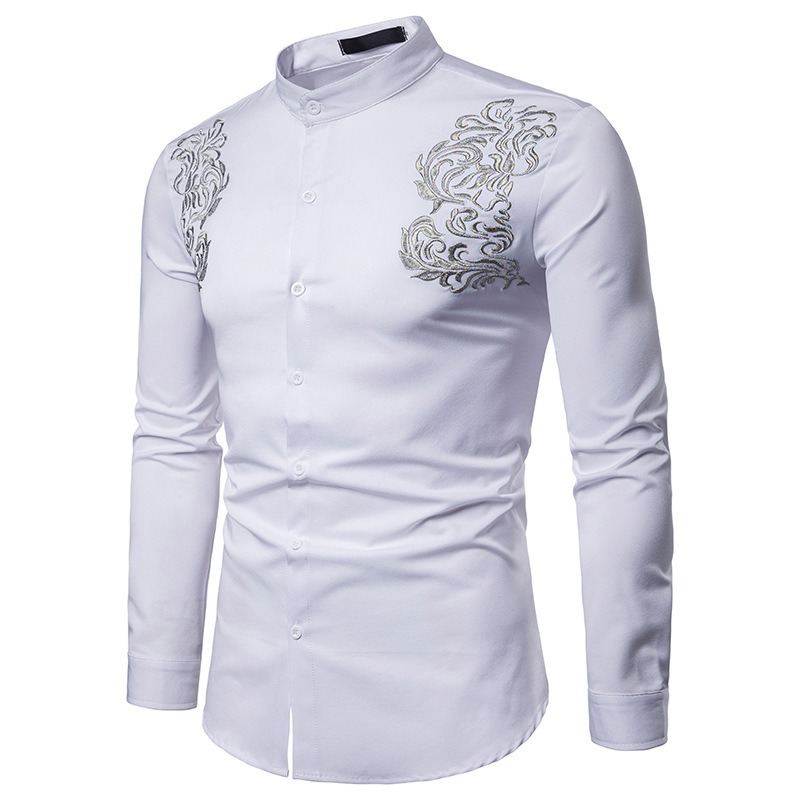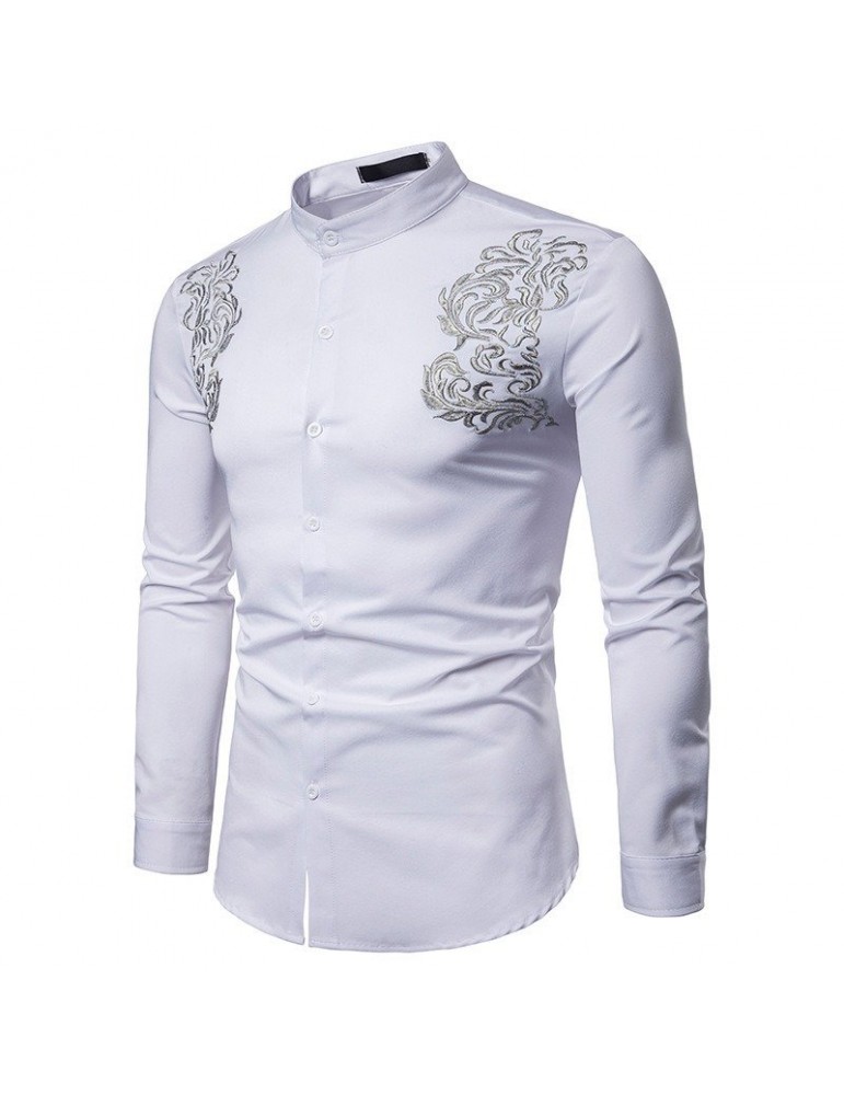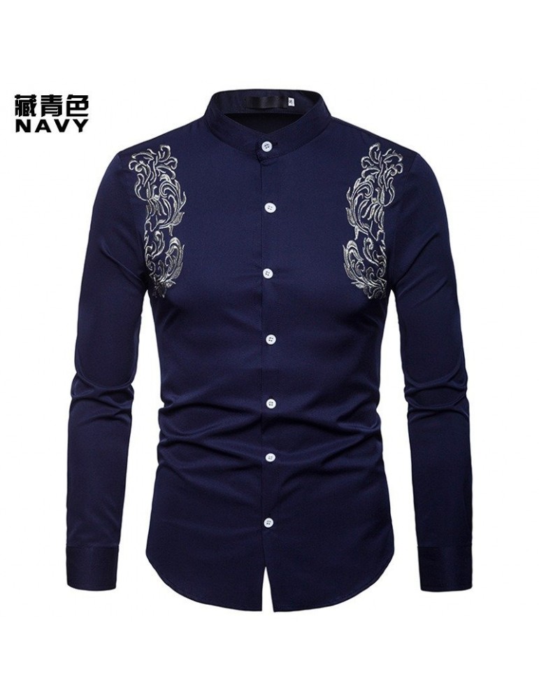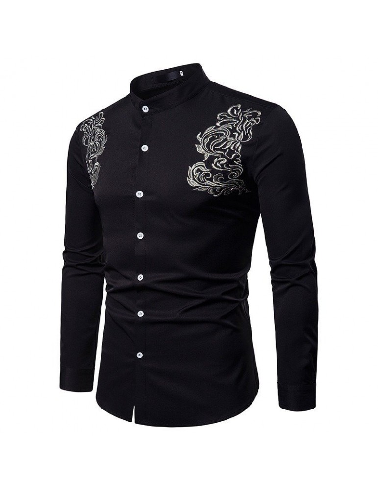 Men's Totem Embroidery Vintage Court Style Business Stand Collar Slim Fit Long Sleeve Shirt