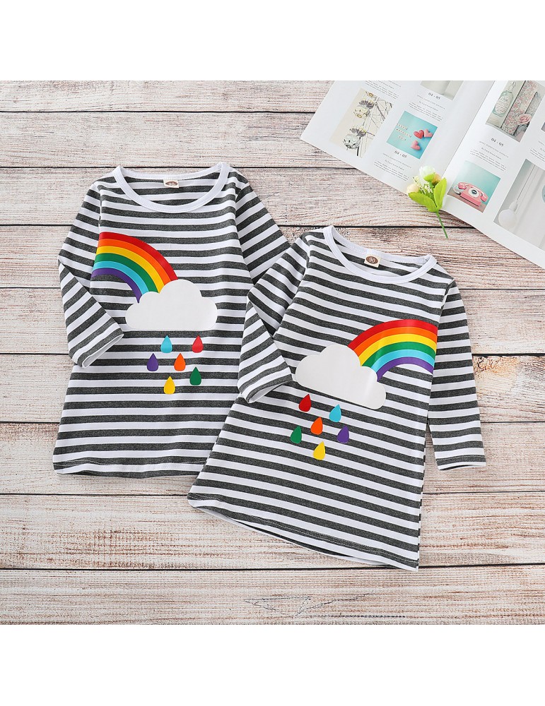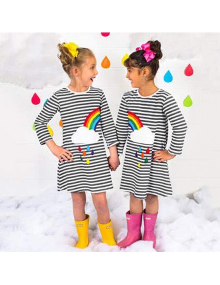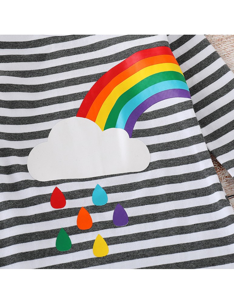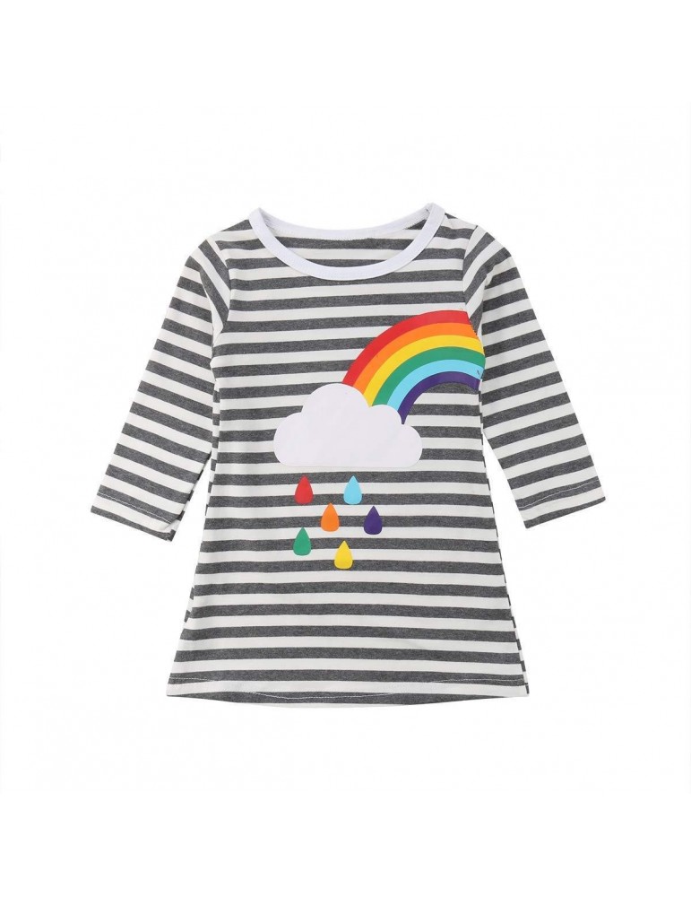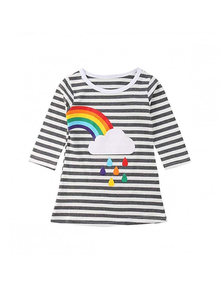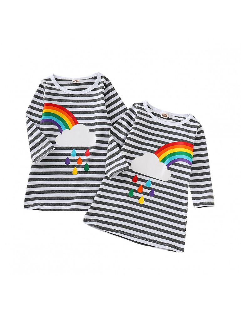 Rainbow Print Girls O-Neck Striped Dress For 2Y-11Y