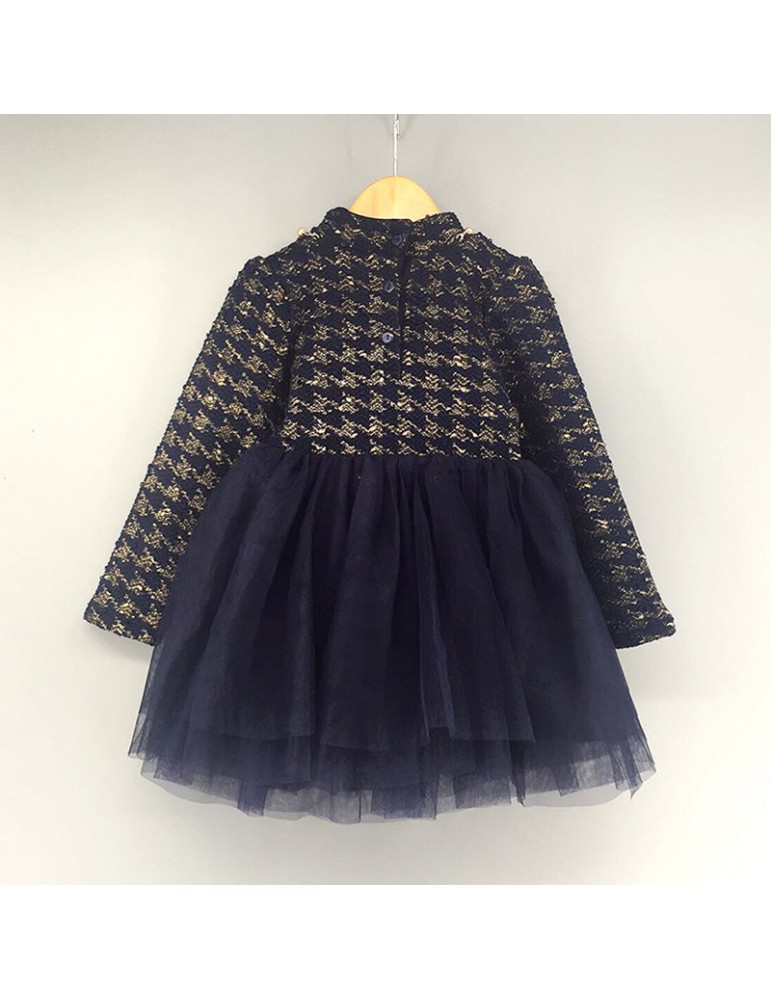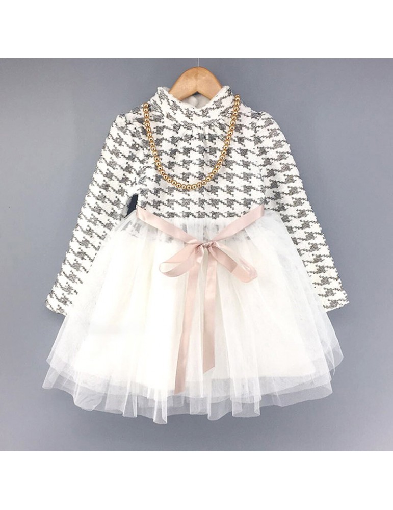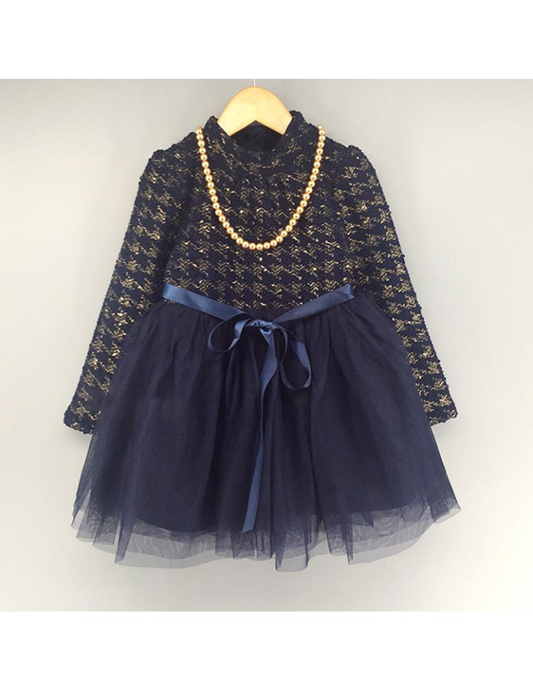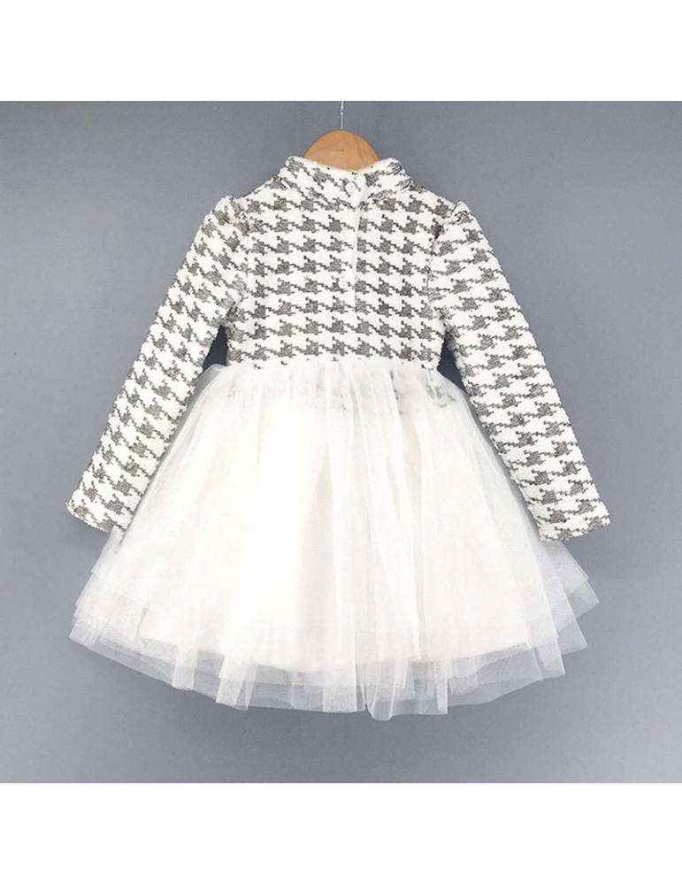 Long Sleeve Stand Collar Girls Patchwork Dress For 3-13Y