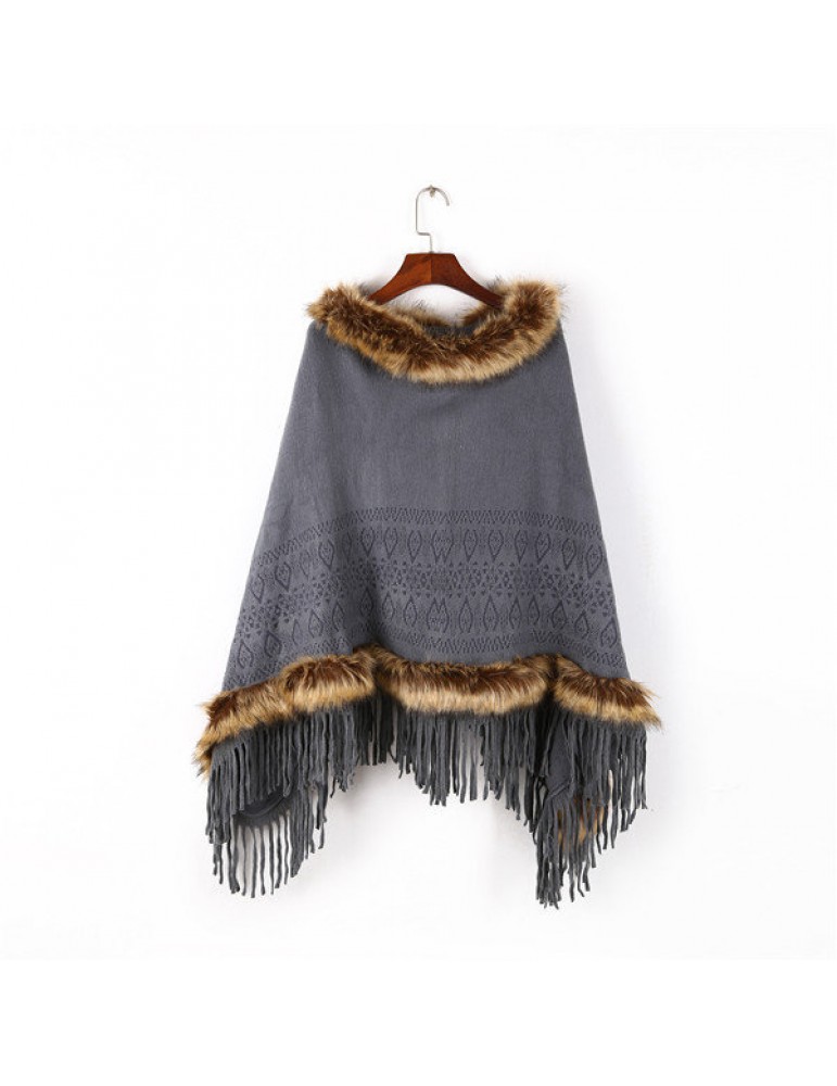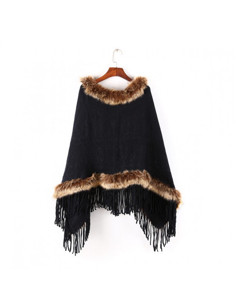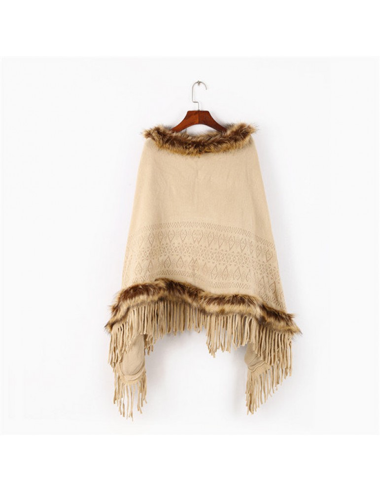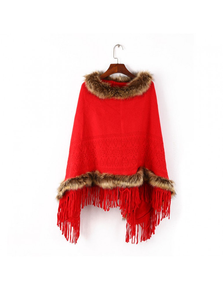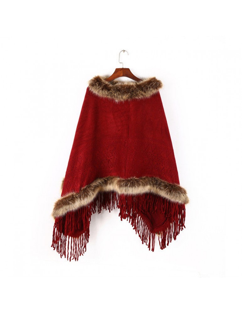 Women Tassel Solid Artificial Fur Poncho With Hood Warm Scarves Cloak Shawl Fashion Fur Hooded Shawl