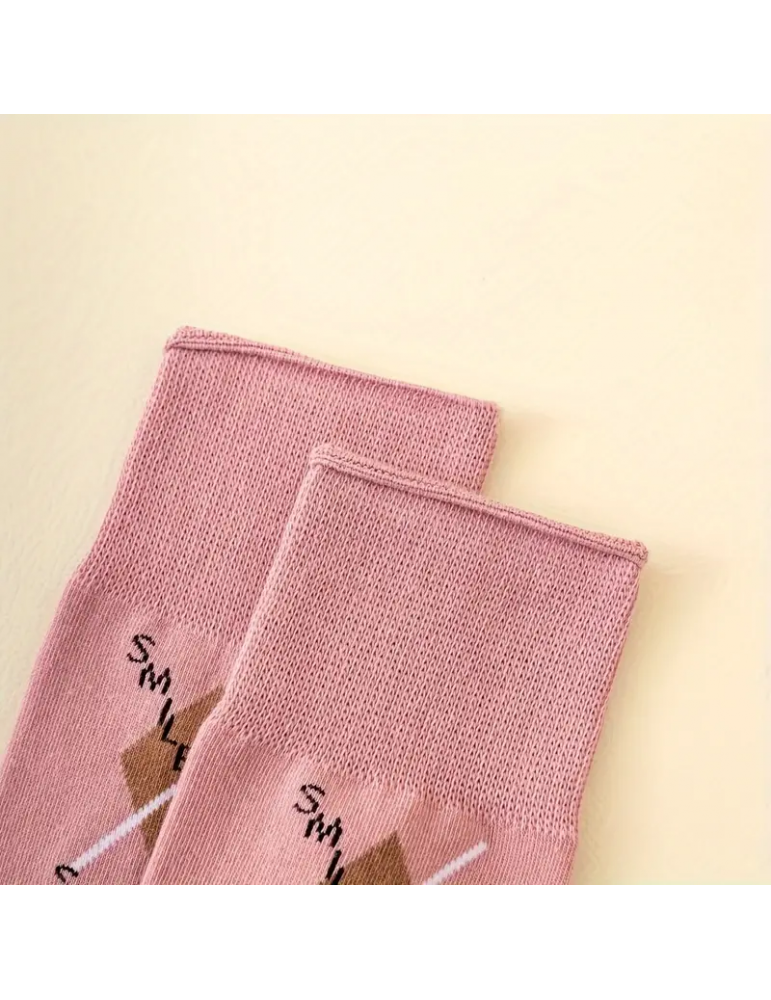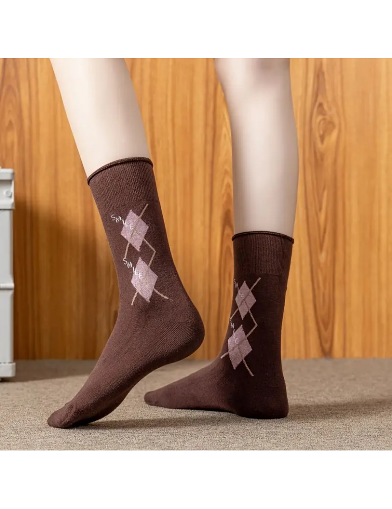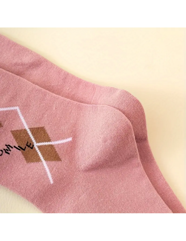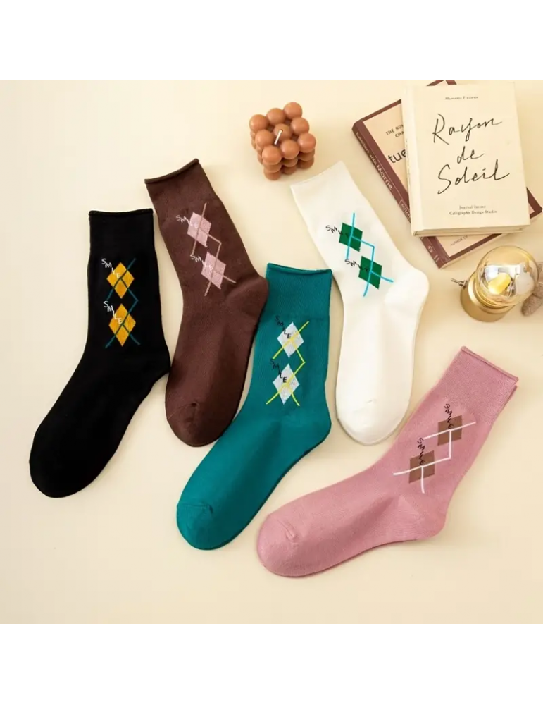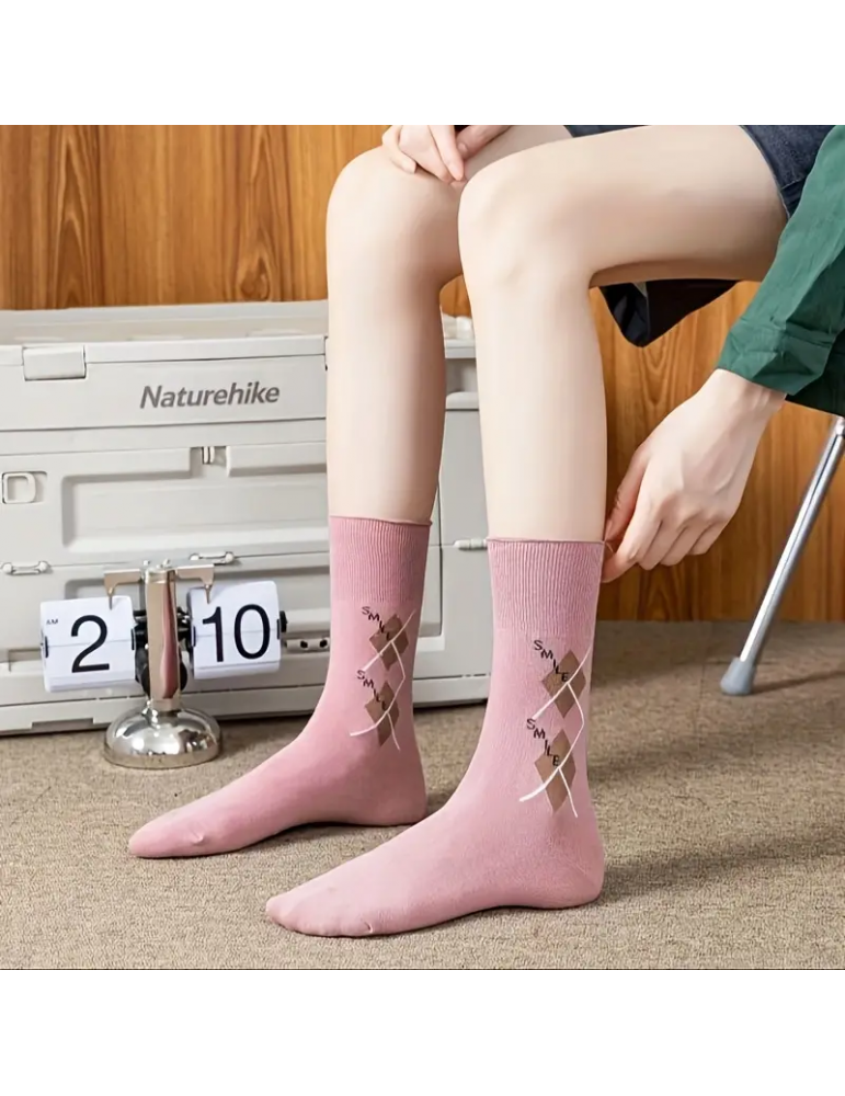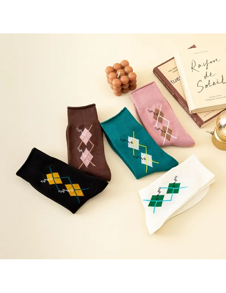 5 Pairs Argyle Pattern Socks, Retro & Warm Mid Tube Socks, Women's Stockings & Hosiery