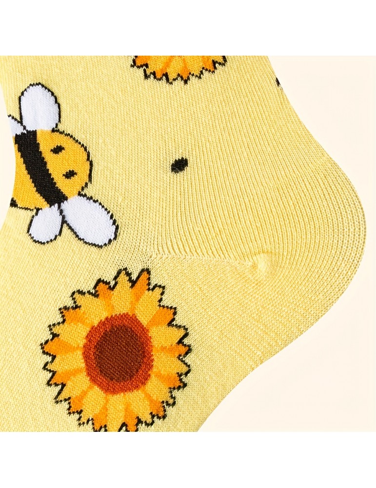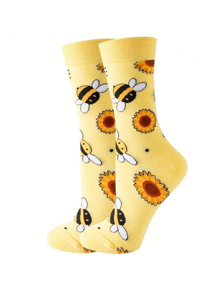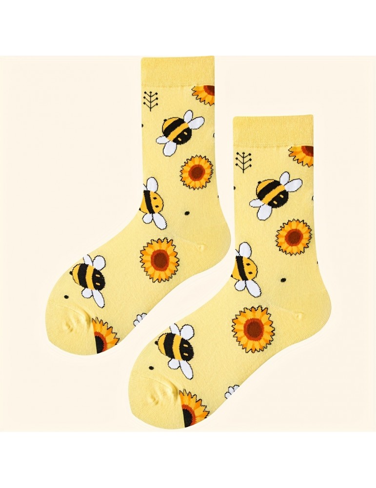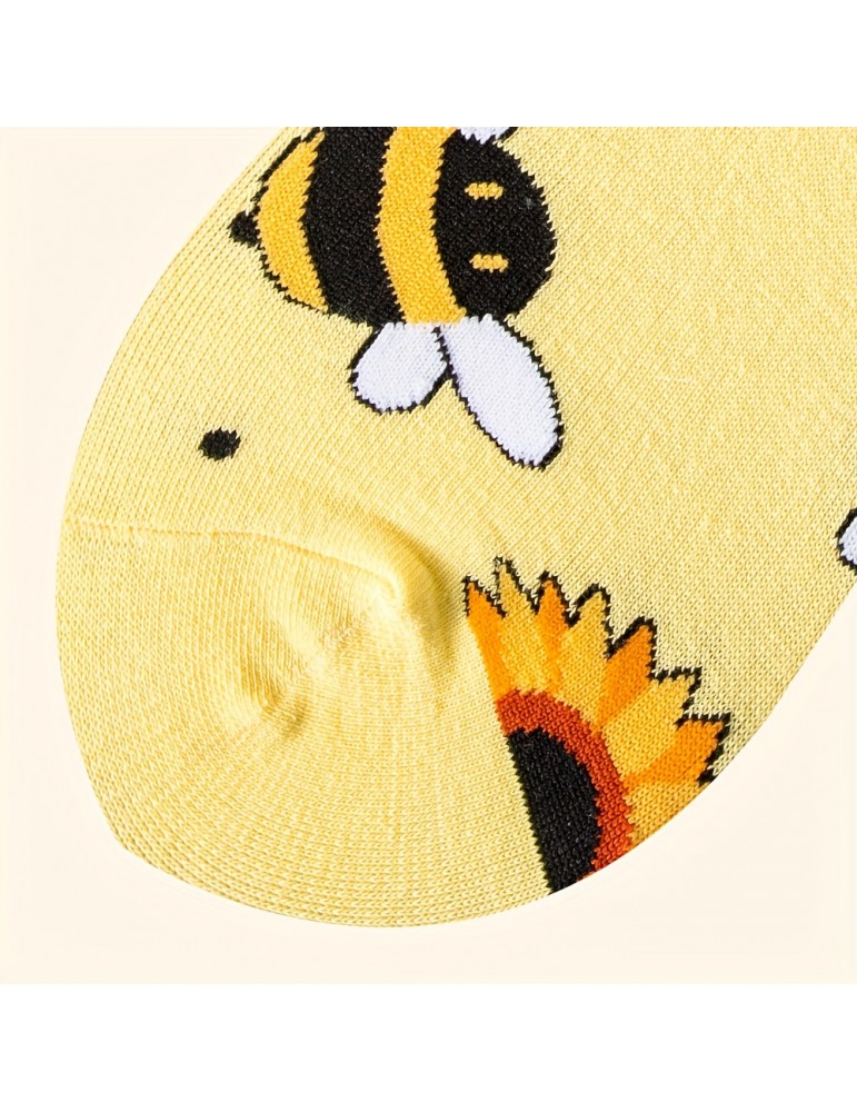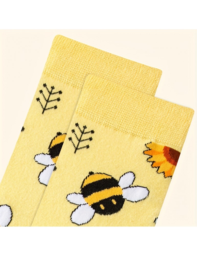 Music Festival Cartoon Bee Print Socks, Comfy & Cute Mid Tube Socks, Women's Stockings & Hosiery