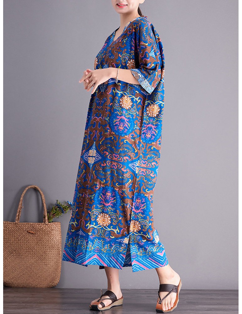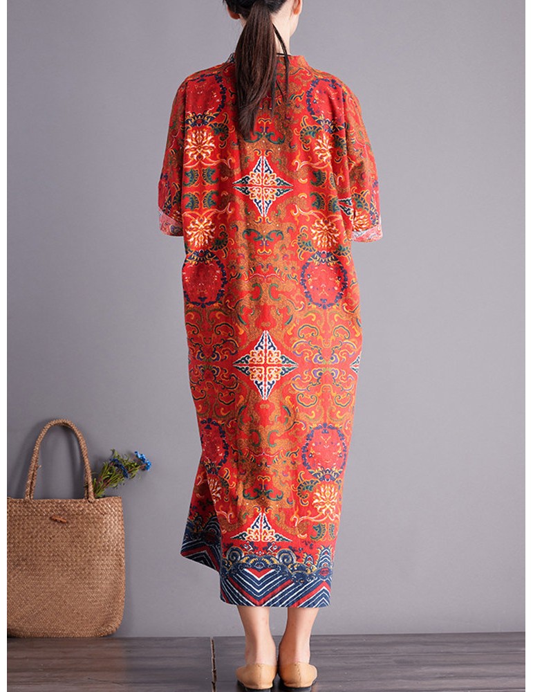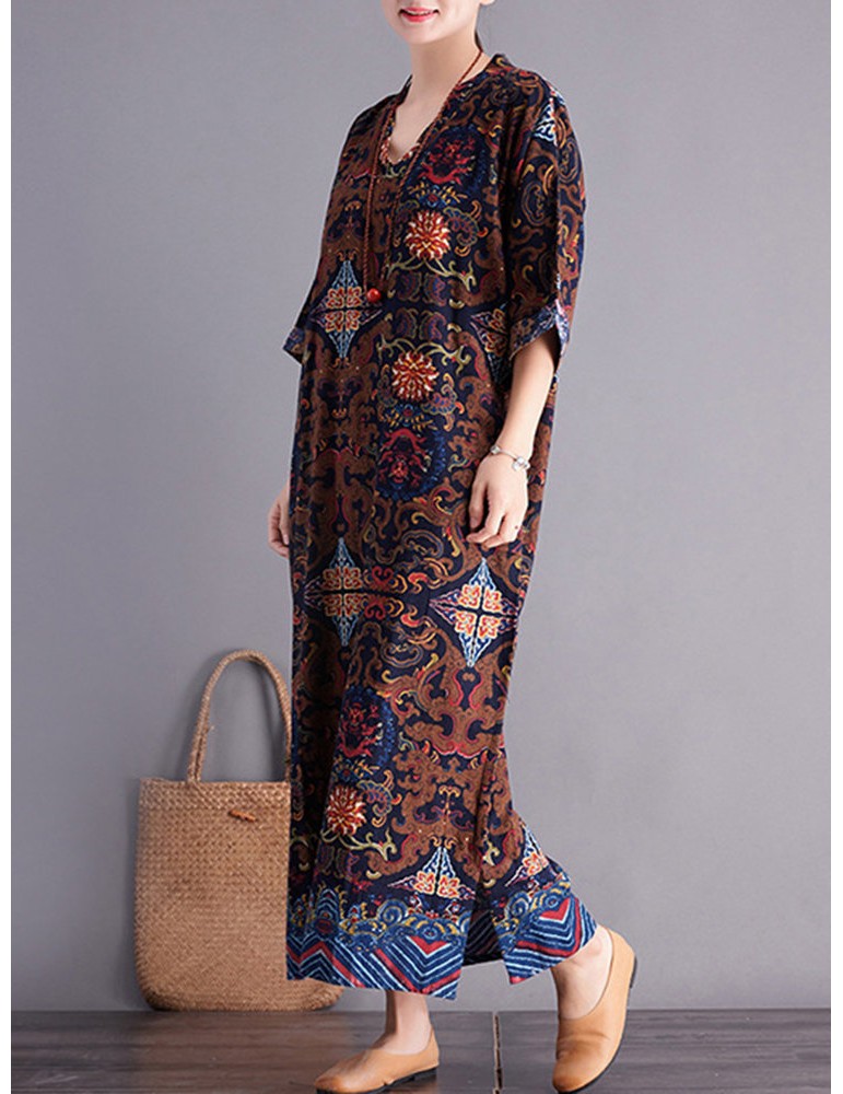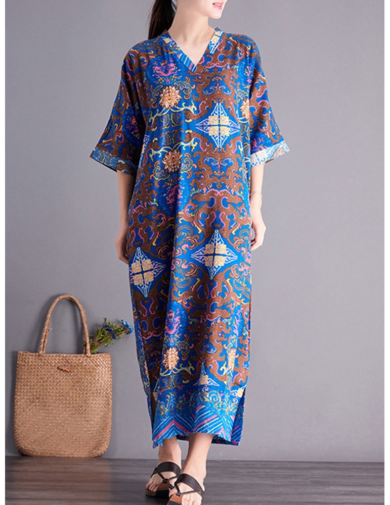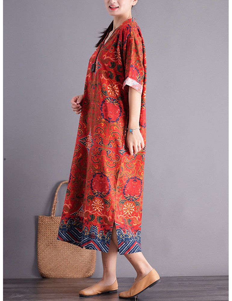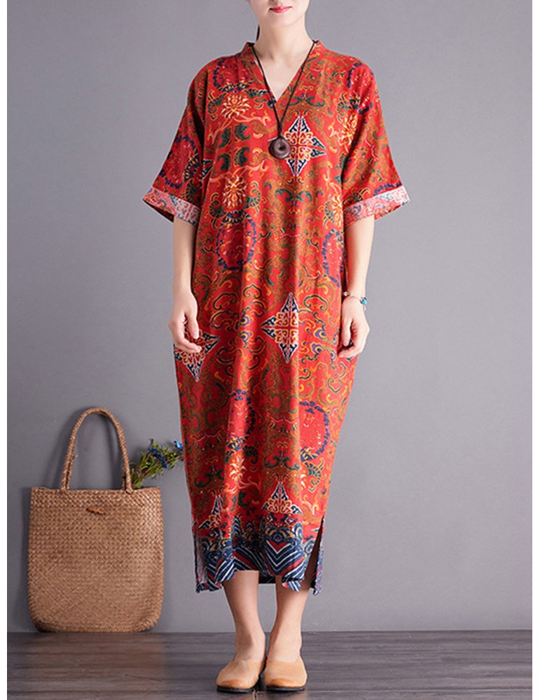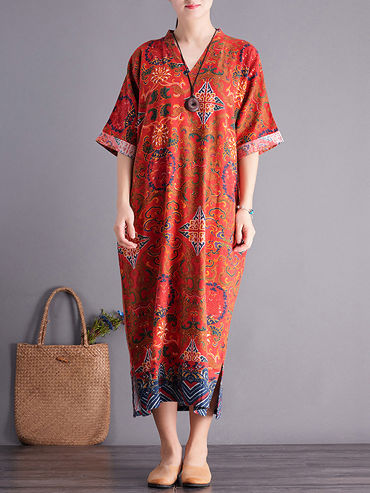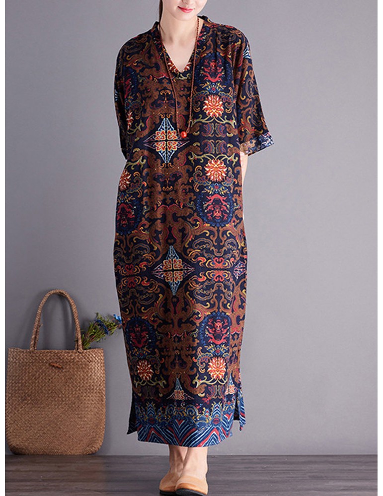Side Splited Folk Style Print Half Sleeve Vintage Dresses