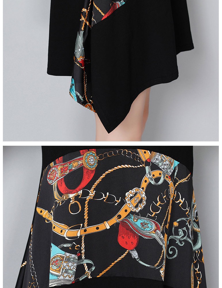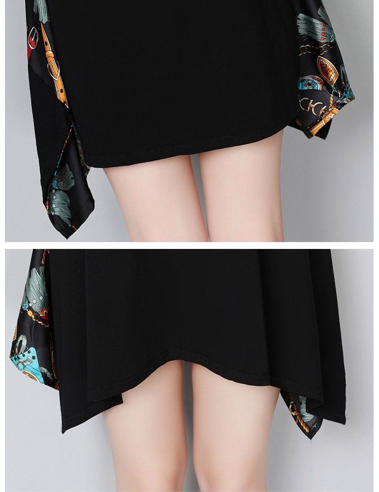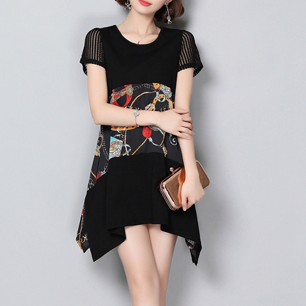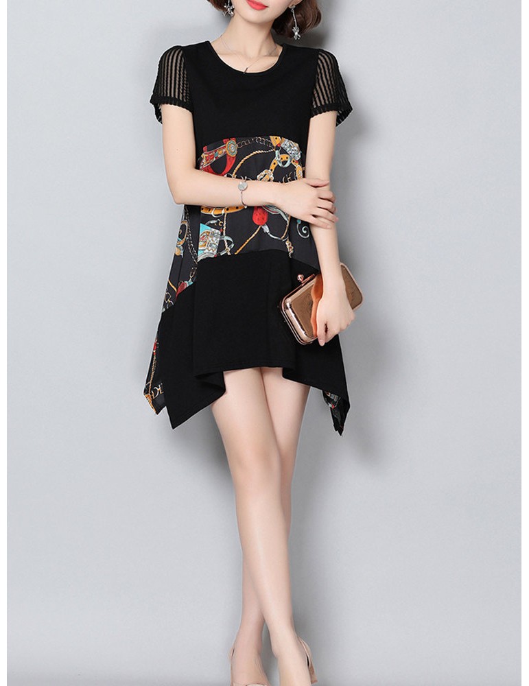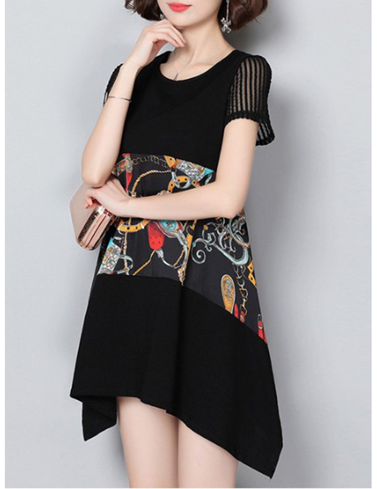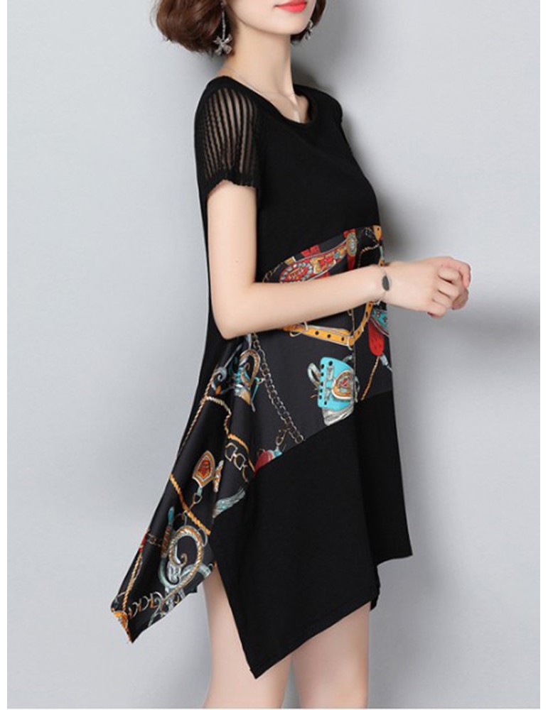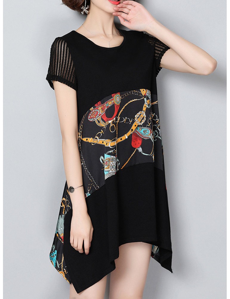Vintage Print Patchwork Irregular Short Sleeve Dresses For Women
