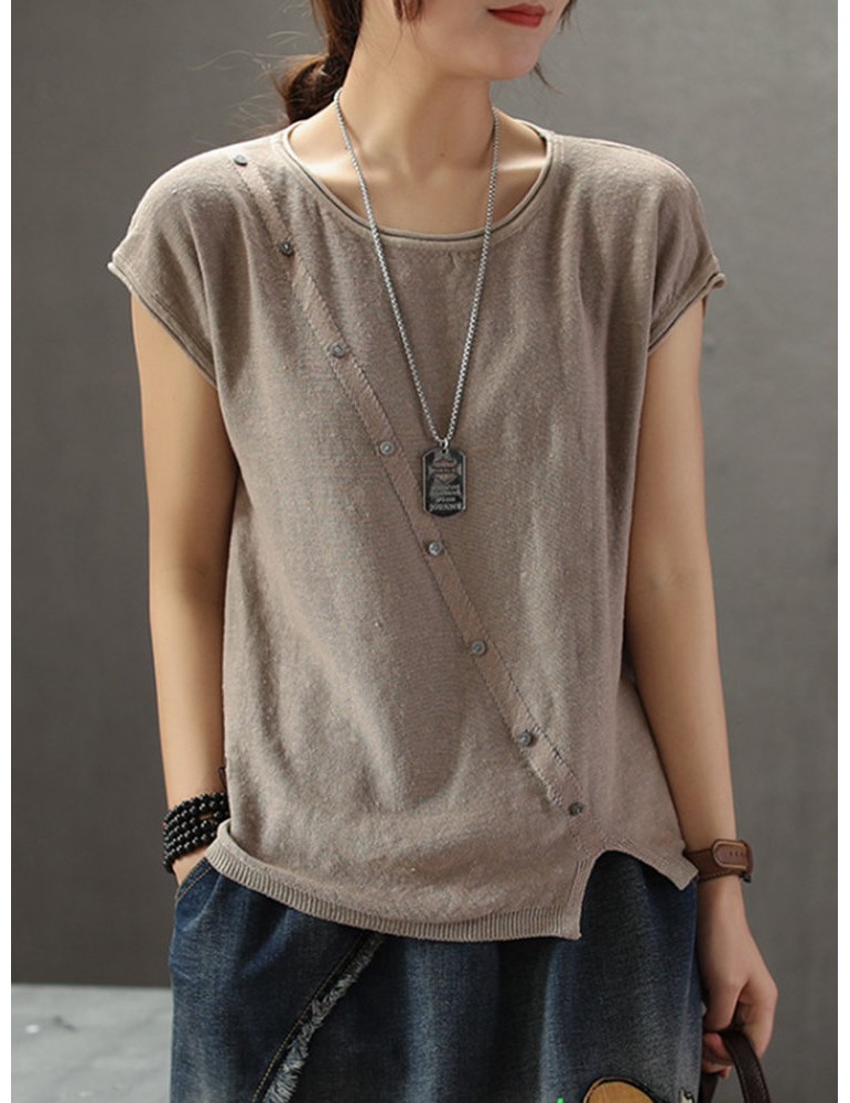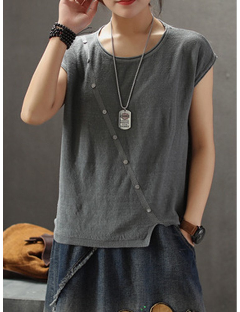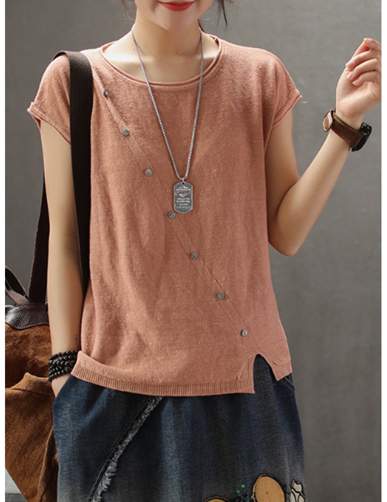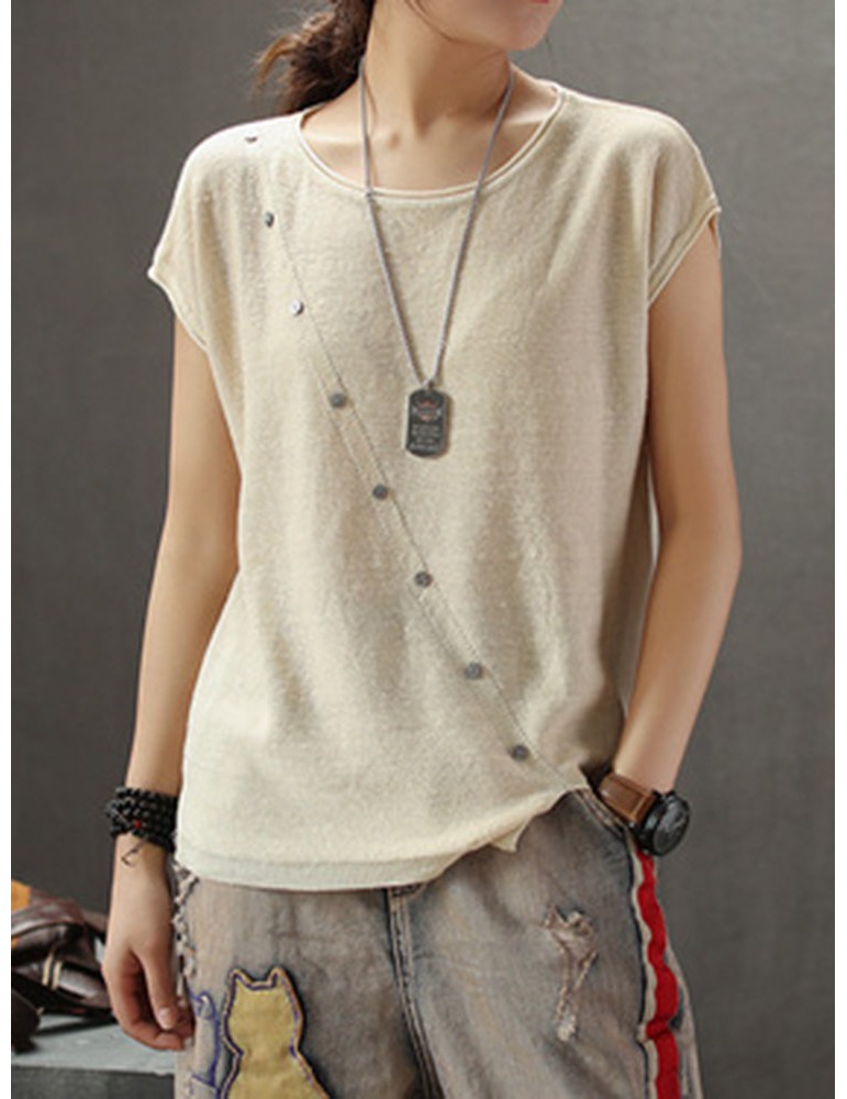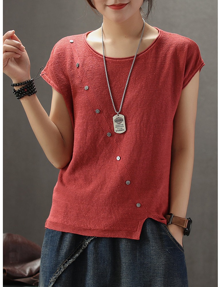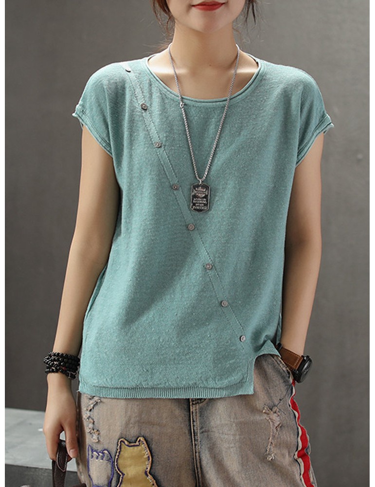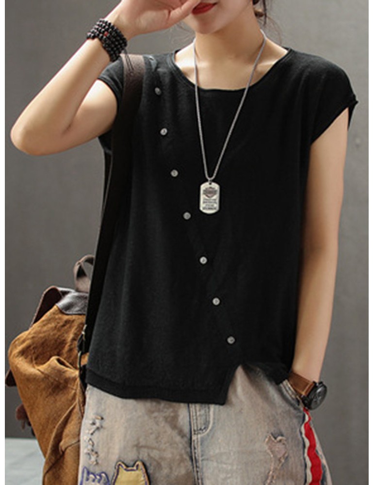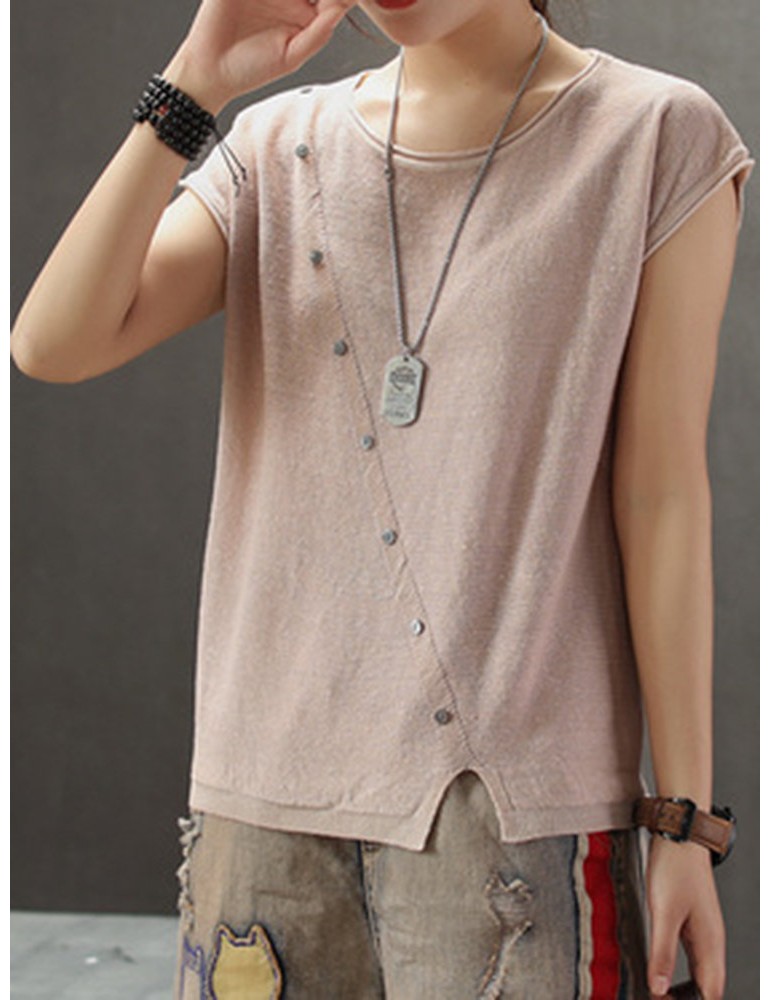 Women Button Splited Solid Color Short Sleeve Casual T-shirt