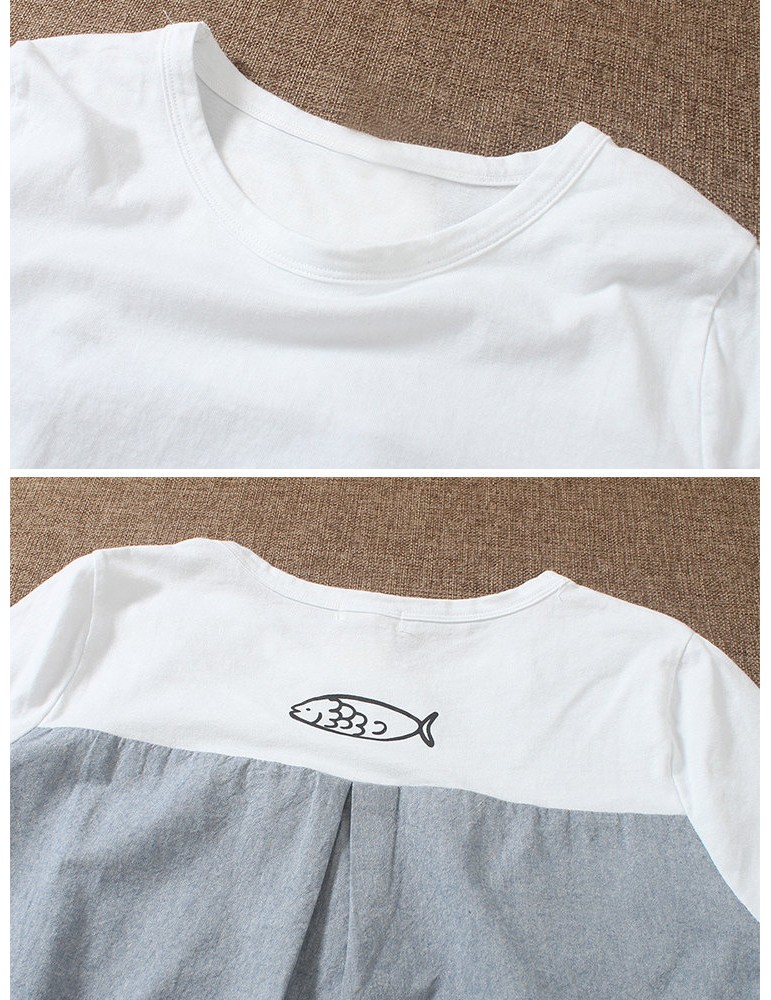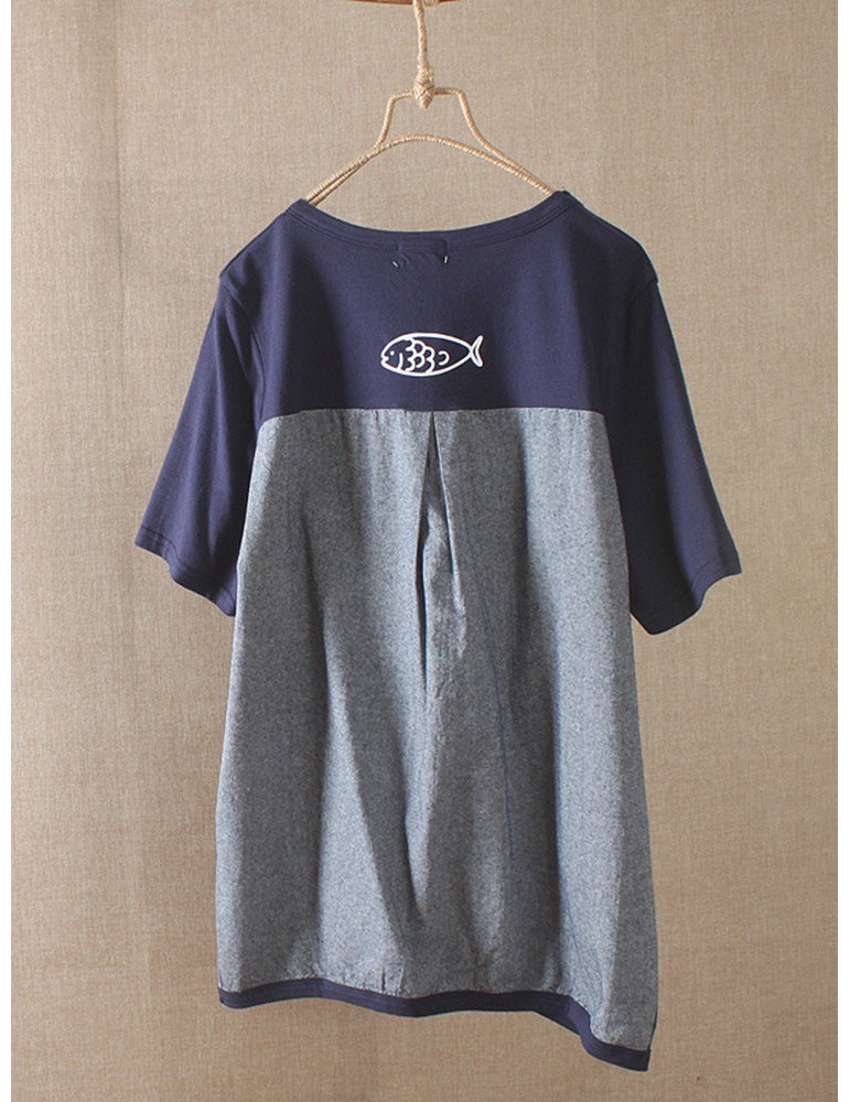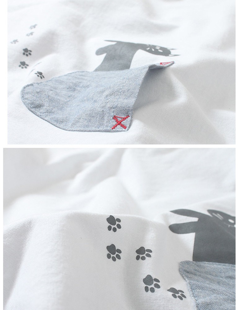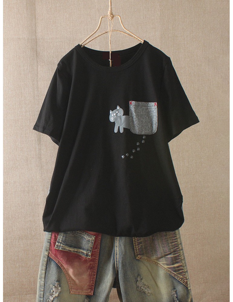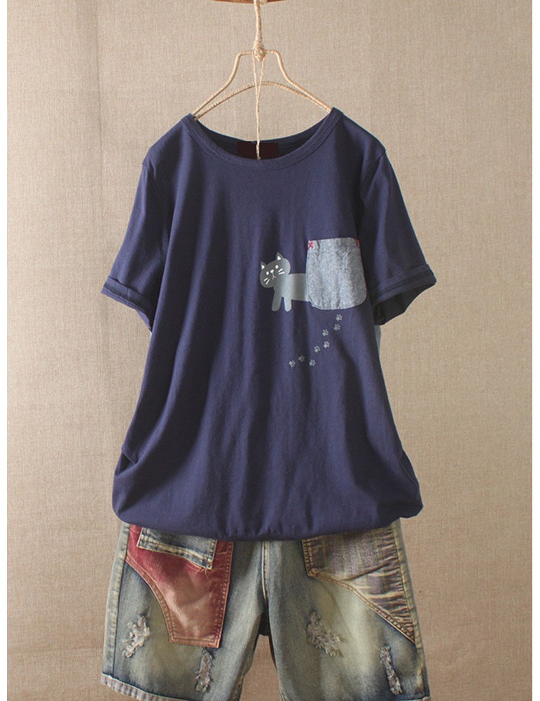 Women Cartoon Cat Print Patchwork Short Sleeve Casual T-shirt