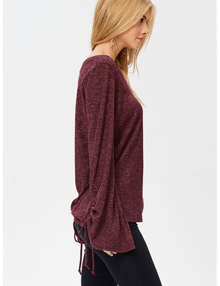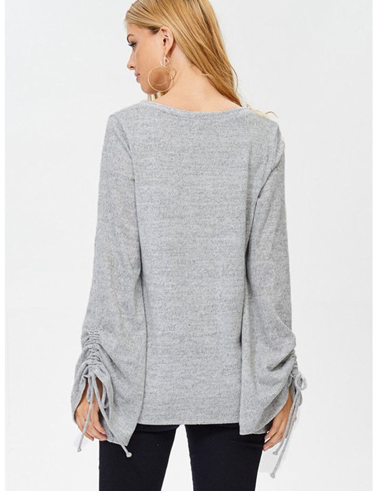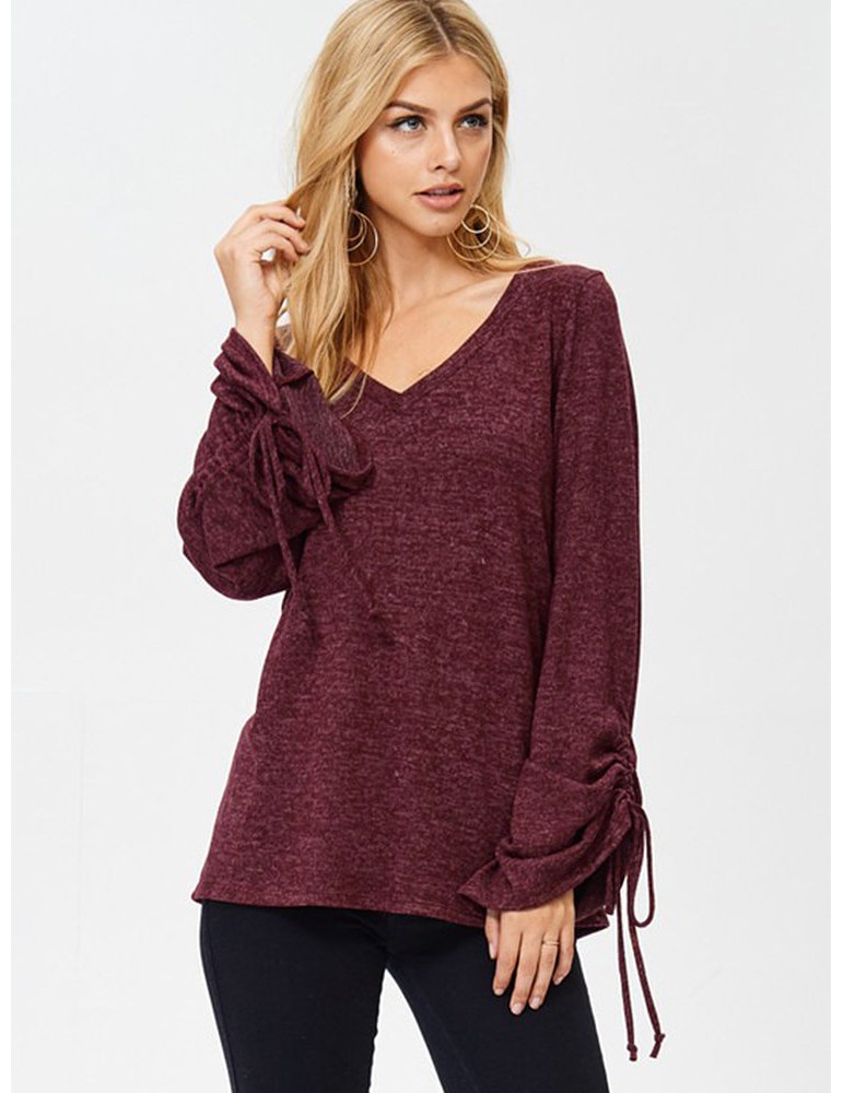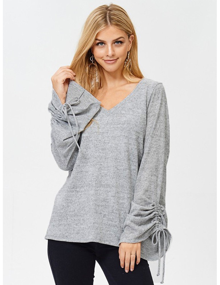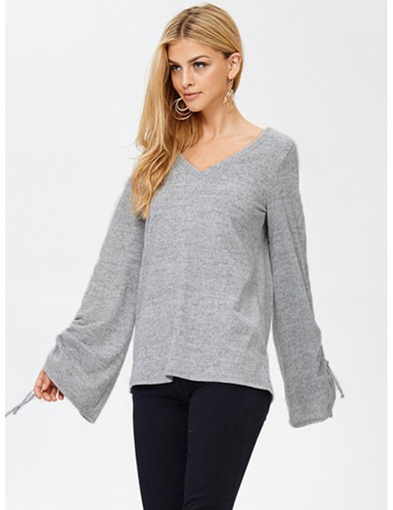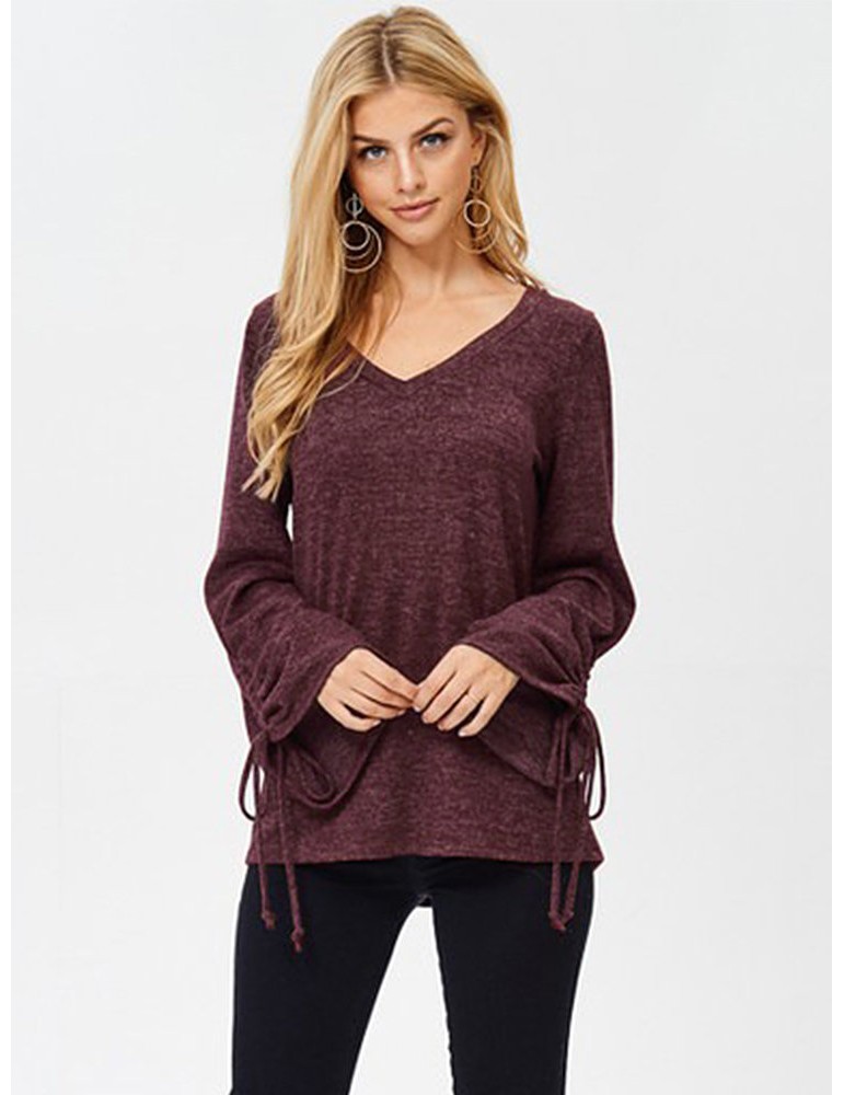 Women V-neck Pure Color Long Sleeve Knitted T-shirts