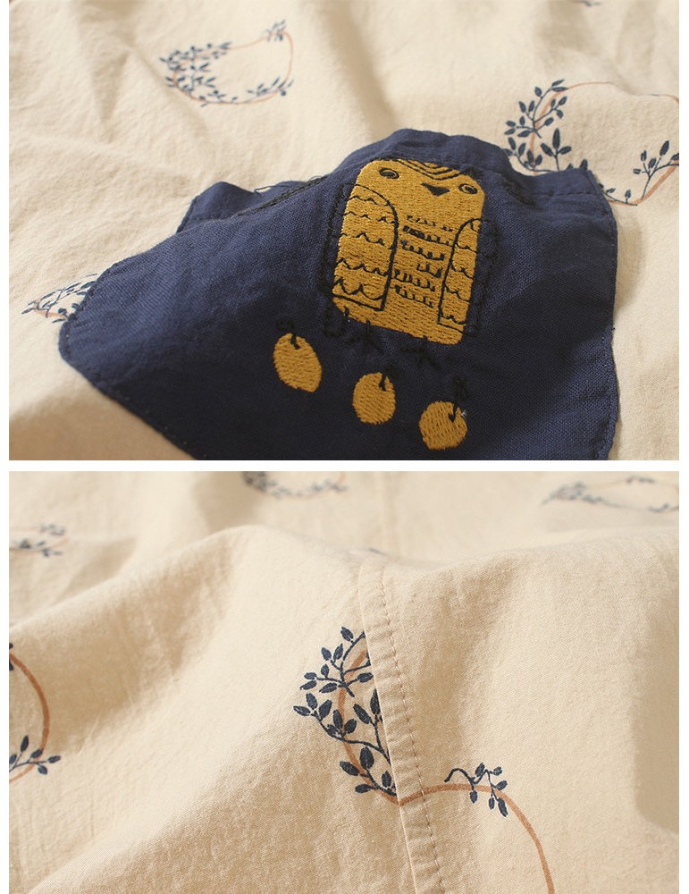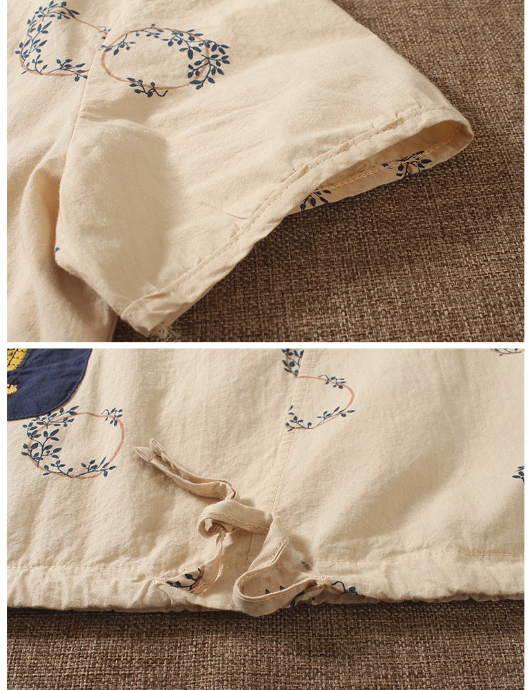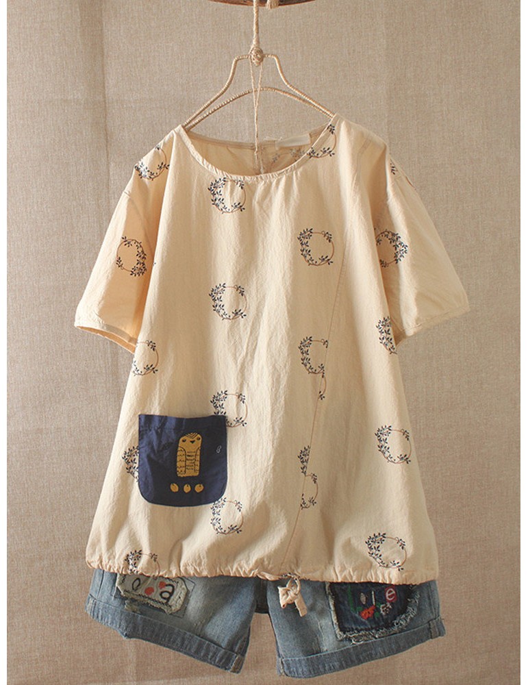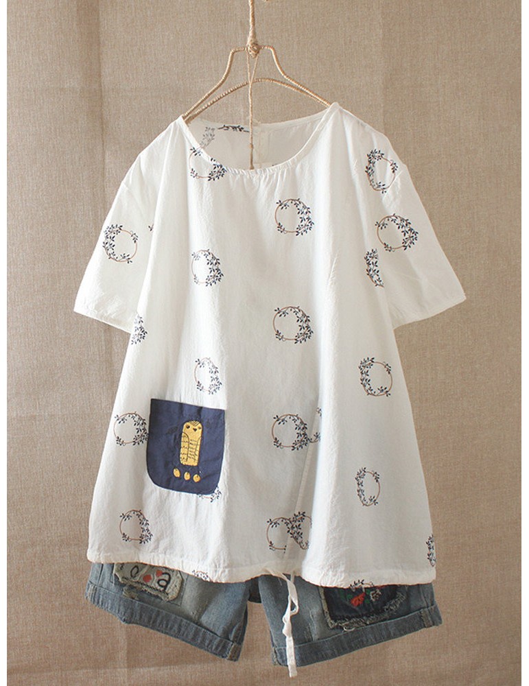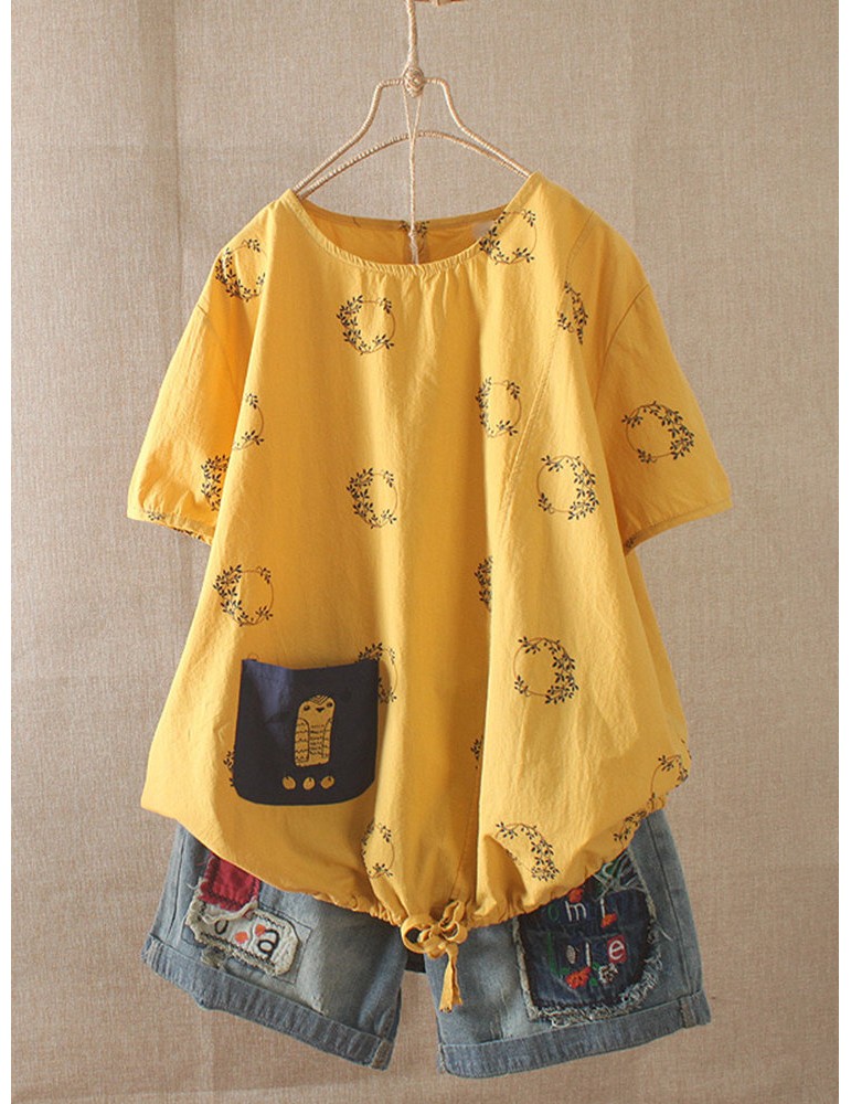Women Print Cartoon Embroidery Drawstring Short Sleeve T-shirt