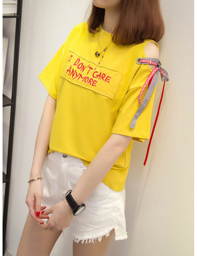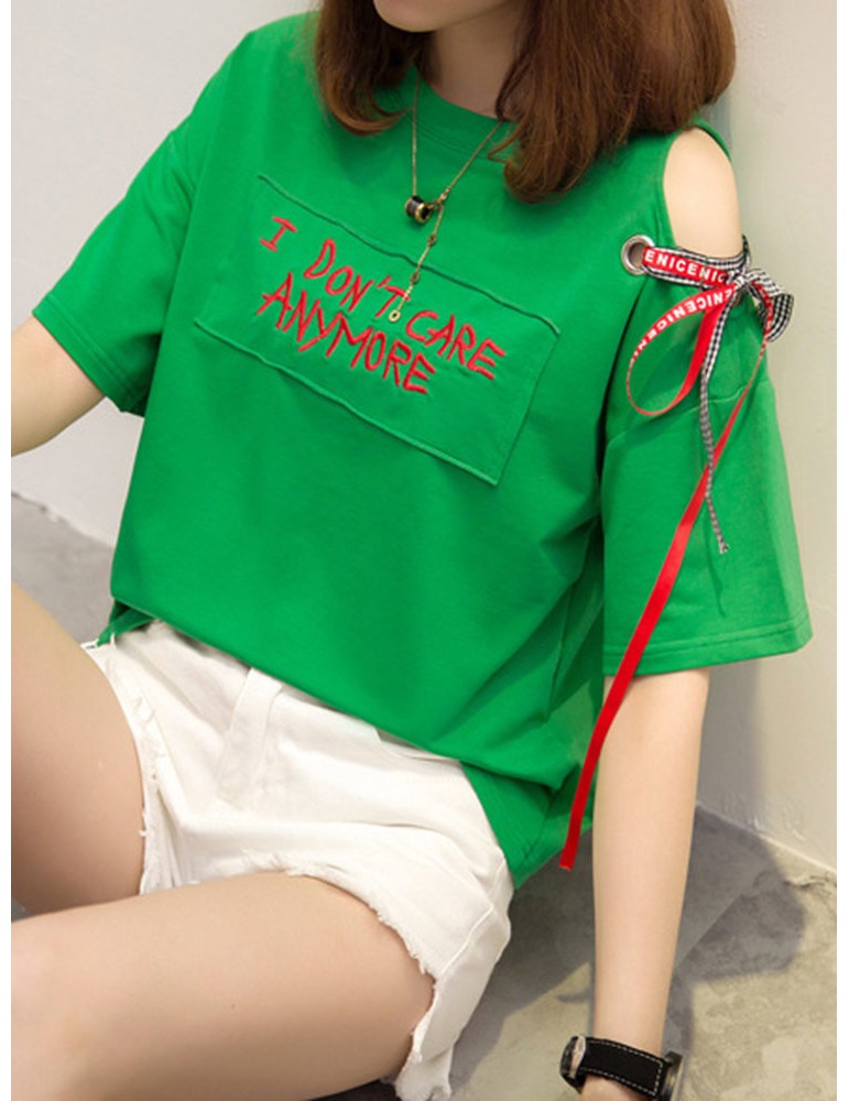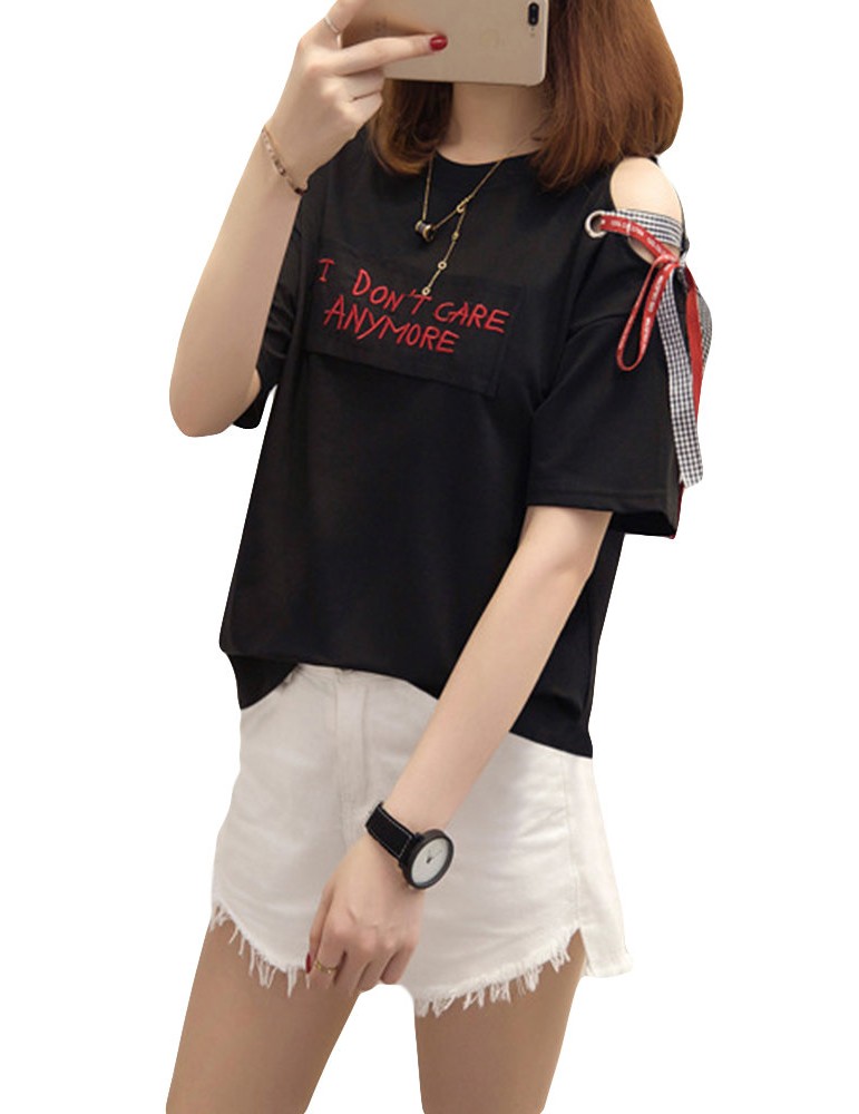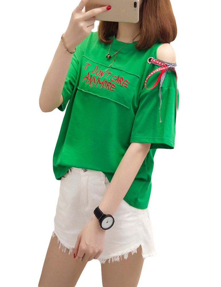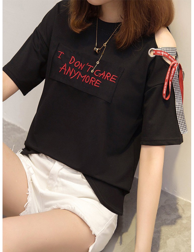 Letters Patchwork Embroidered Off-shoulder O-neck T-shirts