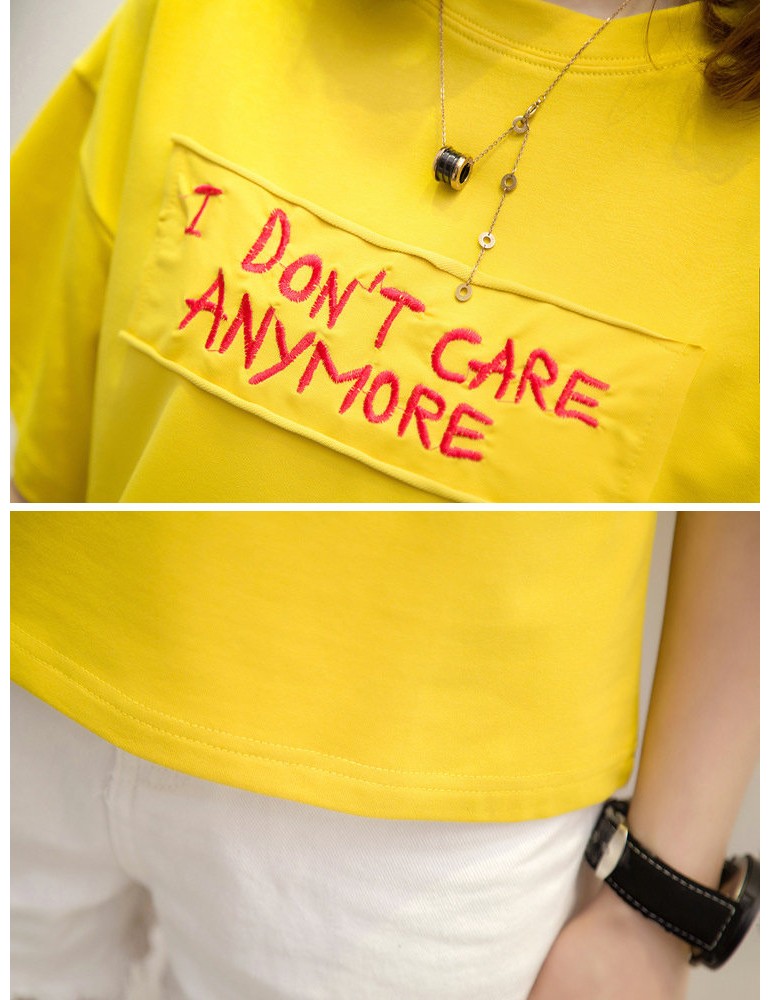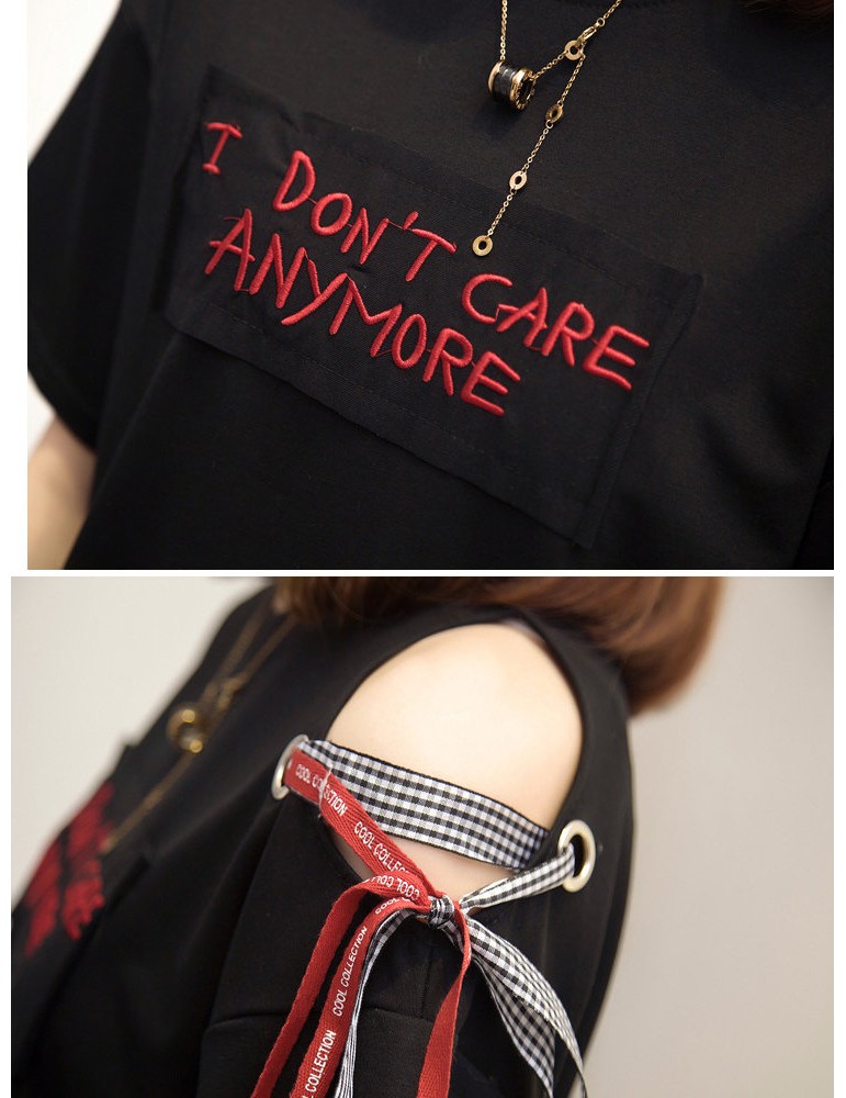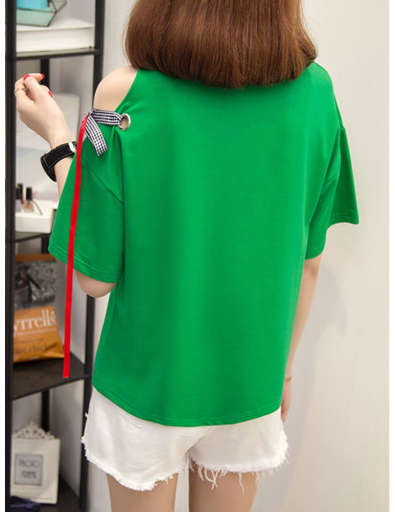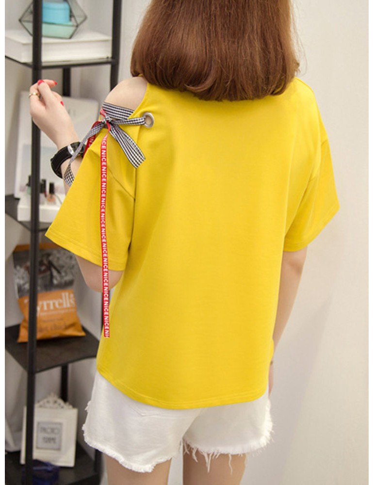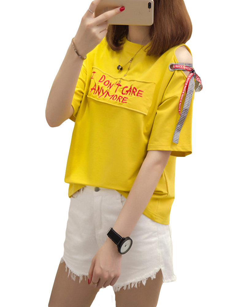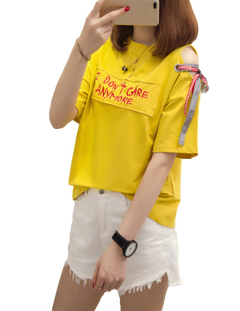 Letters Patchwork Embroidered Off-shoulder O-neck T-shirts