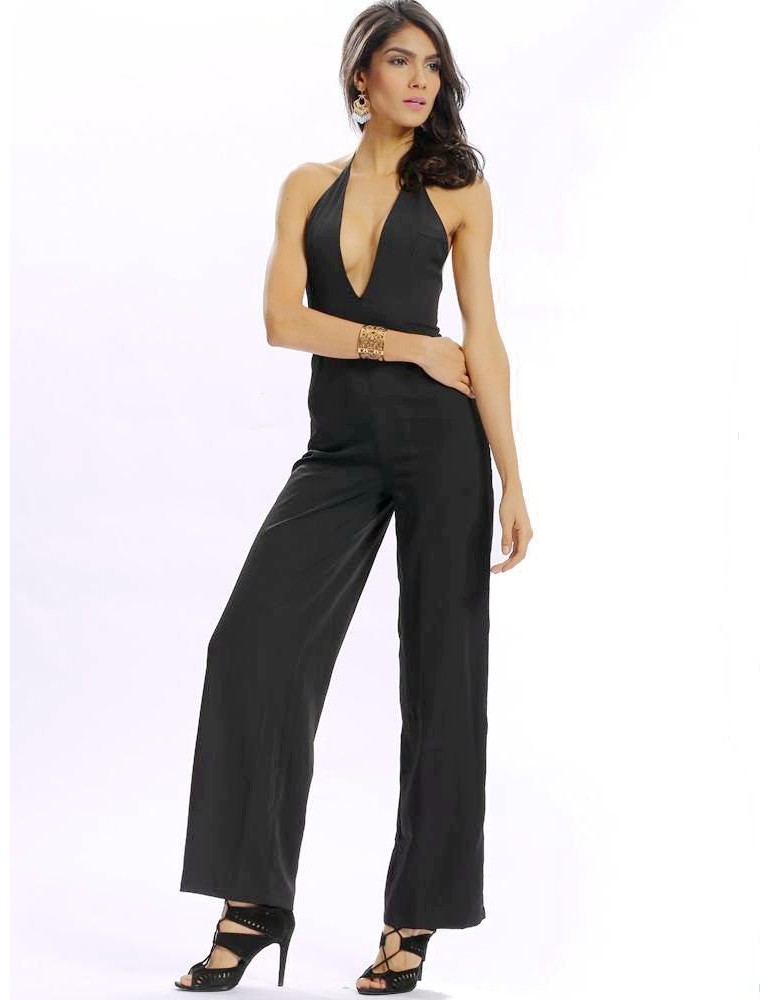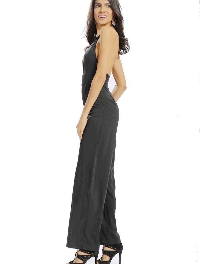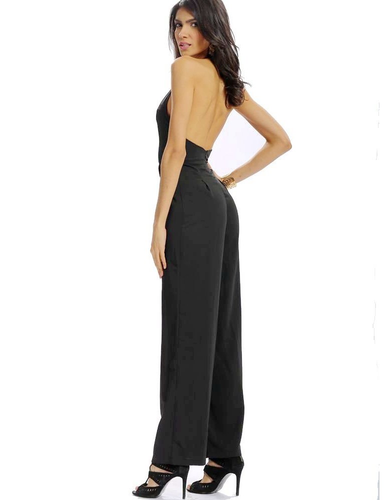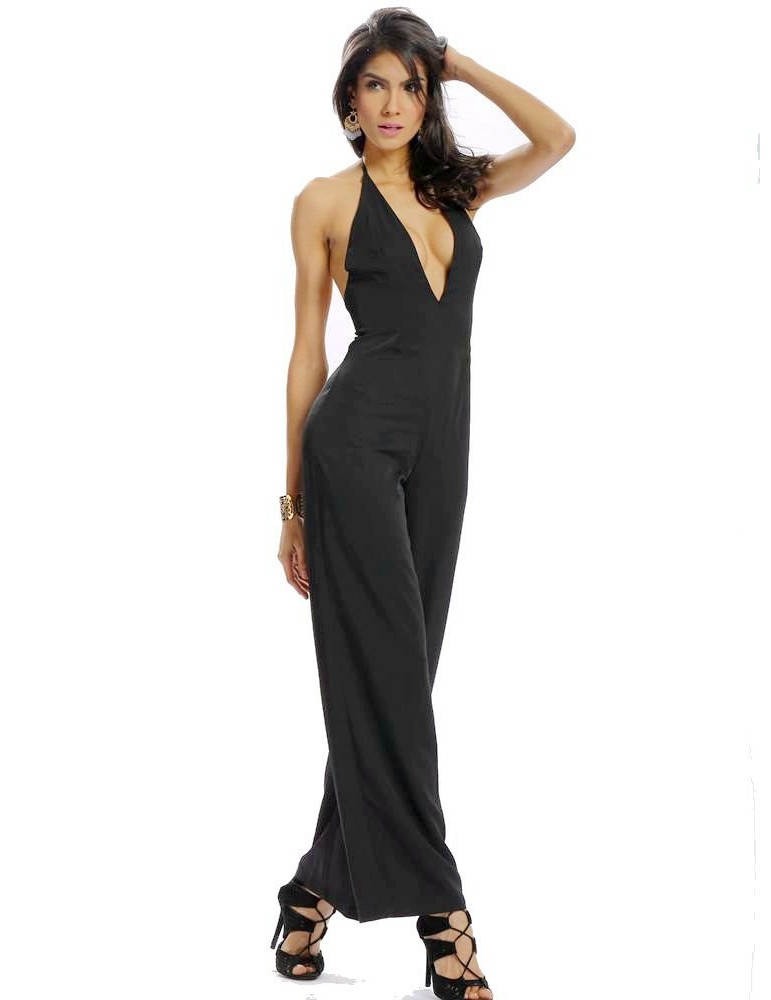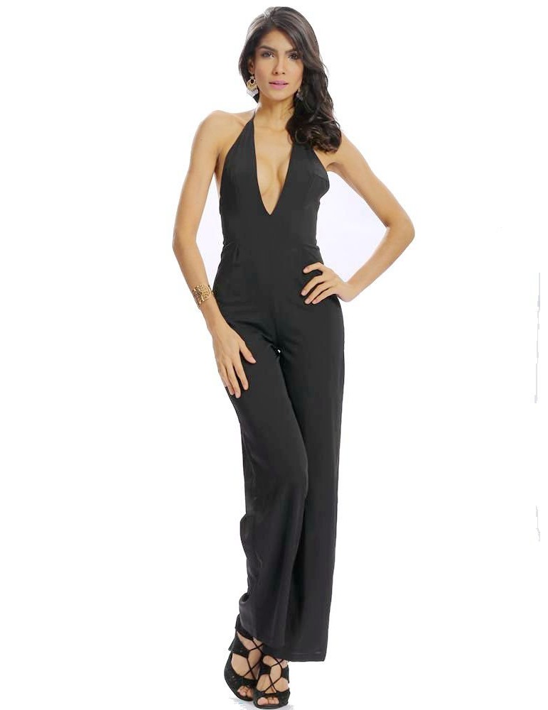 Women Casual Deep V Halter Backless Sleeveless Loose Jumpsuit