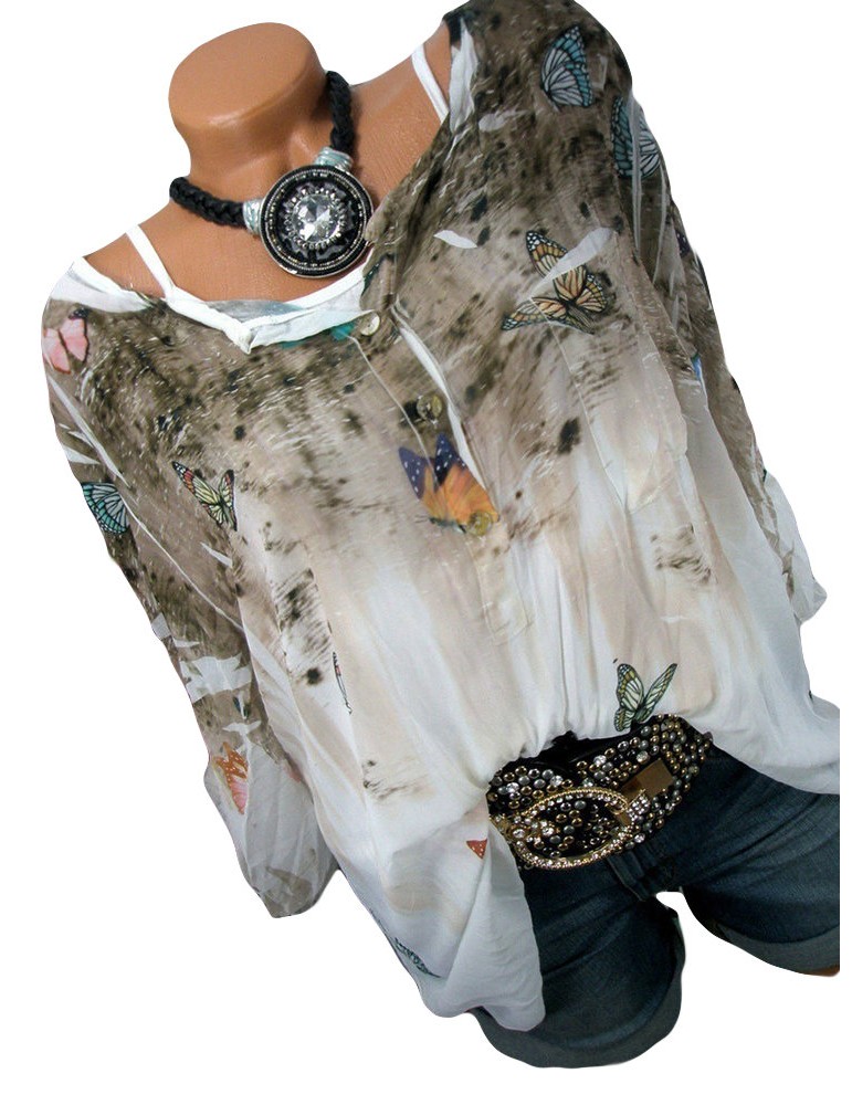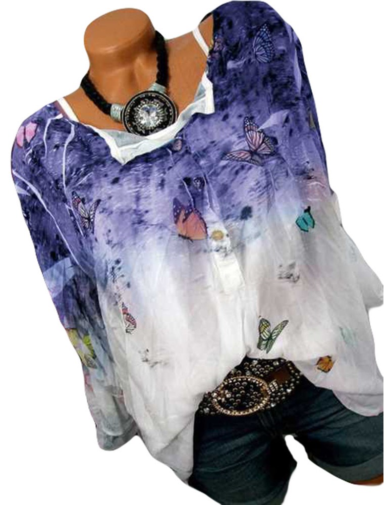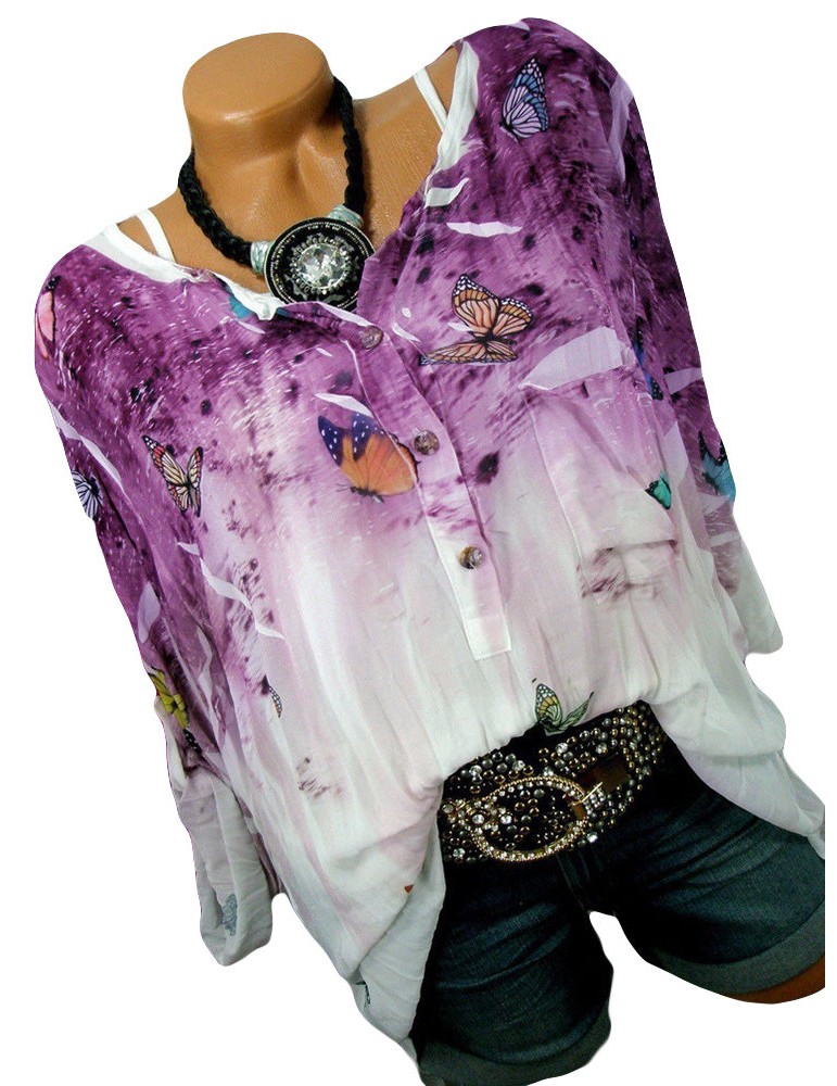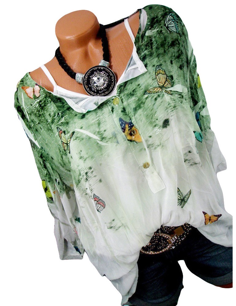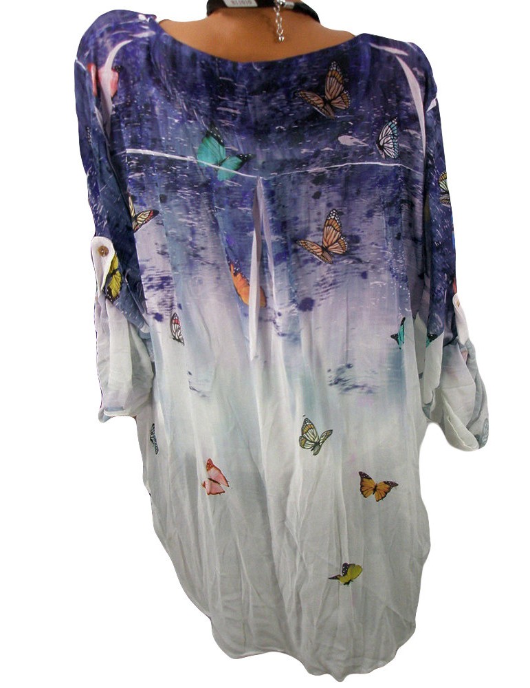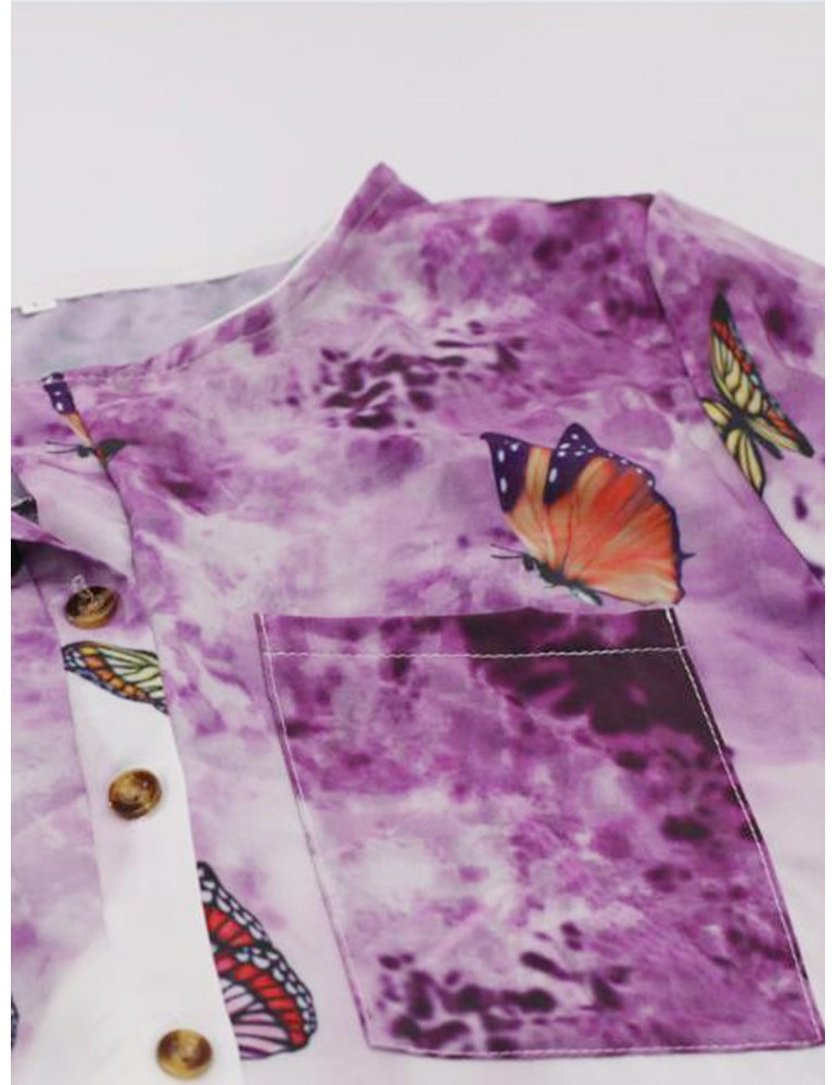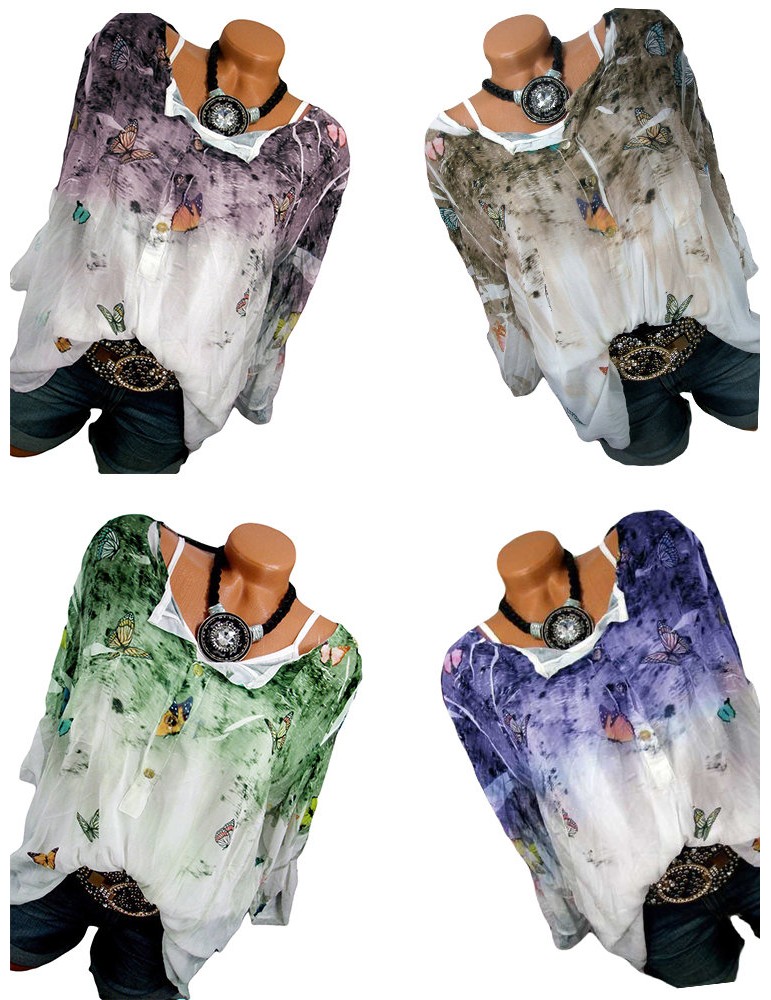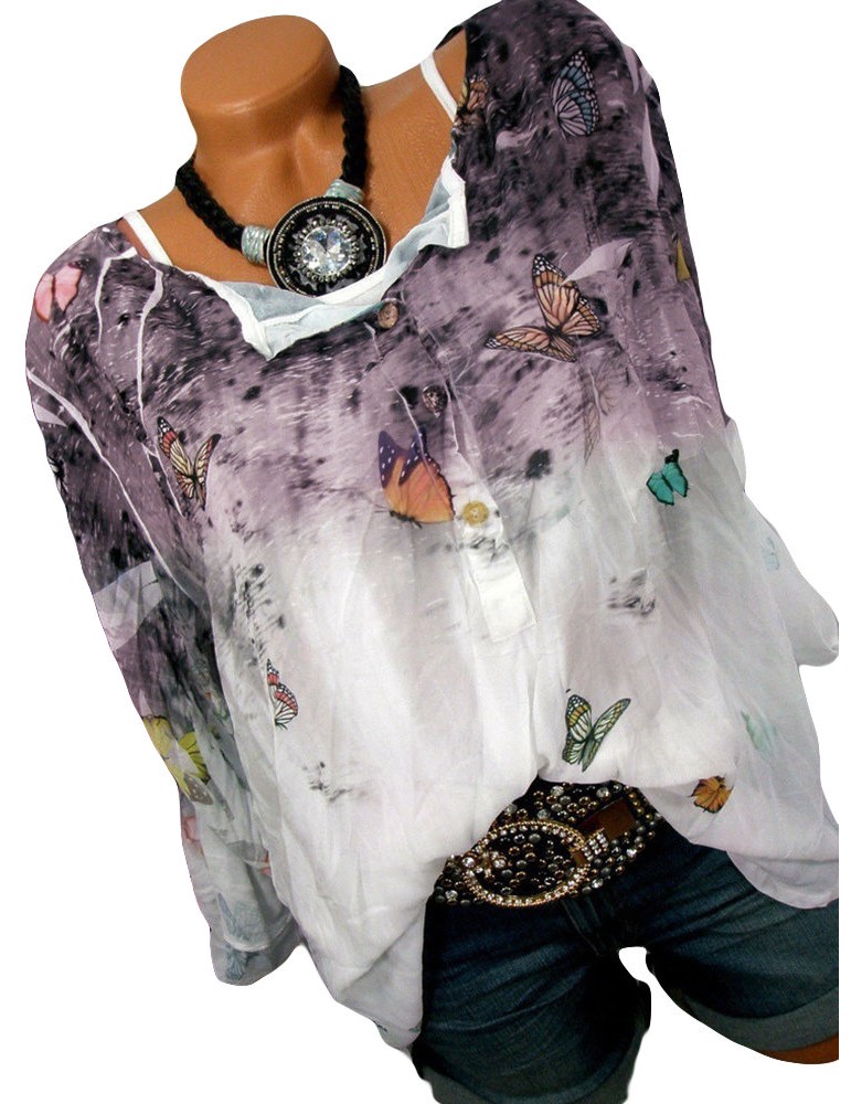 Printed Butterfly Tie Dye Notched Neck Long Sleeve Shirts