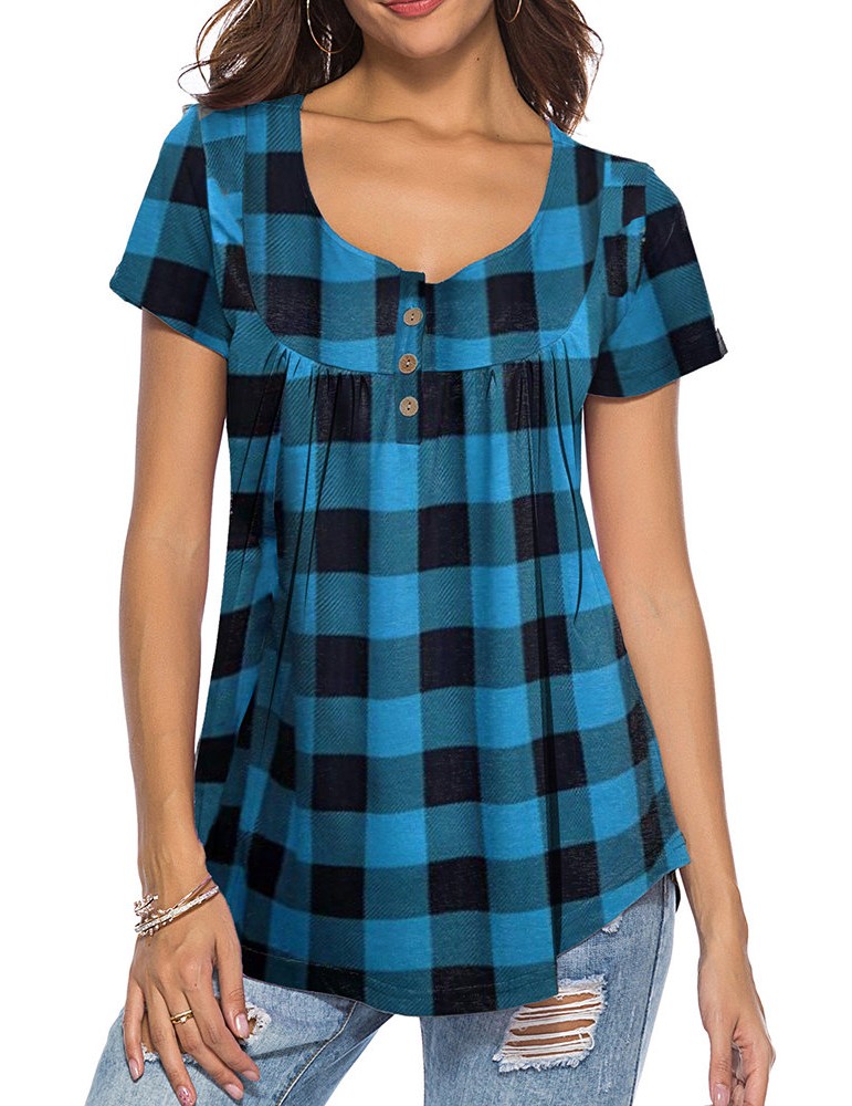 Ethnic Plaid Print Irregular Short Sleeve Casual Blouse