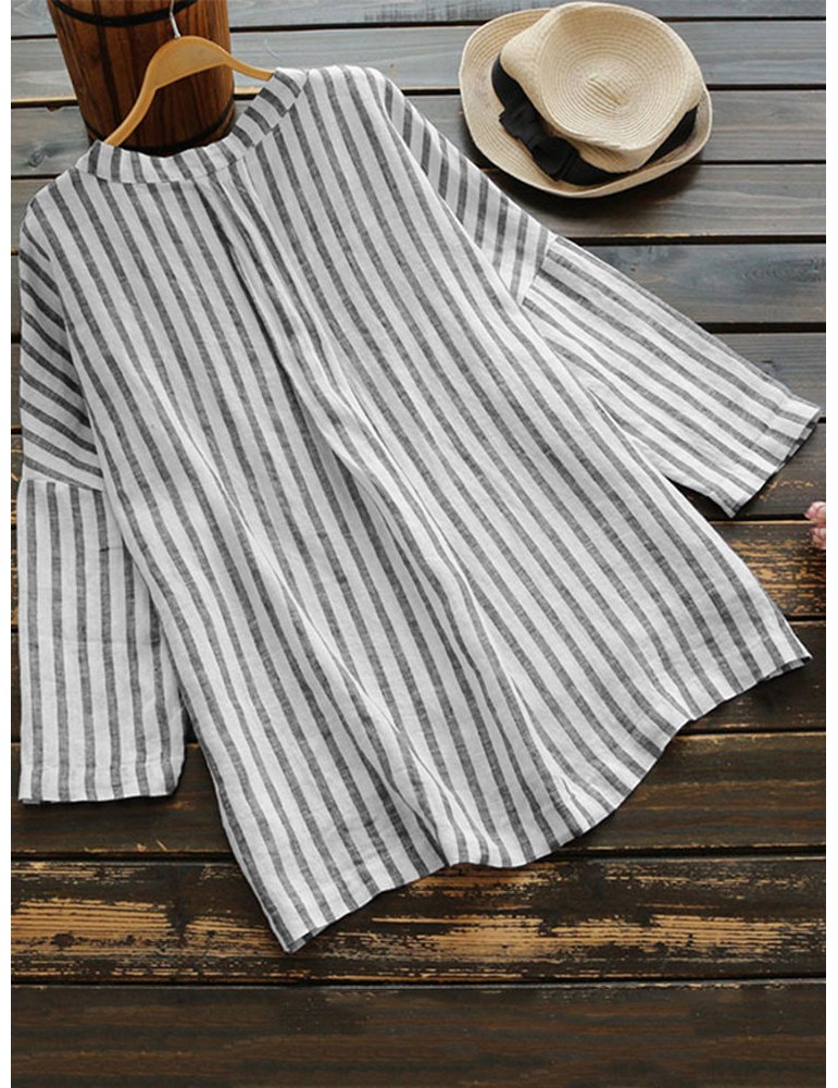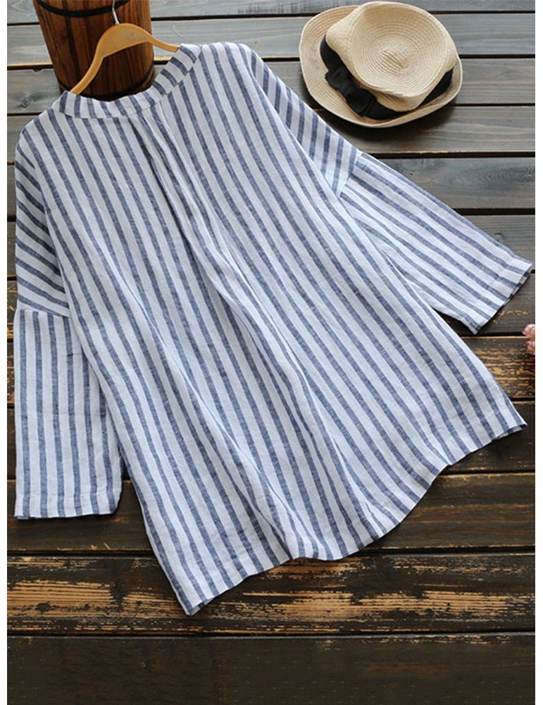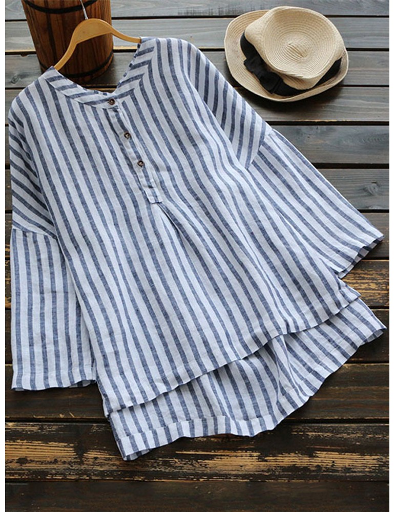 Loose Vertical Striped V neck High Low Button Shirt