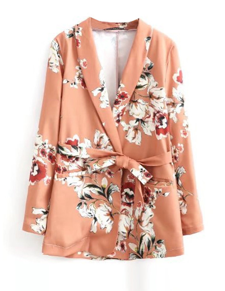 Vintage Floral Print Tie Waist Lapel Long Sleeve Women Jackets