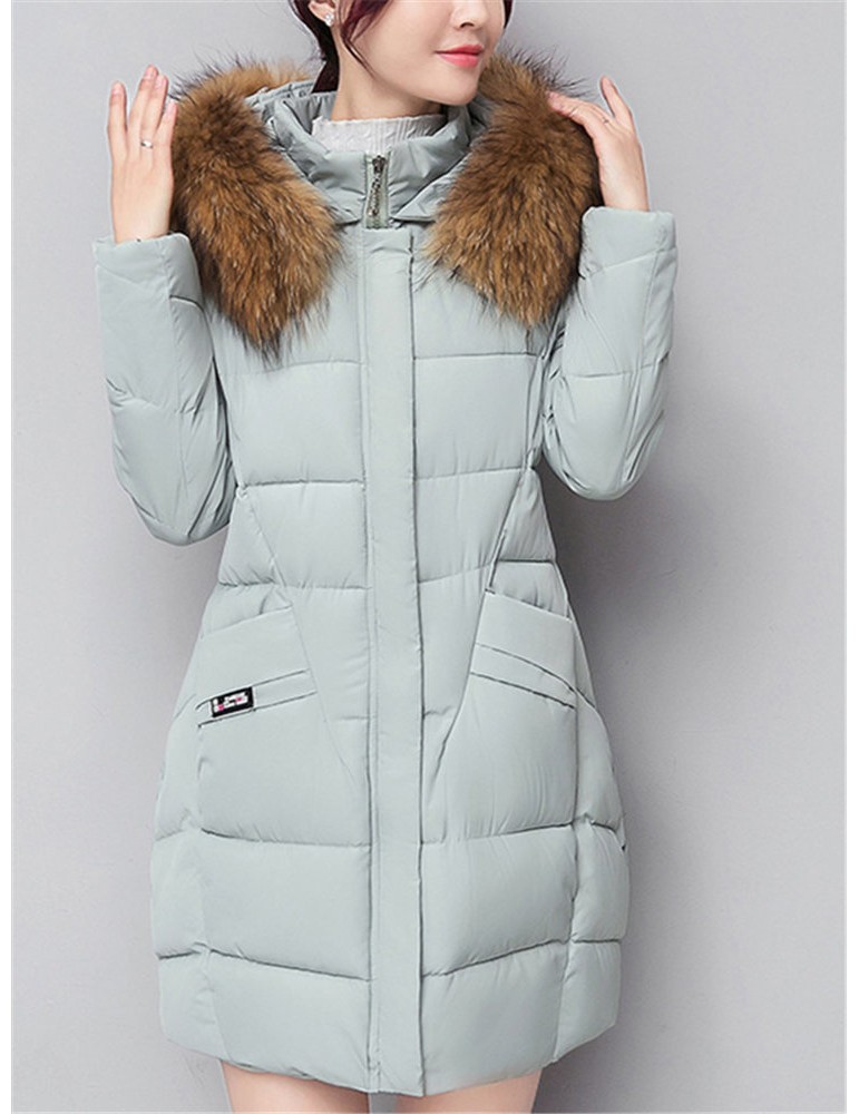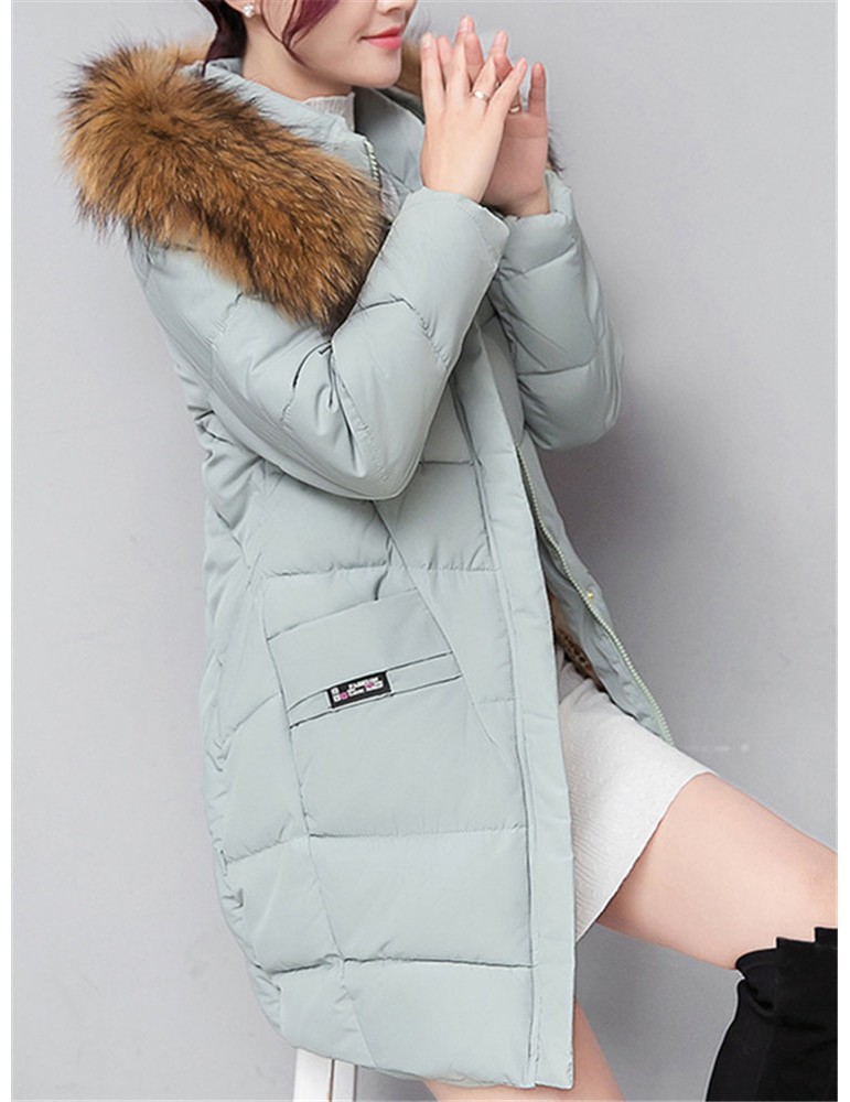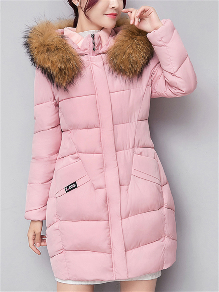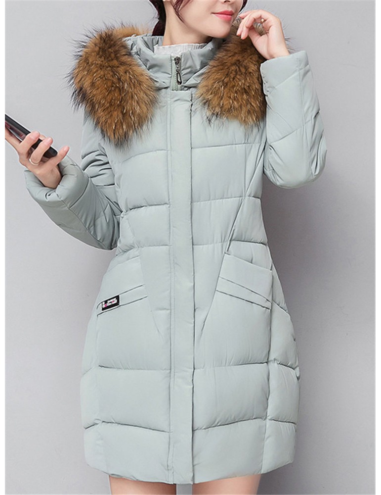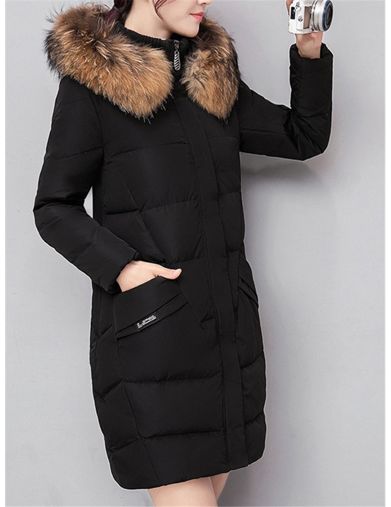 Solid Color Hooded Fur Collar Thicken Warm Long Coat