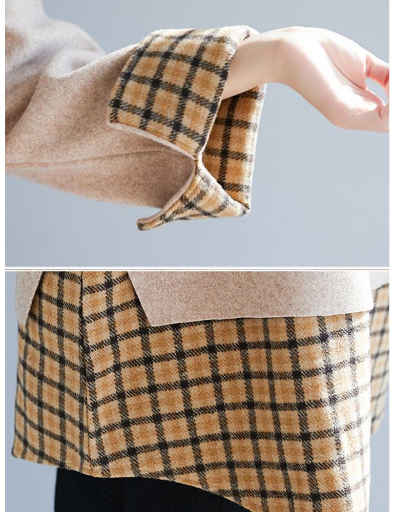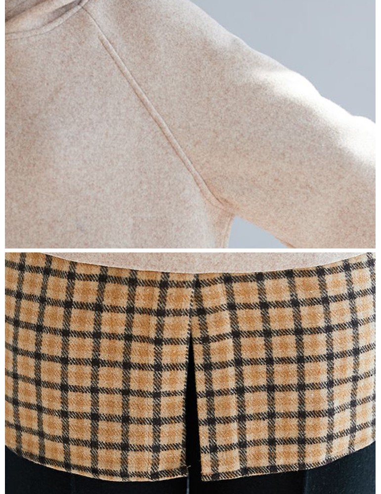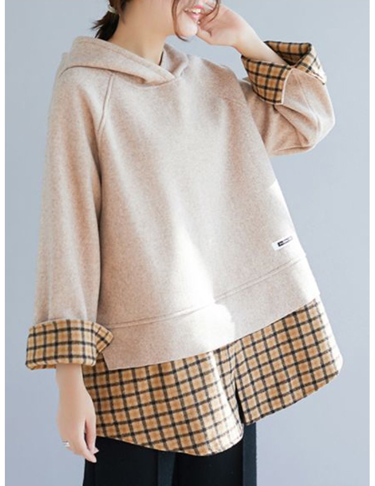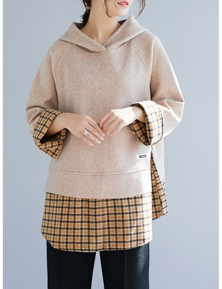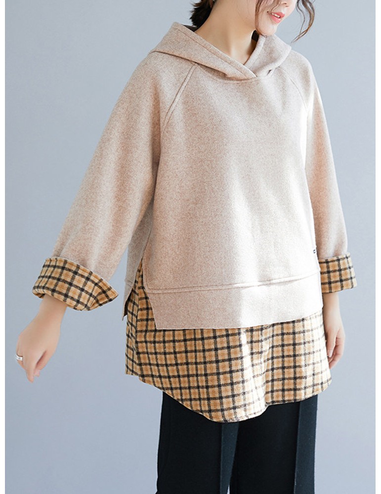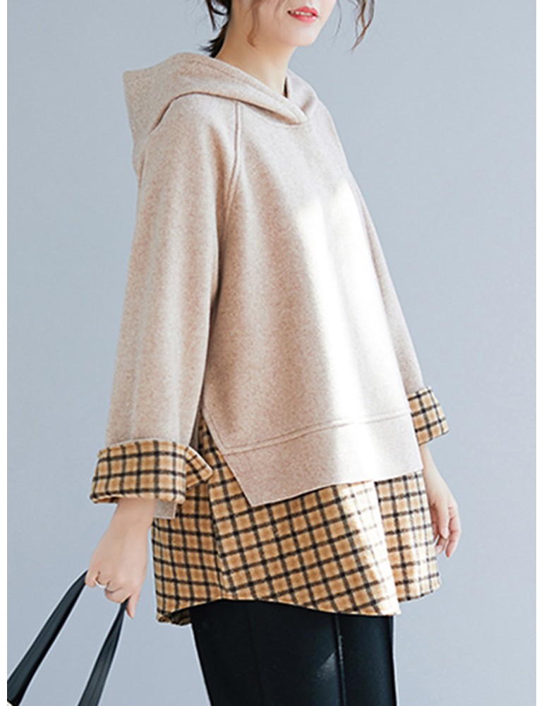 Patchwork Plaid Fake Two Piece Hooded Sweatshirt