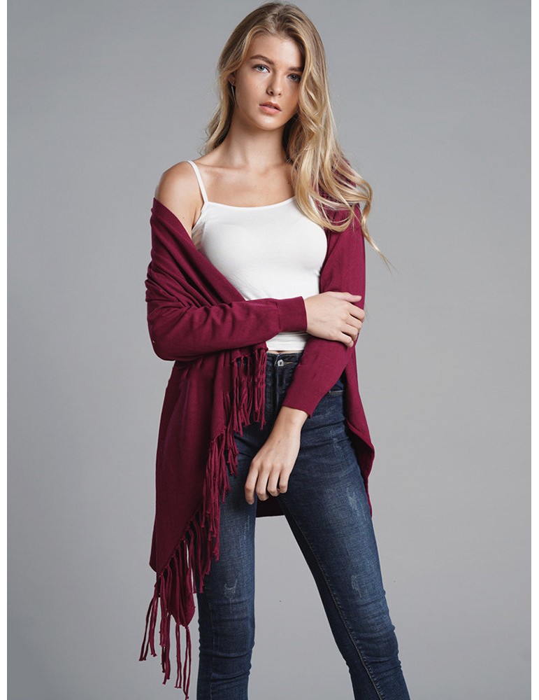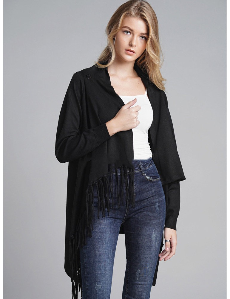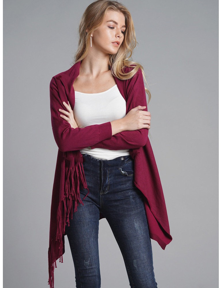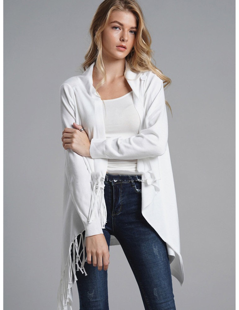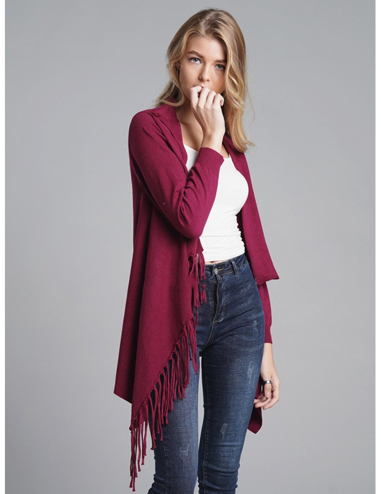 Fringed Knit Solid Color Mid Length Cardigan
