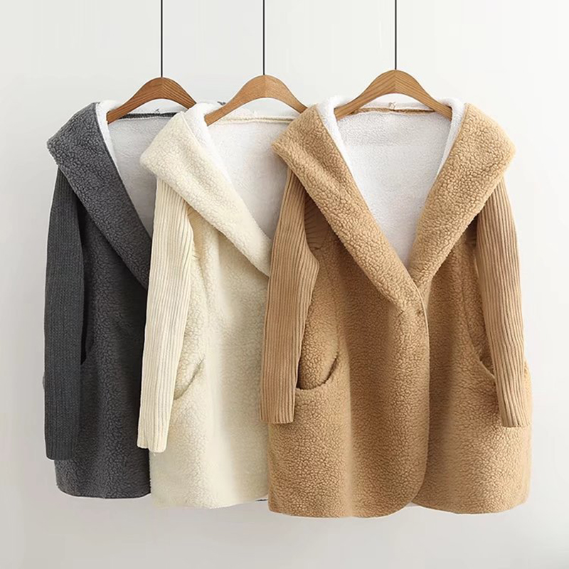 Casual Pure Color Hooded Patchwork Long Sleeve Women Plush Coats