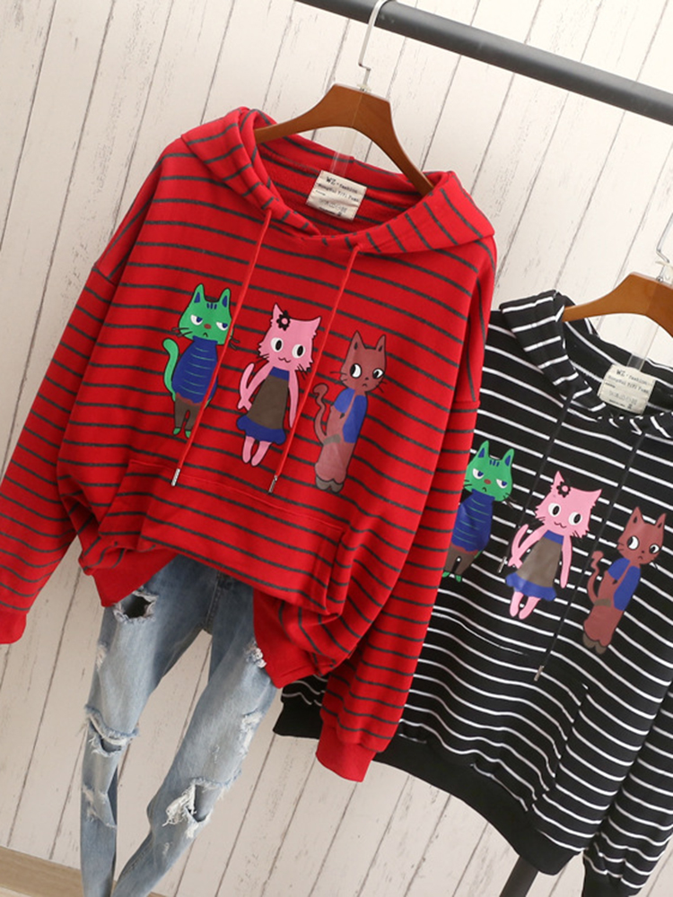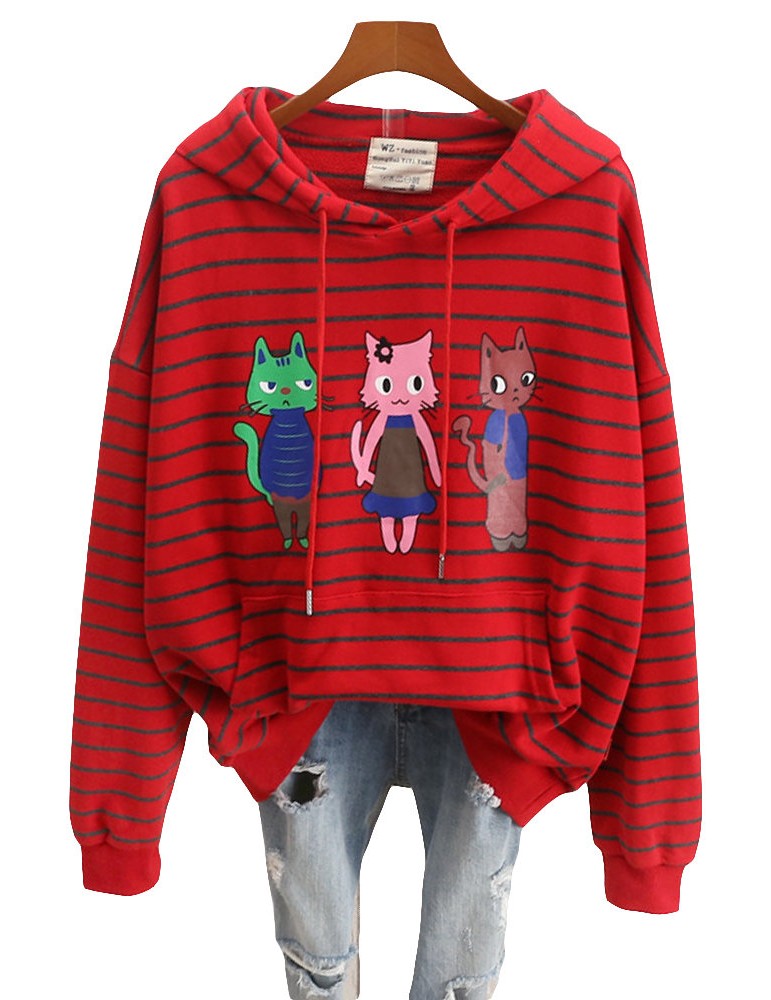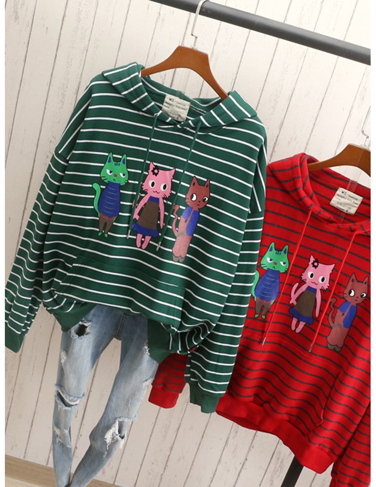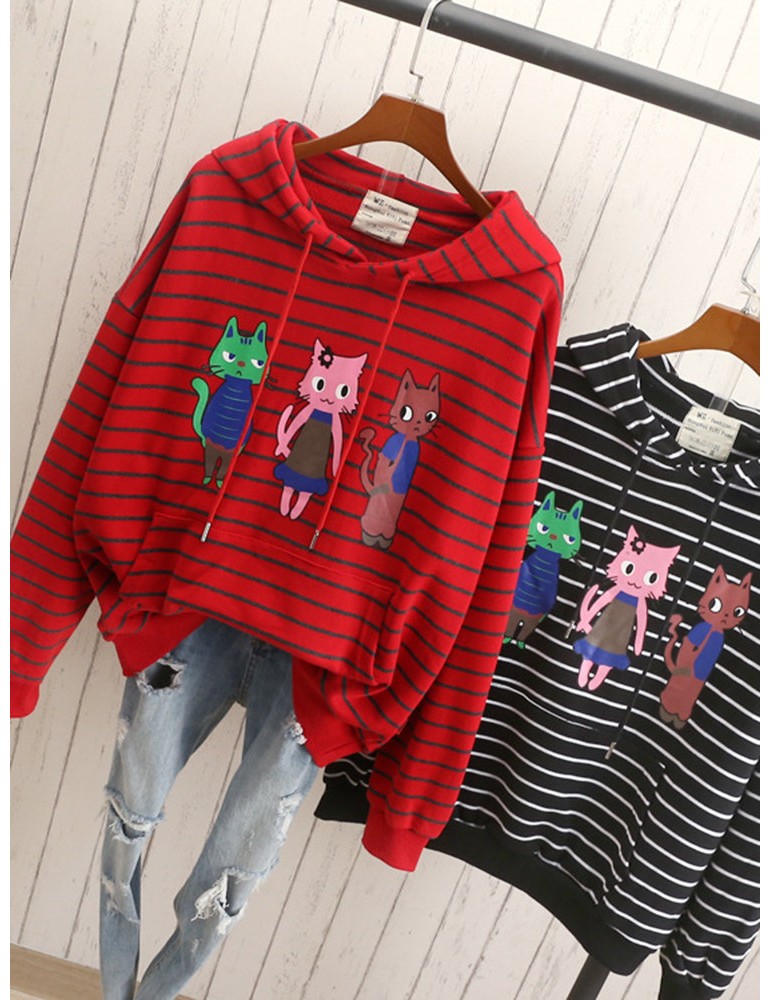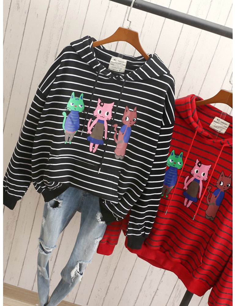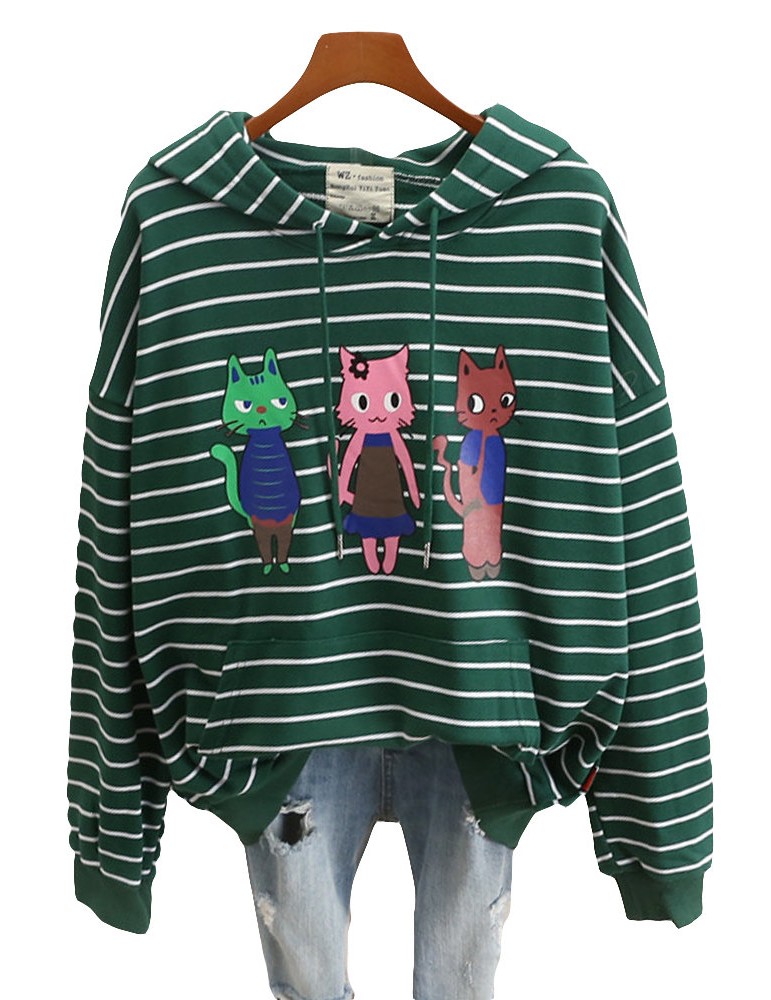 Cats Printed Striped Hooded Casual Sweatshirt