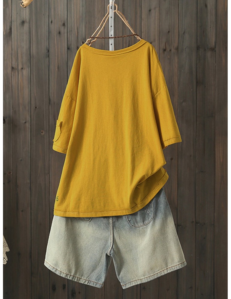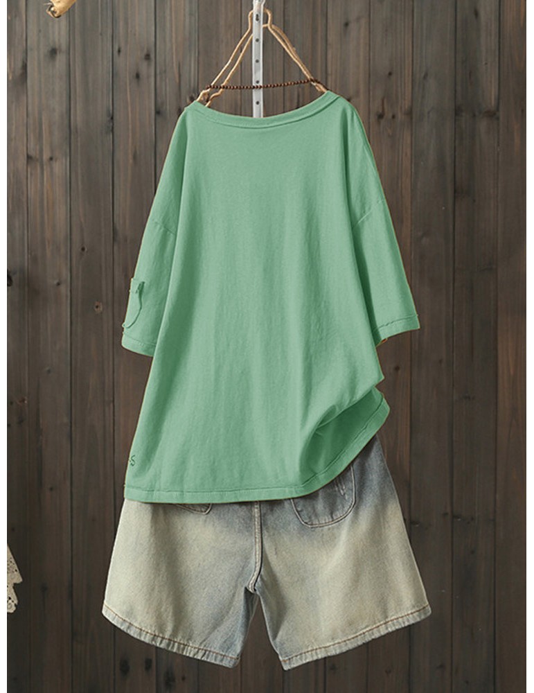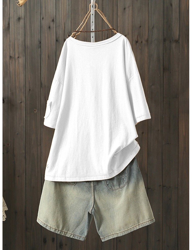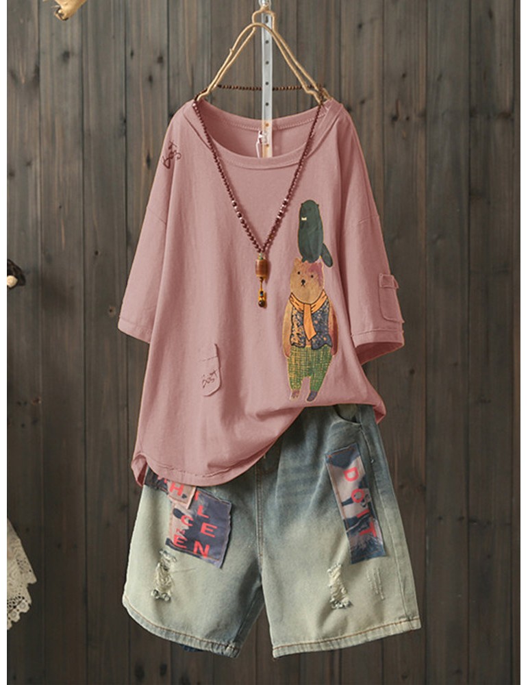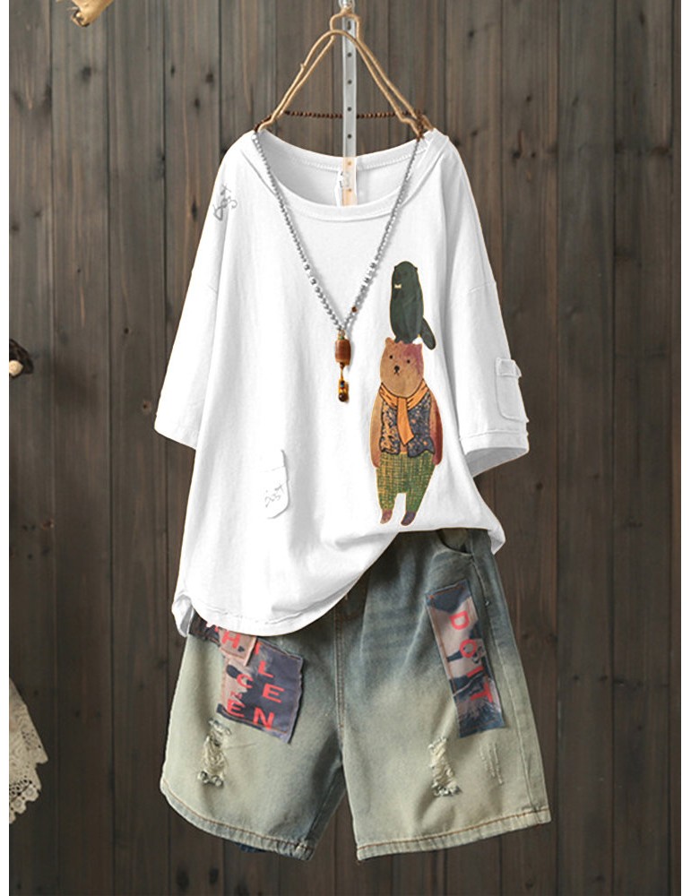 Casual Cartoon Print Patch Short Sleeve Plus Size T-Shirt