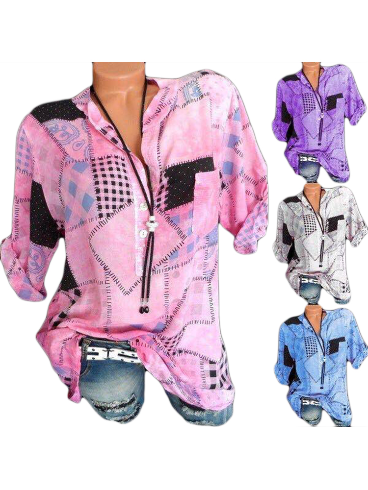 Printed Patchwork V-neck Long Sleeve Casual Blouses