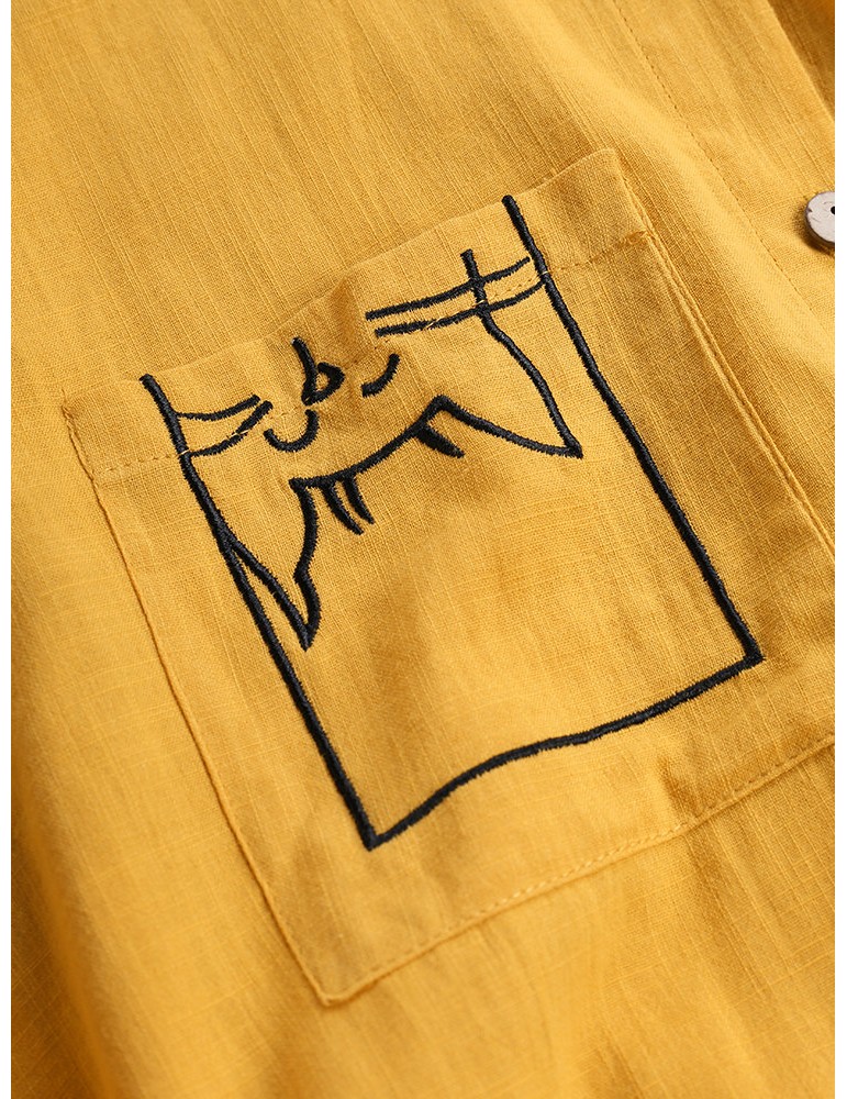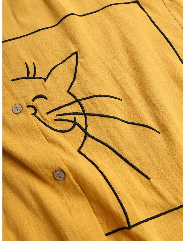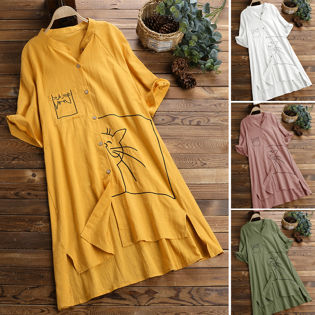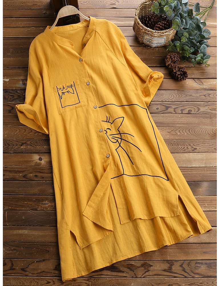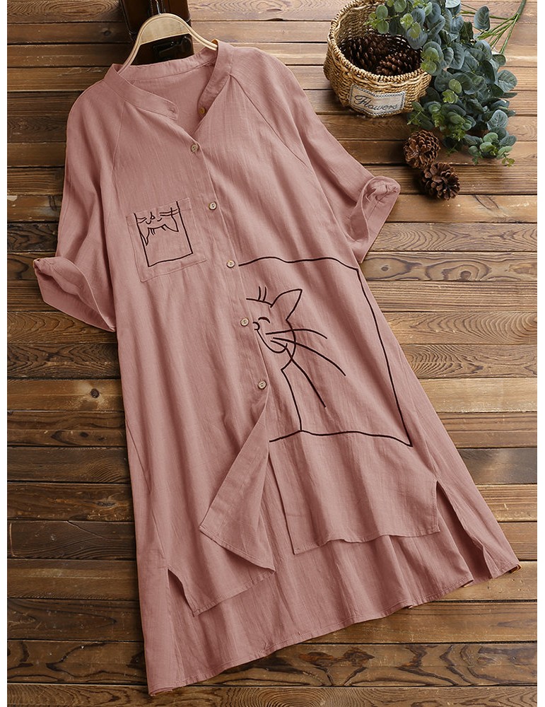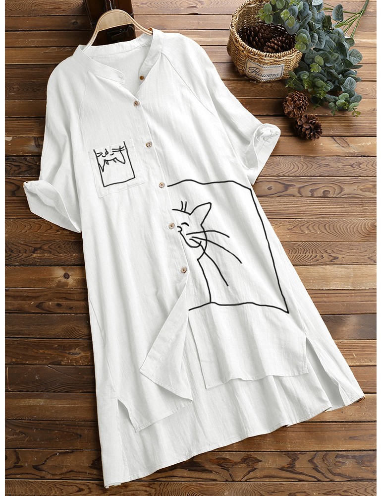 Cartoon Cat Print Split Irregular Half Sleeve Plus Size Shirt