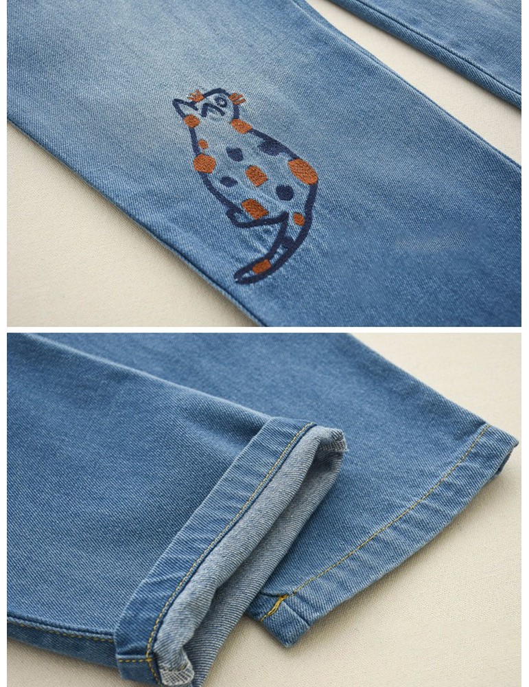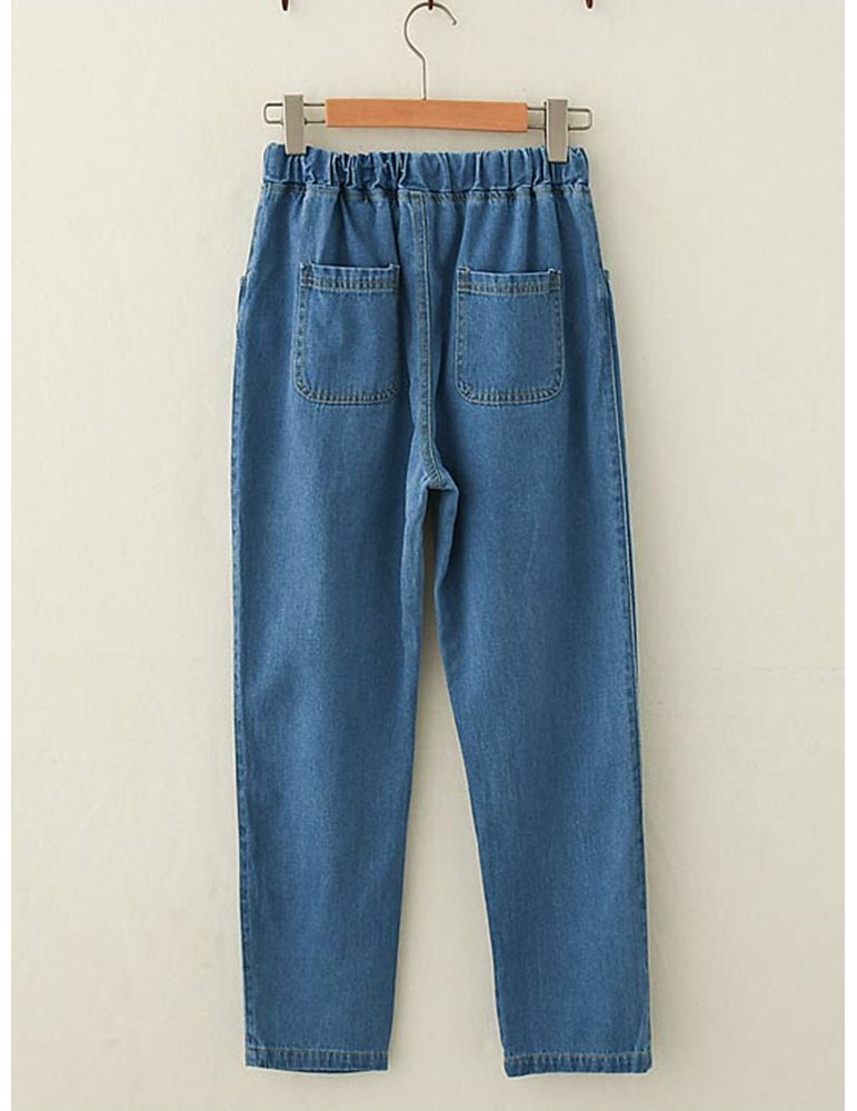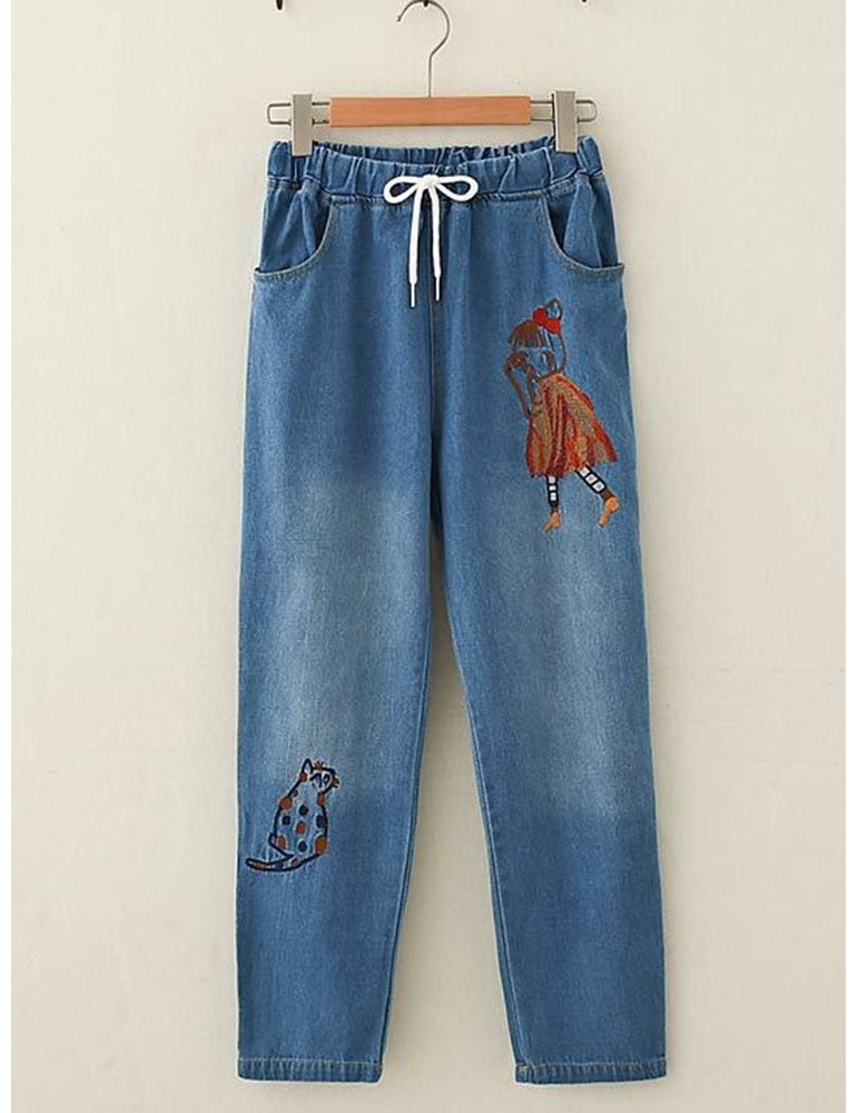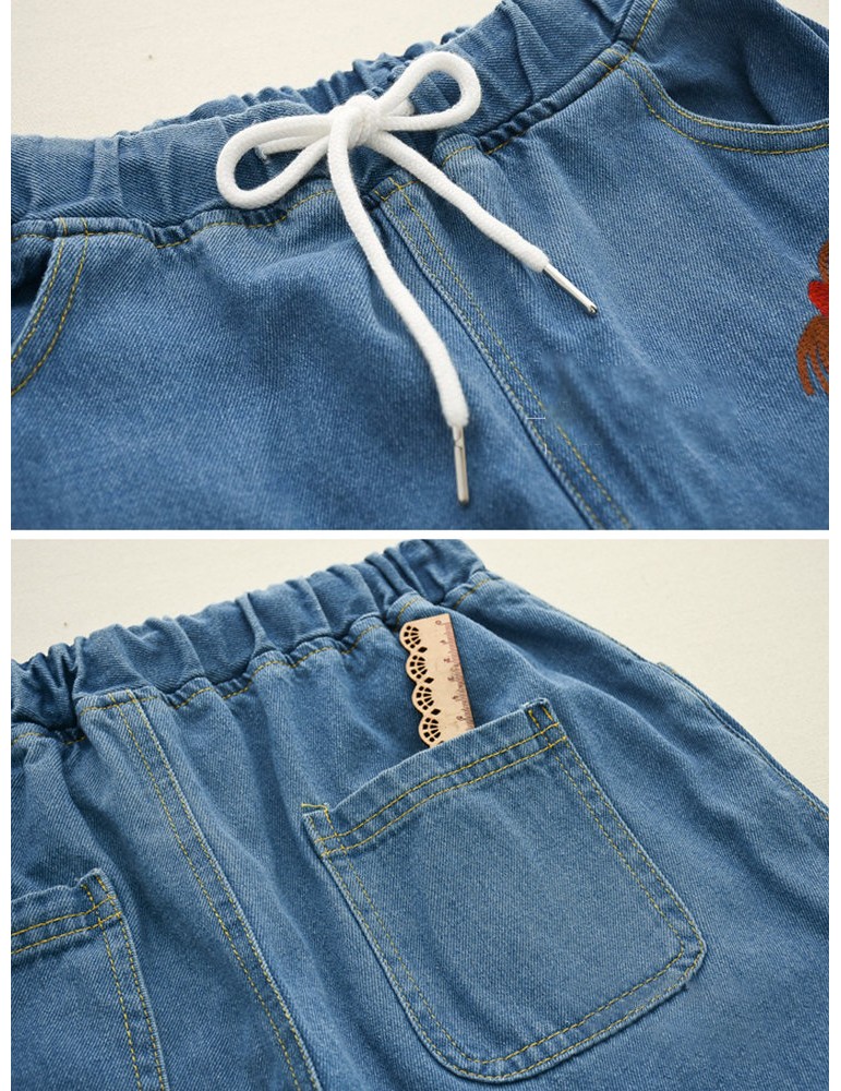 Cute Embroidery Elastic Waist Drawstring Denim Pants