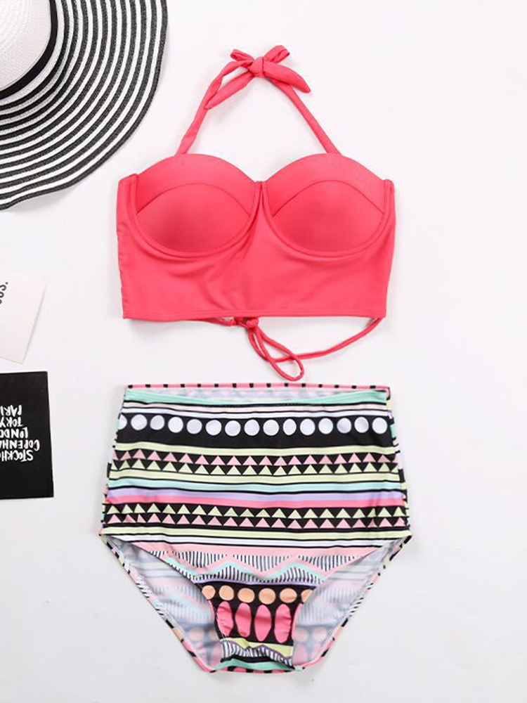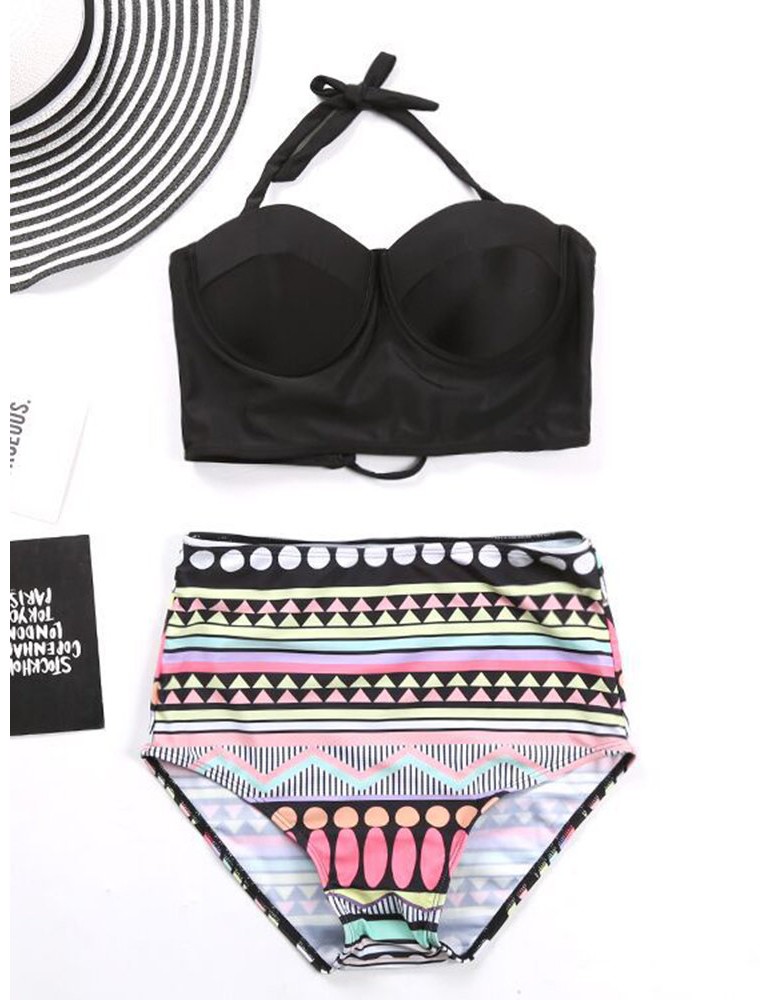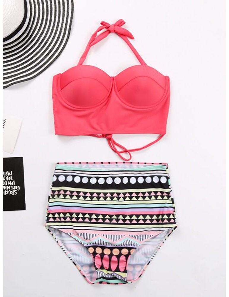 Push Up Printed Vintage Halter String Backless Bikinis Swimsuits For Women