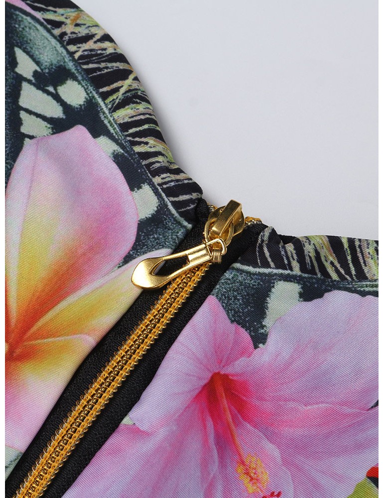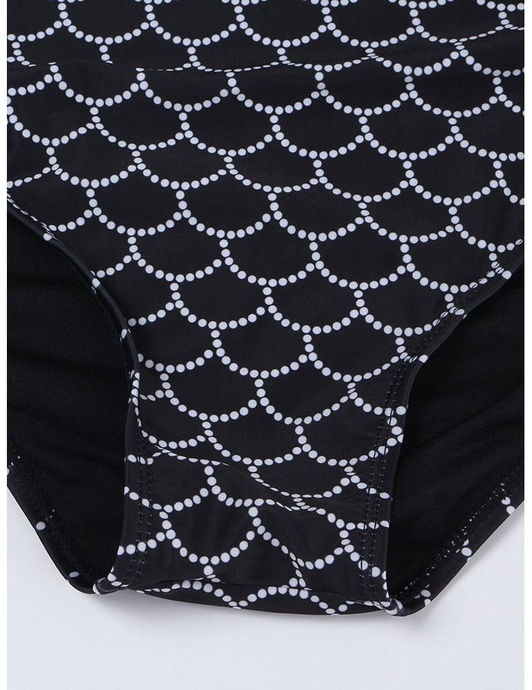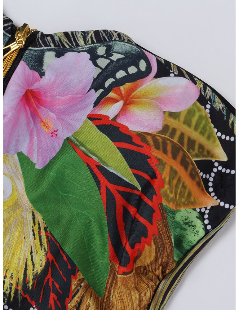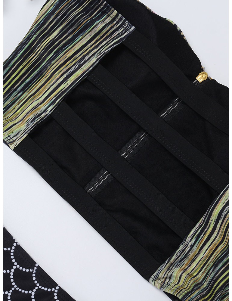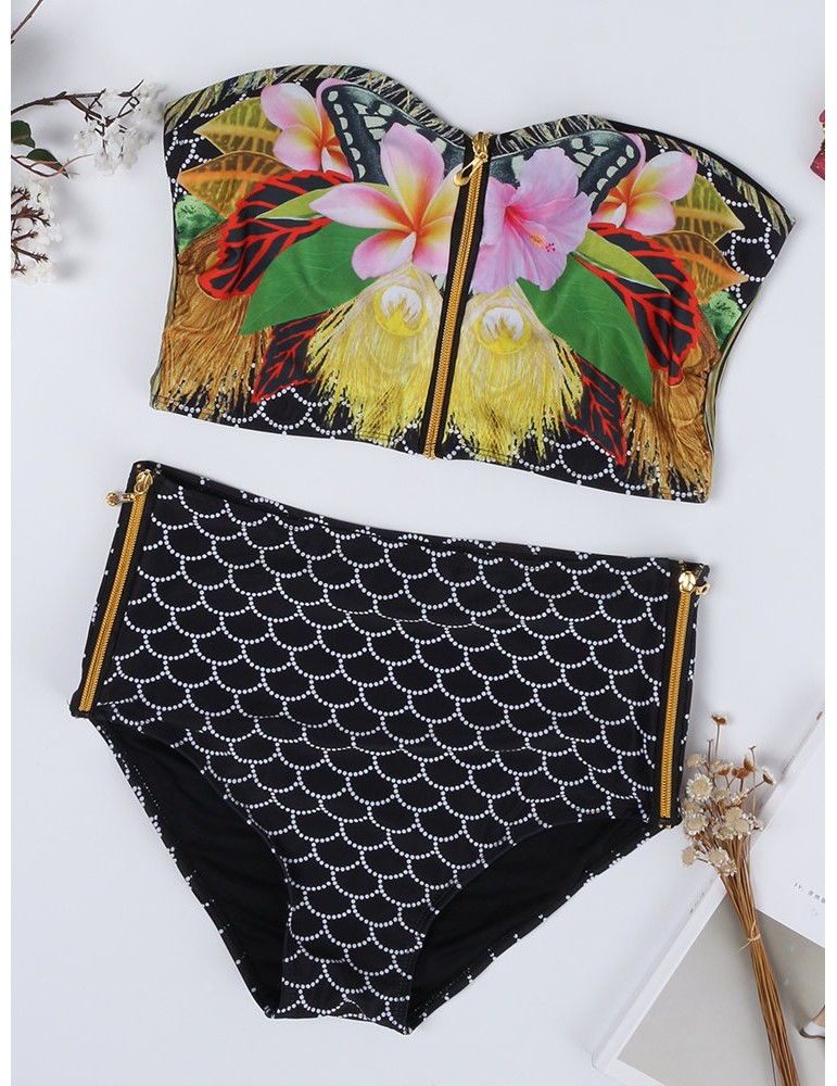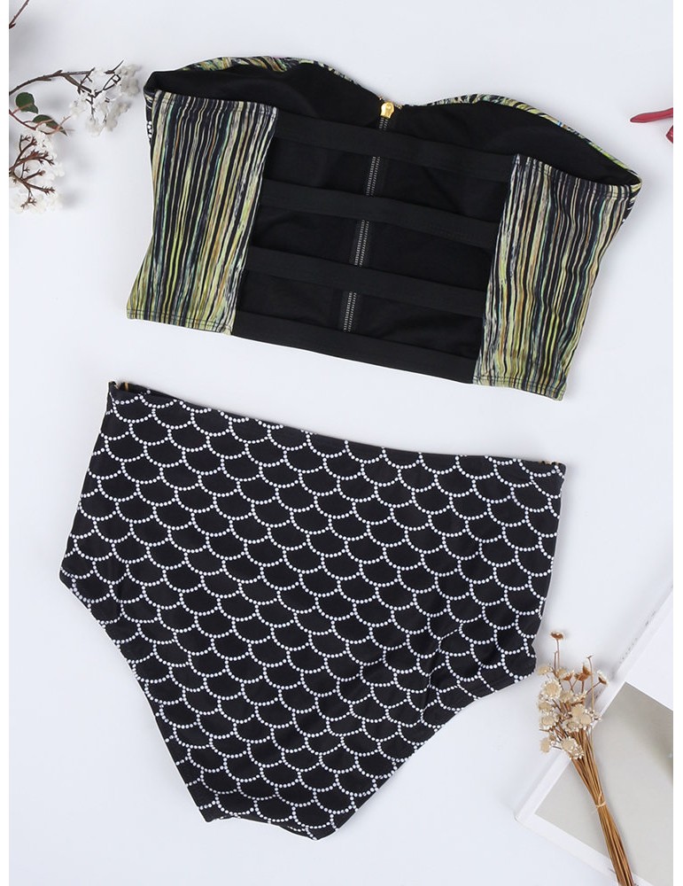 Front Zipper Fish Scale Plant Printing High Waist Strapless Tankinis Swimsuits For Women