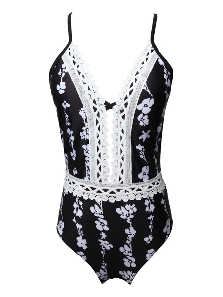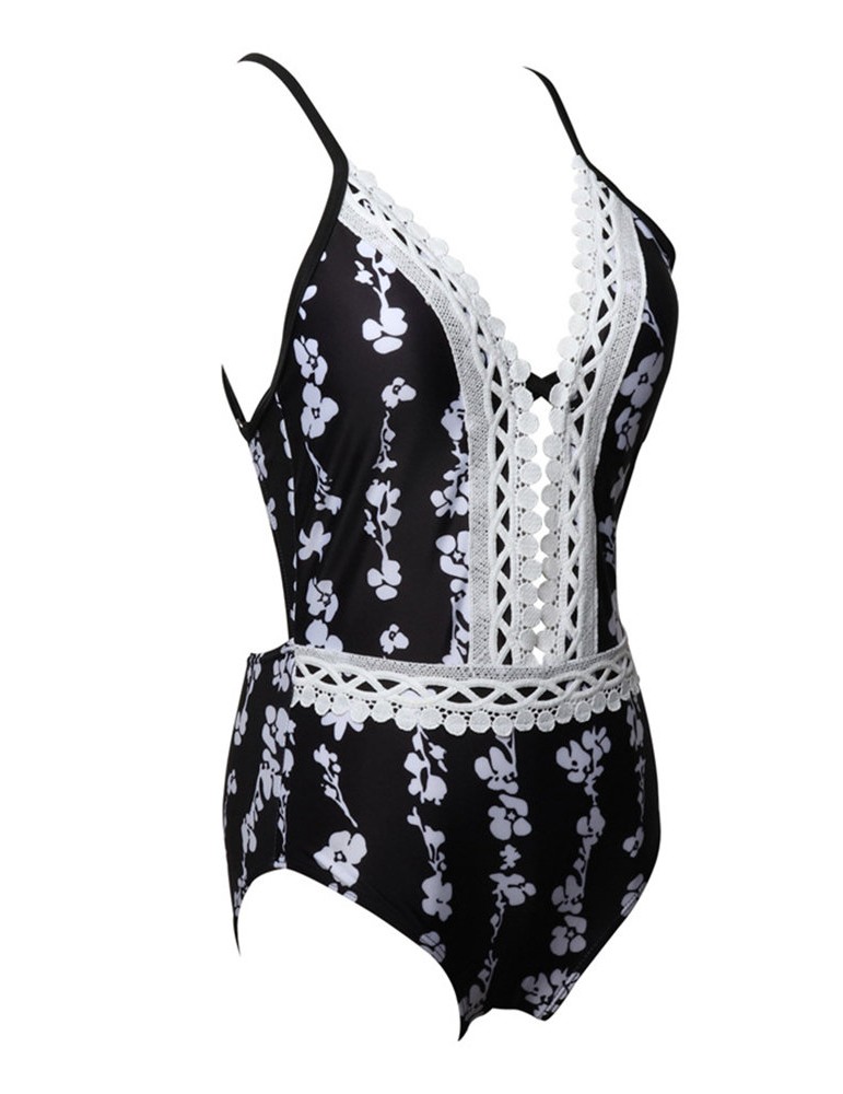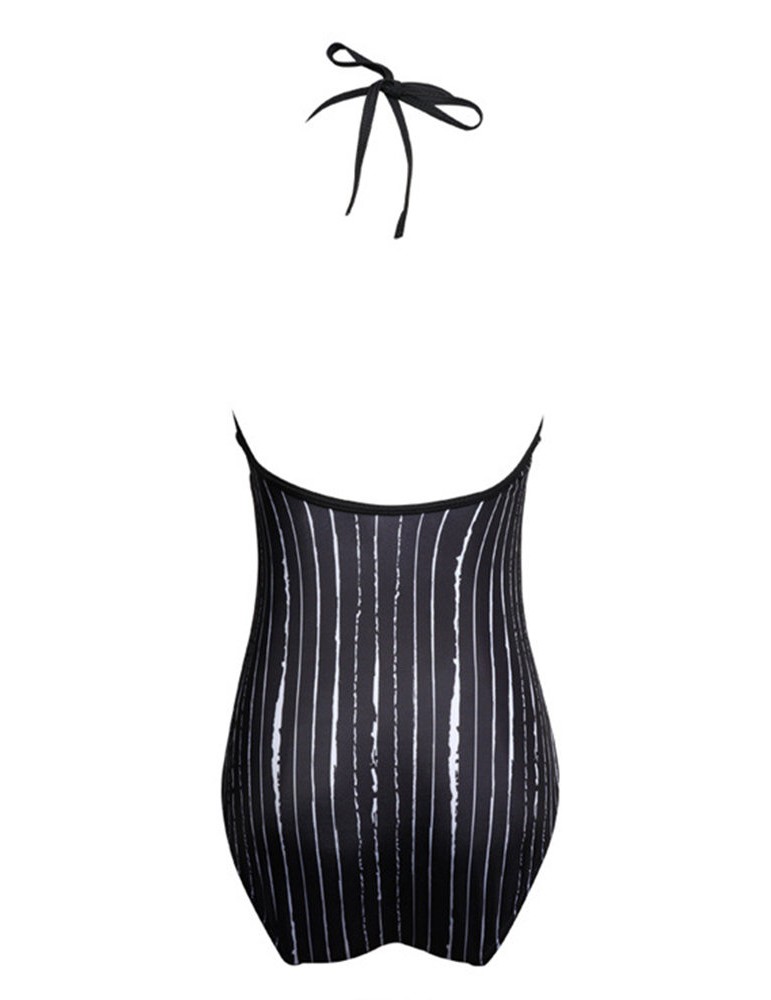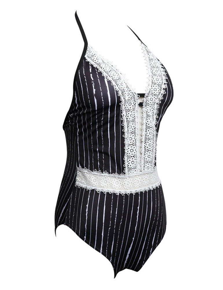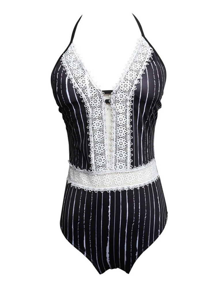 Sexy Backless Lace Printed Striped One Piece Swimsuit For Women